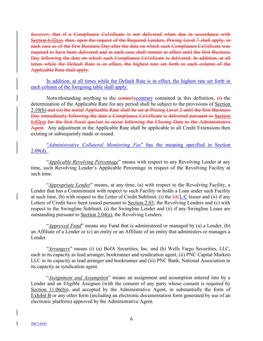 however, that if a Compliance Ce1iificate is not delivered when due in accordance with Section 6.02(a), then, upon the request of the Required Lenders, Pricing Level 7 shall apply, in each case as of the first Business Day after the date on which such Compliance Ce1iificate was required to have been delivered and in each case shall remain in effect until the first Business Day following the date on which such Compliance Ce1iificate is delivered. In addition, at all times while the Default Rate is in effect, the highest rate set forth in each column of the Applicable Rate shall apply. In addition, at all times while the Default Rate is in effect, the highest rate set forth in each column of the foregoing table shall apply. Notwithstanding anything to the contra1ycontrary contained in this definition, (i) the determination of the Applicable Rate for any period shall be subject to the provisions of Section 2.10(b) and (ii) the initial Applicable Rate shall be set at Pricing Level 2 until the first Business Day immediately following the date a Compliance Ce1iificate is delivered pursuant to Section 6.02(a) for the first fiscal qua1ier to occur following the Closing Date to the Administrative Agent. Any adjustment in the Applicable Rate shall be applicable to all Credit Extensions then existing or subsequently made or issued. “Administrative Collateral Monitoring Fee” has the meaning specified in Section 2.09(d). “Applicable Revolving Percentage” means with respect to any Revolving Lender at any time, such Revolving Lender’s Applicable Percentage in respect of the Revolving Facility at such time. “Appropriate Lender” means, at any time, (a) with respect to the Revolving Facility, a Lender that has a Commitment with respect to such Facility or holds a Loan under such Facility at such time, (b) with respect to the Letter of Credit Sublimit, (i) the UCL/C Issuer and (ii) if any Letters of Credit have been issued pursuant to Section 2.03, the Revolving Lenders and (c) with respect to the Swingline Sublimit, (i) the Swingline Lender and (ii) if any Swingline Loans are outstanding pursuant to Section 2.04(a), the Revolving Lenders. “Approved Fund” means any Fund that is administered or managed by (a) a Lender, (b) an Affiliate of a Lender or (c) an entity or an Affiliate of an entity that administers or manages a Lender. “Arrangers” means (i) (a) BofA Securities, Inc. and (b) Wells Fargo Securities, LLC, each in its capacity as lead arranger, bookrunner and syndication agent, (ii) PNC Capital Markets LLC in its capacity as lead arranger and bookrunner and (iii) PNC Bank, National Association in its capacity as syndication agent. “Assignment and Assumption” means an assignment and assumption entered into by a Lender and an Eligible Assignee (with the consent of any party whose consent is required by Section 11.06(b)), and accepted by the Administrative Agent, in substantially the form of Exhibit B or any other form (including an electronic documentation form generated by use of an electronic platform) approved by the Administrative Agent. 6 206718545