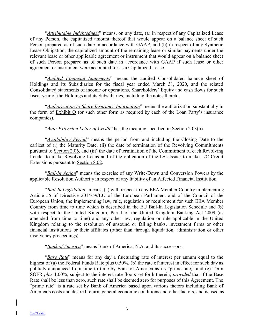 “Attributable Indebtedness” means, on any date, (a) in respect of any Capitalized Lease of any Person, the capitalized amount thereof that would appear on a balance sheet of such Person prepared as of such date in accordance with GAAP, and (b) in respect of any Synthetic Lease Obligation, the capitalized amount of the remaining lease or similar payments under the relevant lease or other applicable agreement or instrument that would appear on a balance sheet of such Person prepared as of such date in accordance with GAAP if such lease or other agreement or instrument were accounted for as a Capitalized Lease. “Audited Financial Statements” means the audited Consolidated balance sheet of Holdings and its Subsidiaries for the fiscal year ended March 31, 2020, and the related Consolidated statements of income or operations, Shareholders’ Equity and cash flows for such fiscal year of the Holdings and its Subsidiaries, including the notes thereto. “Authorization to Share Insurance Information” means the authorization substantially in the form of Exhibit O (or such other form as required by each of the Loan Party’s insurance companies). “Auto-Extension Letter of Credit” has the meaning specified in Section 2.03(b). “Availability Period” means the period from and including the Closing Date to the earliest of (i) the Maturity Date, (ii) the date of termination of the Revolving Commitments pursuant to Section 2.06, and (iii) the date of termination of the Commitment of each Revolving Lender to make Revolving Loans and of the obligation of the L/C Issuer to make L/C Credit Extensions pursuant to Section 8.02. “Bail-In Action” means the exercise of any Write-Down and Conversion Powers by the applicable Resolution Authority in respect of any liability of an Affected Financial Institution. “Bail-In Legislation” means, (a) with respect to any EEA Member Country implementing Article 55 of Directive 2014/59/EU of the European Parliament and of the Council of the European Union, the implementing law, rule, regulation or requirement for such EEA Member Country from time to time which is described in the EU Bail-In Legislation Schedule and (b) with respect to the United Kingdom, Part I of the United Kingdom Banking Act 2009 (as amended from time to time) and any other law, regulation or rule applicable in the United Kingdom relating to the resolution of unsound or failing banks, investment firms or other financial institutions or their affiliates (other than through liquidation, administration or other insolvency proceedings). “Bank of America” means Bank of America, N.A. and its successors. “Base Rate” means for any day a fluctuating rate of interest per annum equal to the highest of (a) the Federal Funds Rate plus 0.50%, (b) the rate of interest in effect for such day as publicly announced from time to time by Bank of America as its “prime rate,” and (c) Term SOFR plus 1.00%, subject to the interest rate floors set forth therein; provided that if the Base Rate shall be less than zero, such rate shall be deemed zero for purposes of this Agreement. The “prime rate” is a rate set by Bank of America based upon various factors including Bank of America’s costs and desired return, general economic conditions and other factors, and is used as 7 206718545