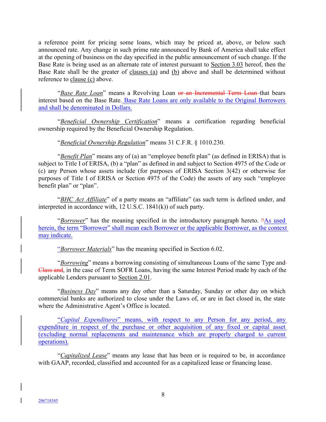 a reference point for pricing some loans, which may be priced at, above, or below such announced rate. Any change in such prime rate announced by Bank of America shall take effect at the opening of business on the day specified in the public announcement of such change. If the Base Rate is being used as an alternate rate of interest pursuant to Section 3.03 hereof, then the Base Rate shall be the greater of clauses (a) and (b) above and shall be determined without reference to clause (c) above. “Base Rate Loan” means a Revolving Loan or an Incremental Term Loan that bears interest based on the Base Rate. Base Rate Loans are only available to the Original Borrowers and shall be denominated in Dollars. “Beneficial Ownership Certification” means a certification regarding beneficial ownership required by the Beneficial Ownership Regulation. “Beneficial Ownership Regulation” means 31 C.F.R. § 1010.230. “Benefit Plan” means any of (a) an “employee benefit plan” (as defined in ERISA) that is subject to Title I of ERISA, (b) a “plan” as defined in and subject to Section 4975 of the Code or (c) any Person whose assets include (for purposes of ERISA Section 3(42) or otherwise for purposes of Title I of ERISA or Section 4975 of the Code) the assets of any such “employee benefit plan” or “plan”. “BHC Act Affiliate” of a party means an “affiliate” (as such term is defined under, and interpreted in accordance with, 12 U.S.C. 1841(k)) of such party. “Borrower” has the meaning specified in the introductory paragraph hereto. “As used herein, the term “Borrower” shall mean each Borrower or the applicable Borrower, as the context may indicate. “Borrower Materials” has the meaning specified in Section 6.02. “Borrowing” means a borrowing consisting of simultaneous Loans of the same Type and Class and, in the case of Term SOFR Loans, having the same Interest Period made by each of the applicable Lenders pursuant to Section 2.01. “Business Day” means any day other than a Saturday, Sunday or other day on which commercial banks are authorized to close under the Laws of, or are in fact closed in, the state where the Administrative Agent’s Office is located. “Capital Expenditures” means, with respect to any Person for any period, any expenditure in respect of the purchase or other acquisition of any fixed or capital asset (excluding normal replacements and maintenance which are properly charged to current operations). “Capitalized Lease” means any lease that has been or is required to be, in accordance with GAAP, recorded, classified and accounted for as a capitalized lease or financing lease. 8 206718545