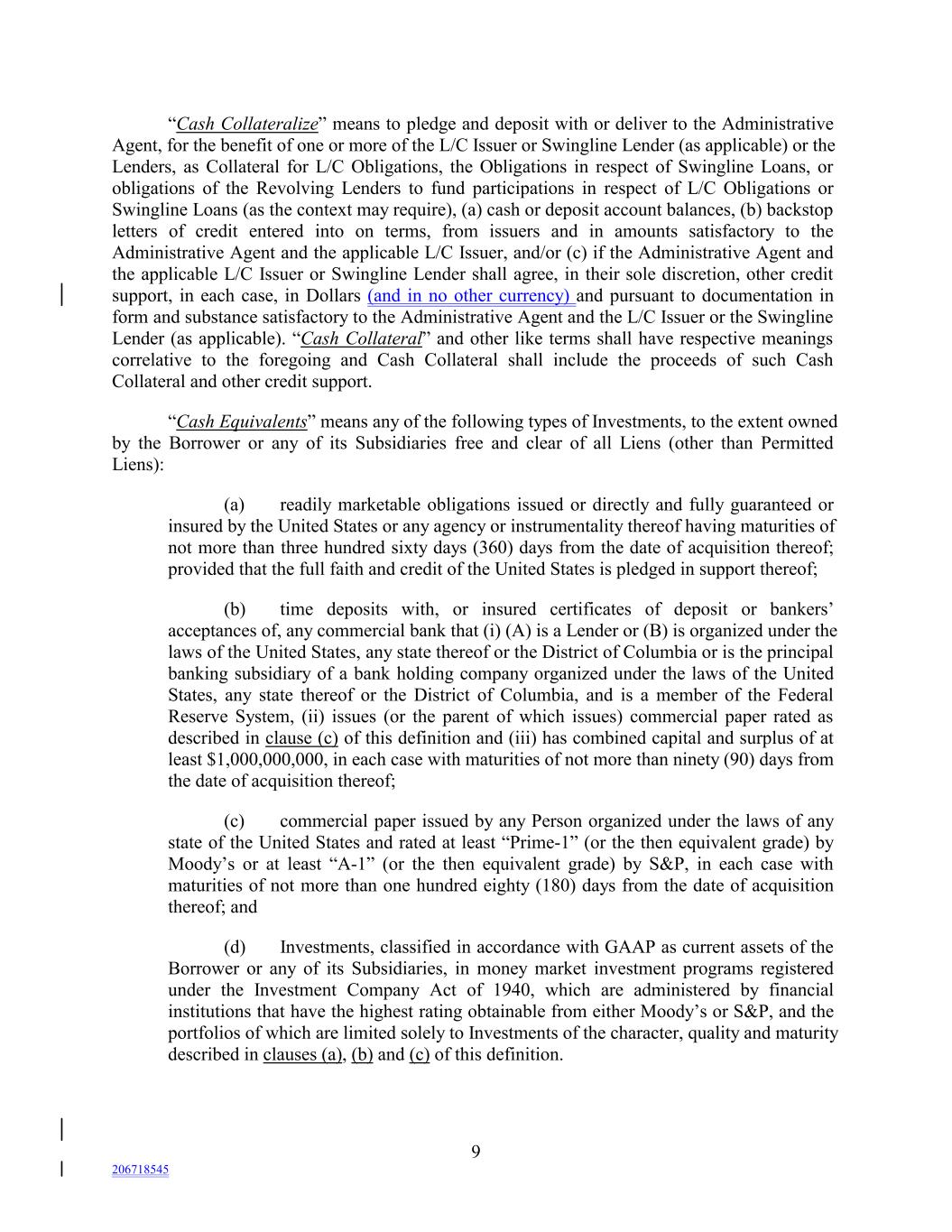 “Cash Collateralize” means to pledge and deposit with or deliver to the Administrative Agent, for the benefit of one or more of the L/C Issuer or Swingline Lender (as applicable) or the Lenders, as Collateral for L/C Obligations, the Obligations in respect of Swingline Loans, or obligations of the Revolving Lenders to fund participations in respect of L/C Obligations or Swingline Loans (as the context may require), (a) cash or deposit account balances, (b) backstop letters of credit entered into on terms, from issuers and in amounts satisfactory to the Administrative Agent and the applicable L/C Issuer, and/or (c) if the Administrative Agent and the applicable L/C Issuer or Swingline Lender shall agree, in their sole discretion, other credit support, in each case, in Dollars (and in no other currency) and pursuant to documentation in form and substance satisfactory to the Administrative Agent and the L/C Issuer or the Swingline Lender (as applicable). “Cash Collateral” and other like terms shall have respective meanings correlative to the foregoing and Cash Collateral shall include the proceeds of such Cash Collateral and other credit support. “Cash Equivalents” means any of the following types of Investments, to the extent owned by the Borrower or any of its Subsidiaries free and clear of all Liens (other than Permitted Liens): (a) readily marketable obligations issued or directly and fully guaranteed or insured by the United States or any agency or instrumentality thereof having maturities of not more than three hundred sixty days (360) days from the date of acquisition thereof; provided that the full faith and credit of the United States is pledged in support thereof; (b) time deposits with, or insured certificates of deposit or bankers’ acceptances of, any commercial bank that (i) (A) is a Lender or (B) is organized under the laws of the United States, any state thereof or the District of Columbia or is the principal banking subsidiary of a bank holding company organized under the laws of the United States, any state thereof or the District of Columbia, and is a member of the Federal Reserve System, (ii) issues (or the parent of which issues) commercial paper rated as described in clause (c) of this definition and (iii) has combined capital and surplus of at least $1,000,000,000, in each case with maturities of not more than ninety (90) days from the date of acquisition thereof; (c) commercial paper issued by any Person organized under the laws of any state of the United States and rated at least “Prime-1” (or the then equivalent grade) by Moody’s or at least “A-1” (or the then equivalent grade) by S&P, in each case with maturities of not more than one hundred eighty (180) days from the date of acquisition thereof; and (d) Investments, classified in accordance with GAAP as current assets of the Borrower or any of its Subsidiaries, in money market investment programs registered under the Investment Company Act of 1940, which are administered by financial institutions that have the highest rating obtainable from either Moody’s or S&P, and the portfolios of which are limited solely to Investments of the character, quality and maturity described in clauses (a), (b) and (c) of this definition. 9 206718545