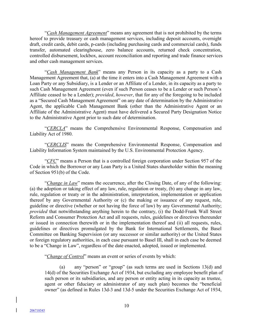“Cash Management Agreement” means any agreement that is not prohibited by the terms hereof to provide treasury or cash management services, including deposit accounts, overnight draft, credit cards, debit cards, p-cards (including purchasing cards and commercial cards), funds transfer, automated clearinghouse, zero balance accounts, returned check concentration, controlled disbursement, lockbox, account reconciliation and reporting and trade finance services and other cash management services. “Cash Management Bank” means any Person in its capacity as a party to a Cash Management Agreement that, (a) at the time it enters into a Cash Management Agreement with a Loan Party or any Subsidiary, is a Lender or an Affiliate of a Lender, in its capacity as a party to such Cash Management Agreement (even if such Person ceases to be a Lender or such Person’s Affiliate ceased to be a Lender); provided, however, that for any of the foregoing to be included as a “Secured Cash Management Agreement” on any date of determination by the Administrative Agent, the applicable Cash Management Bank (other than the Administrative Agent or an Affiliate of the Administrative Agent) must have delivered a Secured Party Designation Notice to the Administrative Agent prior to such date of determination. “CERCLA” means the Comprehensive Environmental Response, Compensation and Liability Act of 1980. “CERCLIS” means the Comprehensive Environmental Response, Compensation and Liability Information System maintained by the U.S. Environmental Protection Agency. “CFC” means a Person that is a controlled foreign corporation under Section 957 of the Code in which the Borrower or any Loan Party is a United States shareholder within the meaning of Section 951(b) of the Code. “Change in Law” means the occurrence, after the Closing Date, of any of the following: (a) the adoption or taking effect of any law, rule, regulation or treaty, (b) any change in any law, rule, regulation or treaty or in the administration, interpretation, implementation or application thereof by any Governmental Authority or (c) the making or issuance of any request, rule, guideline or directive (whether or not having the force of law) by any Governmental Authority; provided that notwithstanding anything herein to the contrary, (i) the Dodd-Frank Wall Street Reform and Consumer Protection Act and all requests, rules, guidelines or directives thereunder or issued in connection therewith or in the implementation thereof and (ii) all requests, rules, guidelines or directives promulgated by the Bank for International Settlements, the Basel Committee on Banking Supervision (or any successor or similar authority) or the United States or foreign regulatory authorities, in each case pursuant to Basel III, shall in each case be deemed to be a “Change in Law”, regardless of the date enacted, adopted, issued or implemented. “Change of Control” means an event or series of events by which: (a) any “person” or “group” (as such terms are used in Sections 13(d) and 14(d) of the Securities Exchange Act of 1934, but excluding any employee benefit plan of such person or its subsidiaries, and any person or entity acting in its capacity as trustee, agent or other fiduciary or administrator of any such plan) becomes the “beneficial owner” (as defined in Rules 13d-3 and 13d-5 under the Securities Exchange Act of 1934, 10 206718545