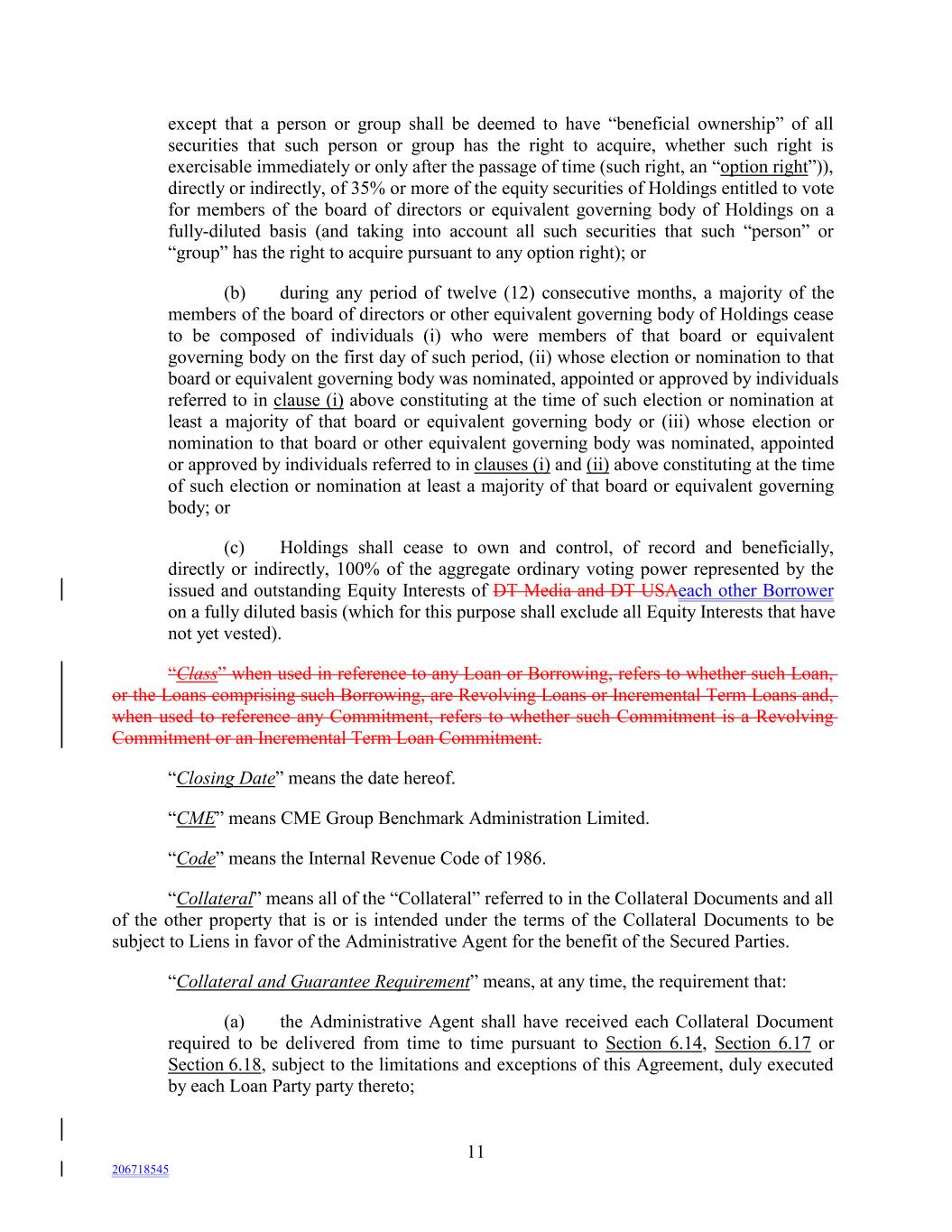 except that a person or group shall be deemed to have “beneficial ownership” of all securities that such person or group has the right to acquire, whether such right is exercisable immediately or only after the passage of time (such right, an “option right”)), directly or indirectly, of 35% or more of the equity securities of Holdings entitled to vote for members of the board of directors or equivalent governing body of Holdings on a fully-diluted basis (and taking into account all such securities that such “person” or “group” has the right to acquire pursuant to any option right); or (b) during any period of twelve (12) consecutive months, a majority of the members of the board of directors or other equivalent governing body of Holdings cease to be composed of individuals (i) who were members of that board or equivalent governing body on the first day of such period, (ii) whose election or nomination to that board or equivalent governing body was nominated, appointed or approved by individuals referred to in clause (i) above constituting at the time of such election or nomination at least a majority of that board or equivalent governing body or (iii) whose election or nomination to that board or other equivalent governing body was nominated, appointed or approved by individuals referred to in clauses (i) and (ii) above constituting at the time of such election or nomination at least a majority of that board or equivalent governing body; or (c) Holdings shall cease to own and control, of record and beneficially, directly or indirectly, 100% of the aggregate ordinary voting power represented by the issued and outstanding Equity Interests of DT Media and DT USAeach other Borrower on a fully diluted basis (which for this purpose shall exclude all Equity Interests that have not yet vested). “Class” when used in reference to any Loan or Borrowing, refers to whether such Loan, or the Loans comprising such Borrowing, are Revolving Loans or Incremental Term Loans and, when used to reference any Commitment, refers to whether such Commitment is a Revolving Commitment or an Incremental Term Loan Commitment. “Closing Date” means the date hereof. “CME” means CME Group Benchmark Administration Limited. “Code” means the Internal Revenue Code of 1986. “Collateral” means all of the “Collateral” referred to in the Collateral Documents and all of the other property that is or is intended under the terms of the Collateral Documents to be subject to Liens in favor of the Administrative Agent for the benefit of the Secured Parties. “Collateral and Guarantee Requirement” means, at any time, the requirement that: (a) the Administrative Agent shall have received each Collateral Document required to be delivered from time to time pursuant to Section 6.14, Section 6.17 or Section 6.18, subject to the limitations and exceptions of this Agreement, duly executed by each Loan Party party thereto; 11 206718545