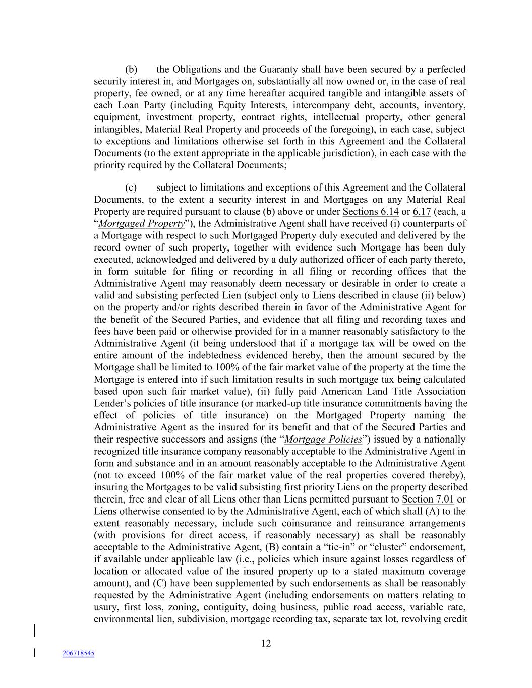(b) the Obligations and the Guaranty shall have been secured by a perfected security interest in, and Mortgages on, substantially all now owned or, in the case of real property, fee owned, or at any time hereafter acquired tangible and intangible assets of each Loan Party (including Equity Interests, intercompany debt, accounts, inventory, equipment, investment property, contract rights, intellectual property, other general intangibles, Material Real Property and proceeds of the foregoing), in each case, subject to exceptions and limitations otherwise set forth in this Agreement and the Collateral Documents (to the extent appropriate in the applicable jurisdiction), in each case with the priority required by the Collateral Documents; (c) subject to limitations and exceptions of this Agreement and the Collateral Documents, to the extent a security interest in and Mortgages on any Material Real Property are required pursuant to clause (b) above or under Sections 6.14 or 6.17 (each, a “Mortgaged Property”), the Administrative Agent shall have received (i) counterparts of a Mortgage with respect to such Mortgaged Property duly executed and delivered by the record owner of such property, together with evidence such Mortgage has been duly executed, acknowledged and delivered by a duly authorized officer of each party thereto, in form suitable for filing or recording in all filing or recording offices that the Administrative Agent may reasonably deem necessary or desirable in order to create a valid and subsisting perfected Lien (subject only to Liens described in clause (ii) below) on the property and/or rights described therein in favor of the Administrative Agent for the benefit of the Secured Parties, and evidence that all filing and recording taxes and fees have been paid or otherwise provided for in a manner reasonably satisfactory to the Administrative Agent (it being understood that if a mortgage tax will be owed on the entire amount of the indebtedness evidenced hereby, then the amount secured by the Mortgage shall be limited to 100% of the fair market value of the property at the time the Mortgage is entered into if such limitation results in such mortgage tax being calculated based upon such fair market value), (ii) fully paid American Land Title Association Lender’s policies of title insurance (or marked-up title insurance commitments having the effect of policies of title insurance) on the Mortgaged Property naming the Administrative Agent as the insured for its benefit and that of the Secured Parties and their respective successors and assigns (the “Mortgage Policies”) issued by a nationally recognized title insurance company reasonably acceptable to the Administrative Agent in form and substance and in an amount reasonably acceptable to the Administrative Agent (not to exceed 100% of the fair market value of the real properties covered thereby), insuring the Mortgages to be valid subsisting first priority Liens on the property described therein, free and clear of all Liens other than Liens permitted pursuant to Section 7.01 or Liens otherwise consented to by the Administrative Agent, each of which shall (A) to the extent reasonably necessary, include such coinsurance and reinsurance arrangements (with provisions for direct access, if reasonably necessary) as shall be reasonably acceptable to the Administrative Agent, (B) contain a “tie-in” or “cluster” endorsement, if available under applicable law (i.e., policies which insure against losses regardless of location or allocated value of the insured property up to a stated maximum coverage amount), and (C) have been supplemented by such endorsements as shall be reasonably requested by the Administrative Agent (including endorsements on matters relating to usury, first loss, zoning, contiguity, doing business, public road access, variable rate, environmental lien, subdivision, mortgage recording tax, separate tax lot, revolving credit 12 206718545
