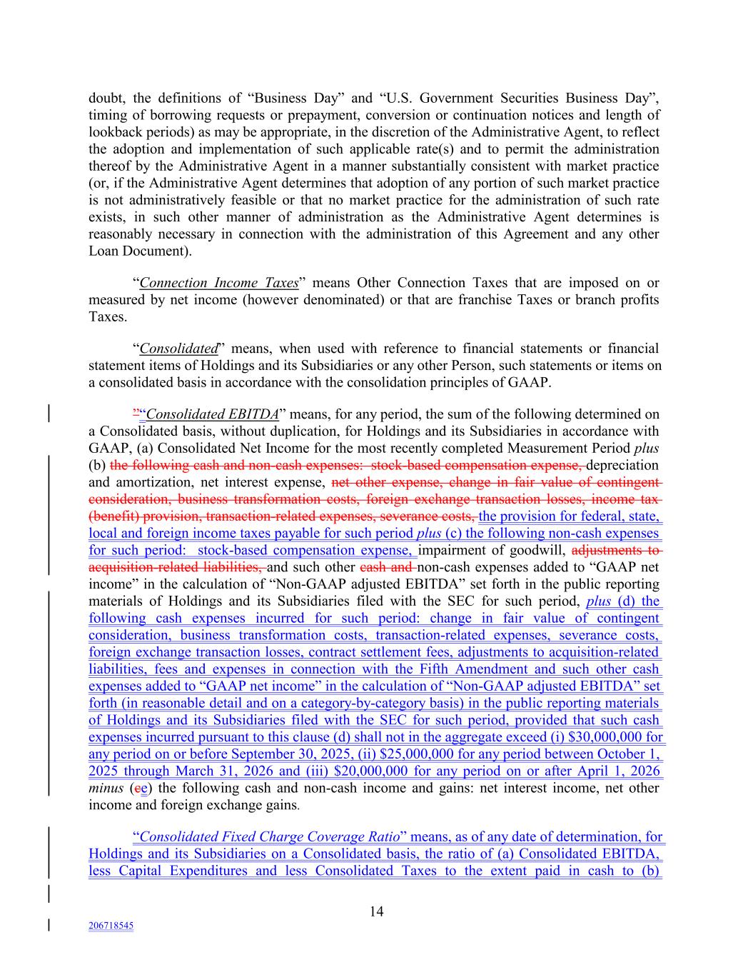 doubt, the definitions of “Business Day” and “U.S. Government Securities Business Day”, timing of borrowing requests or prepayment, conversion or continuation notices and length of lookback periods) as may be appropriate, in the discretion of the Administrative Agent, to reflect the adoption and implementation of such applicable rate(s) and to permit the administration thereof by the Administrative Agent in a manner substantially consistent with market practice (or, if the Administrative Agent determines that adoption of any portion of such market practice is not administratively feasible or that no market practice for the administration of such rate exists, in such other manner of administration as the Administrative Agent determines is reasonably necessary in connection with the administration of this Agreement and any other Loan Document). “Connection Income Taxes” means Other Connection Taxes that are imposed on or measured by net income (however denominated) or that are franchise Taxes or branch profits Taxes. “Consolidated” means, when used with reference to financial statements or financial statement items of Holdings and its Subsidiaries or any other Person, such statements or items on a consolidated basis in accordance with the consolidation principles of GAAP. ”“Consolidated EBITDA” means, for any period, the sum of the following determined on a Consolidated basis, without duplication, for Holdings and its Subsidiaries in accordance with GAAP, (a) Consolidated Net Income for the most recently completed Measurement Period plus (b) the following cash and non-cash expenses: stock-based compensation expense, depreciation and amortization, net interest expense, net other expense, change in fair value of contingent consideration, business transformation costs, foreign exchange transaction losses, income tax (benefit) provision, transaction-related expenses, severance costs, the provision for federal, state, local and foreign income taxes payable for such period plus (c) the following non-cash expenses for such period: stock-based compensation expense, impairment of goodwill, adjustments to acquisition-related liabilities, and such other cash and non-cash expenses added to “GAAP net income” in the calculation of “Non-GAAP adjusted EBITDA” set forth in the public reporting materials of Holdings and its Subsidiaries filed with the SEC for such period, plus (d) the following cash expenses incurred for such period: change in fair value of contingent consideration, business transformation costs, transaction-related expenses, severance costs, foreign exchange transaction losses, contract settlement fees, adjustments to acquisition-related liabilities, fees and expenses in connection with the Fifth Amendment and such other cash expenses added to “GAAP net income” in the calculation of “Non-GAAP adjusted EBITDA” set forth (in reasonable detail and on a category-by-category basis) in the public reporting materials of Holdings and its Subsidiaries filed with the SEC for such period, provided that such cash expenses incurred pursuant to this clause (d) shall not in the aggregate exceed (i) $30,000,000 for any period on or before September 30, 2025, (ii) $25,000,000 for any period between October 1, 2025 through March 31, 2026 and (iii) $20,000,000 for any period on or after April 1, 2026 minus (ce) the following cash and non-cash income and gains: net interest income, net other income and foreign exchange gains. “Consolidated Fixed Charge Coverage Ratio” means, as of any date of determination, for Holdings and its Subsidiaries on a Consolidated basis, the ratio of (a) Consolidated EBITDA, less Capital Expenditures and less Consolidated Taxes to the extent paid in cash to (b) 14 206718545