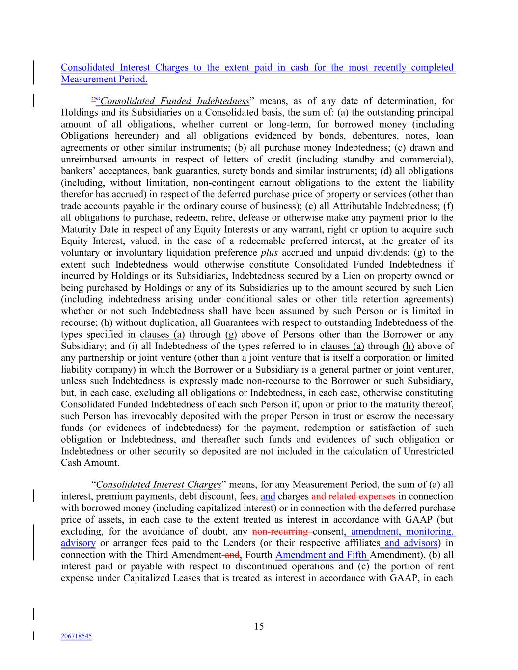 Consolidated Interest Charges to the extent paid in cash for the most recently completed Measurement Period. ”“Consolidated Funded Indebtedness” means, as of any date of determination, for Holdings and its Subsidiaries on a Consolidated basis, the sum of: (a) the outstanding principal amount of all obligations, whether current or long-term, for borrowed money (including Obligations hereunder) and all obligations evidenced by bonds, debentures, notes, loan agreements or other similar instruments; (b) all purchase money Indebtedness; (c) drawn and unreimbursed amounts in respect of letters of credit (including standby and commercial), bankers’ acceptances, bank guaranties, surety bonds and similar instruments; (d) all obligations (including, without limitation, non-contingent earnout obligations to the extent the liability therefor has accrued) in respect of the deferred purchase price of property or services (other than trade accounts payable in the ordinary course of business); (e) all Attributable Indebtedness; (f) all obligations to purchase, redeem, retire, defease or otherwise make any payment prior to the Maturity Date in respect of any Equity Interests or any warrant, right or option to acquire such Equity Interest, valued, in the case of a redeemable preferred interest, at the greater of its voluntary or involuntary liquidation preference plus accrued and unpaid dividends; (g) to the extent such Indebtedness would otherwise constitute Consolidated Funded Indebtedness if incurred by Holdings or its Subsidiaries, Indebtedness secured by a Lien on property owned or being purchased by Holdings or any of its Subsidiaries up to the amount secured by such Lien (including indebtedness arising under conditional sales or other title retention agreements) whether or not such Indebtedness shall have been assumed by such Person or is limited in recourse; (h) without duplication, all Guarantees with respect to outstanding Indebtedness of the types specified in clauses (a) through (g) above of Persons other than the Borrower or any Subsidiary; and (i) all Indebtedness of the types referred to in clauses (a) through (h) above of any partnership or joint venture (other than a joint venture that is itself a corporation or limited liability company) in which the Borrower or a Subsidiary is a general partner or joint venturer, unless such Indebtedness is expressly made non-recourse to the Borrower or such Subsidiary, but, in each case, excluding all obligations or Indebtedness, in each case, otherwise constituting Consolidated Funded Indebtedness of each such Person if, upon or prior to the maturity thereof, such Person has irrevocably deposited with the proper Person in trust or escrow the necessary funds (or evidences of indebtedness) for the payment, redemption or satisfaction of such obligation or Indebtedness, and thereafter such funds and evidences of such obligation or Indebtedness or other security so deposited are not included in the calculation of Unrestricted Cash Amount. “Consolidated Interest Charges” means, for any Measurement Period, the sum of (a) all interest, premium payments, debt discount, fees, and charges and related expenses in connection with borrowed money (including capitalized interest) or in connection with the deferred purchase price of assets, in each case to the extent treated as interest in accordance with GAAP (but excluding, for the avoidance of doubt, any non-recurring consent, amendment, monitoring, advisory or arranger fees paid to the Lenders (or their respective affiliates and advisors) in connection with the Third Amendment and, Fourth Amendment and Fifth Amendment), (b) all interest paid or payable with respect to discontinued operations and (c) the portion of rent expense under Capitalized Leases that is treated as interest in accordance with GAAP, in each 15 206718545