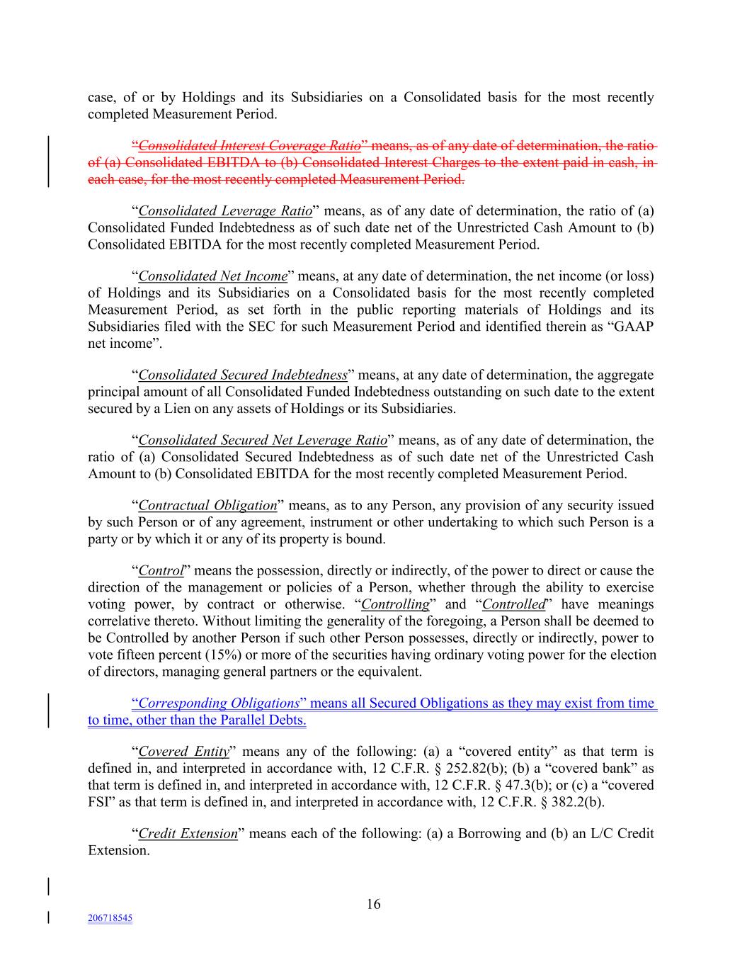 case, of or by Holdings and its Subsidiaries on a Consolidated basis for the most recently completed Measurement Period. “Consolidated Interest Coverage Ratio” means, as of any date of determination, the ratio of (a) Consolidated EBITDA to (b) Consolidated Interest Charges to the extent paid in cash, in each case, for the most recently completed Measurement Period. “Consolidated Leverage Ratio” means, as of any date of determination, the ratio of (a) Consolidated Funded Indebtedness as of such date net of the Unrestricted Cash Amount to (b) Consolidated EBITDA for the most recently completed Measurement Period. “Consolidated Net Income” means, at any date of determination, the net income (or loss) of Holdings and its Subsidiaries on a Consolidated basis for the most recently completed Measurement Period, as set forth in the public reporting materials of Holdings and its Subsidiaries filed with the SEC for such Measurement Period and identified therein as “GAAP net income”. “Consolidated Secured Indebtedness” means, at any date of determination, the aggregate principal amount of all Consolidated Funded Indebtedness outstanding on such date to the extent secured by a Lien on any assets of Holdings or its Subsidiaries. “Consolidated Secured Net Leverage Ratio” means, as of any date of determination, the ratio of (a) Consolidated Secured Indebtedness as of such date net of the Unrestricted Cash Amount to (b) Consolidated EBITDA for the most recently completed Measurement Period. “Contractual Obligation” means, as to any Person, any provision of any security issued by such Person or of any agreement, instrument or other undertaking to which such Person is a party or by which it or any of its property is bound. “Control” means the possession, directly or indirectly, of the power to direct or cause the direction of the management or policies of a Person, whether through the ability to exercise voting power, by contract or otherwise. “Controlling” and “Controlled” have meanings correlative thereto. Without limiting the generality of the foregoing, a Person shall be deemed to be Controlled by another Person if such other Person possesses, directly or indirectly, power to vote fifteen percent (15%) or more of the securities having ordinary voting power for the election of directors, managing general partners or the equivalent. “Corresponding Obligations” means all Secured Obligations as they may exist from time to time, other than the Parallel Debts. “Covered Entity” means any of the following: (a) a “covered entity” as that term is defined in, and interpreted in accordance with, 12 C.F.R. § 252.82(b); (b) a “covered bank” as that term is defined in, and interpreted in accordance with, 12 C.F.R. § 47.3(b); or (c) a “covered FSI” as that term is defined in, and interpreted in accordance with, 12 C.F.R. § 382.2(b). “Credit Extension” means each of the following: (a) a Borrowing and (b) an L/C Credit Extension. 16 206718545