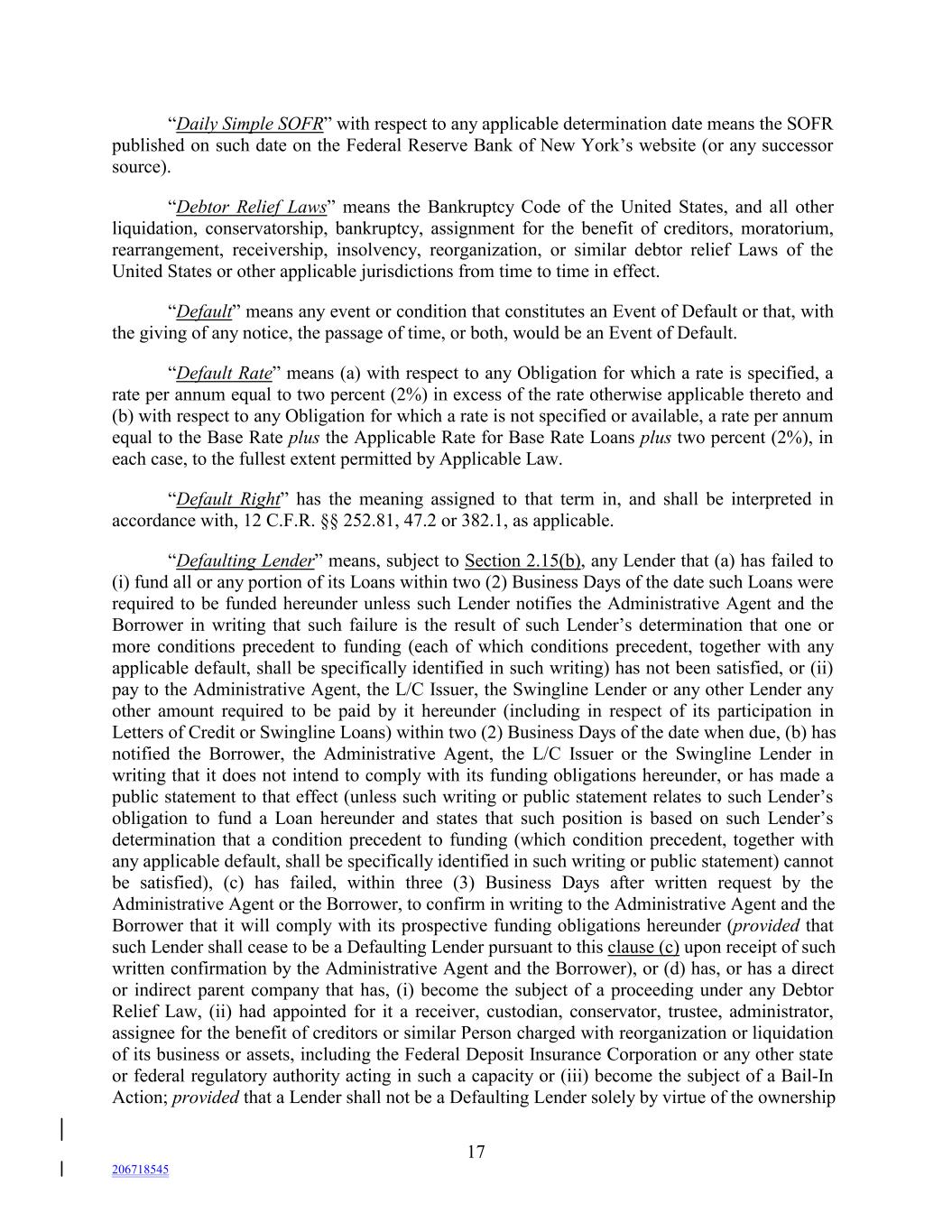 “Daily Simple SOFR” with respect to any applicable determination date means the SOFR published on such date on the Federal Reserve Bank of New York’s website (or any successor source). “Debtor Relief Laws” means the Bankruptcy Code of the United States, and all other liquidation, conservatorship, bankruptcy, assignment for the benefit of creditors, moratorium, rearrangement, receivership, insolvency, reorganization, or similar debtor relief Laws of the United States or other applicable jurisdictions from time to time in effect. “Default” means any event or condition that constitutes an Event of Default or that, with the giving of any notice, the passage of time, or both, would be an Event of Default. “Default Rate” means (a) with respect to any Obligation for which a rate is specified, a rate per annum equal to two percent (2%) in excess of the rate otherwise applicable thereto and (b) with respect to any Obligation for which a rate is not specified or available, a rate per annum equal to the Base Rate plus the Applicable Rate for Base Rate Loans plus two percent (2%), in each case, to the fullest extent permitted by Applicable Law. “Default Right” has the meaning assigned to that term in, and shall be interpreted in accordance with, 12 C.F.R. §§ 252.81, 47.2 or 382.1, as applicable. “Defaulting Lender” means, subject to Section 2.15(b), any Lender that (a) has failed to (i) fund all or any portion of its Loans within two (2) Business Days of the date such Loans were required to be funded hereunder unless such Lender notifies the Administrative Agent and the Borrower in writing that such failure is the result of such Lender’s determination that one or more conditions precedent to funding (each of which conditions precedent, together with any applicable default, shall be specifically identified in such writing) has not been satisfied, or (ii) pay to the Administrative Agent, the L/C Issuer, the Swingline Lender or any other Lender any other amount required to be paid by it hereunder (including in respect of its participation in Letters of Credit or Swingline Loans) within two (2) Business Days of the date when due, (b) has notified the Borrower, the Administrative Agent, the L/C Issuer or the Swingline Lender in writing that it does not intend to comply with its funding obligations hereunder, or has made a public statement to that effect (unless such writing or public statement relates to such Lender’s obligation to fund a Loan hereunder and states that such position is based on such Lender’s determination that a condition precedent to funding (which condition precedent, together with any applicable default, shall be specifically identified in such writing or public statement) cannot be satisfied), (c) has failed, within three (3) Business Days after written request by the Administrative Agent or the Borrower, to confirm in writing to the Administrative Agent and the Borrower that it will comply with its prospective funding obligations hereunder (provided that such Lender shall cease to be a Defaulting Lender pursuant to this clause (c) upon receipt of such written confirmation by the Administrative Agent and the Borrower), or (d) has, or has a direct or indirect parent company that has, (i) become the subject of a proceeding under any Debtor Relief Law, (ii) had appointed for it a receiver, custodian, conservator, trustee, administrator, assignee for the benefit of creditors or similar Person charged with reorganization or liquidation of its business or assets, including the Federal Deposit Insurance Corporation or any other state or federal regulatory authority acting in such a capacity or (iii) become the subject of a Bail-In Action; provided that a Lender shall not be a Defaulting Lender solely by virtue of the ownership 17 206718545