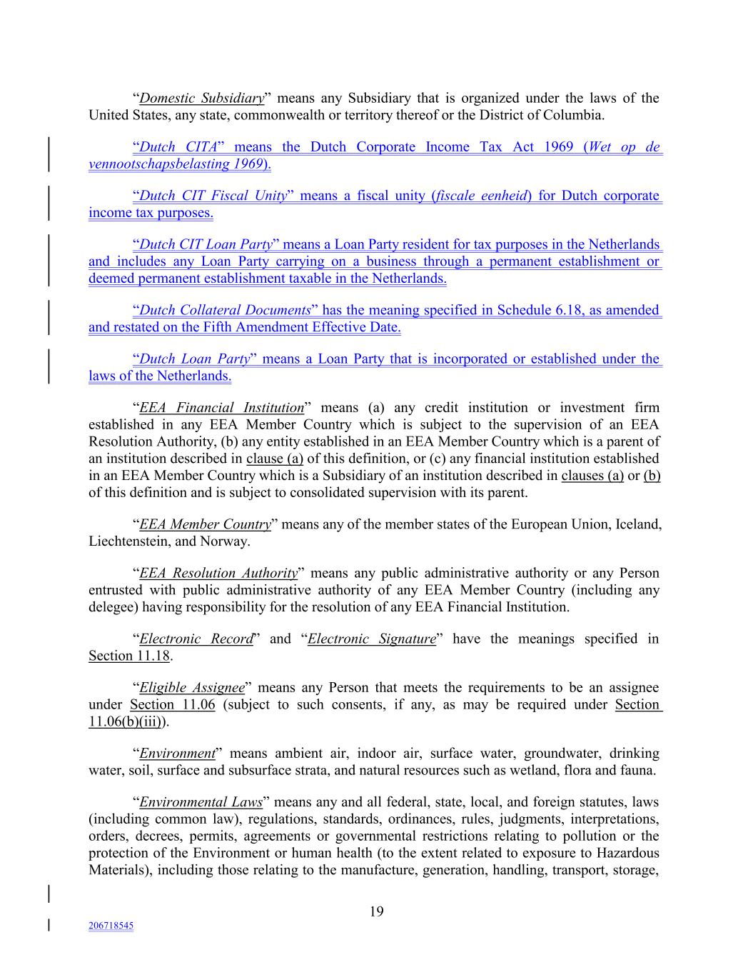 “Domestic Subsidiary” means any Subsidiary that is organized under the laws of the United States, any state, commonwealth or territory thereof or the District of Columbia. “Dutch CITA” means the Dutch Corporate Income Tax Act 1969 (Wet op de vennootschapsbelasting 1969). “Dutch CIT Fiscal Unity” means a fiscal unity (fiscale eenheid) for Dutch corporate income tax purposes. “Dutch CIT Loan Party” means a Loan Party resident for tax purposes in the Netherlands and includes any Loan Party carrying on a business through a permanent establishment or deemed permanent establishment taxable in the Netherlands. “Dutch Collateral Documents” has the meaning specified in Schedule 6.18, as amended and restated on the Fifth Amendment Effective Date. “Dutch Loan Party” means a Loan Party that is incorporated or established under the laws of the Netherlands. “EEA Financial Institution” means (a) any credit institution or investment firm established in any EEA Member Country which is subject to the supervision of an EEA Resolution Authority, (b) any entity established in an EEA Member Country which is a parent of an institution described in clause (a) of this definition, or (c) any financial institution established in an EEA Member Country which is a Subsidiary of an institution described in clauses (a) or (b) of this definition and is subject to consolidated supervision with its parent. “EEA Member Country” means any of the member states of the European Union, Iceland, Liechtenstein, and Norway. “EEA Resolution Authority” means any public administrative authority or any Person entrusted with public administrative authority of any EEA Member Country (including any delegee) having responsibility for the resolution of any EEA Financial Institution. “Electronic Record” and “Electronic Signature” have the meanings specified in Section 11.18. “Eligible Assignee” means any Person that meets the requirements to be an assignee under Section 11.06 (subject to such consents, if any, as may be required under Section 11.06(b)(iii)). “Environment” means ambient air, indoor air, surface water, groundwater, drinking water, soil, surface and subsurface strata, and natural resources such as wetland, flora and fauna. “Environmental Laws” means any and all federal, state, local, and foreign statutes, laws (including common law), regulations, standards, ordinances, rules, judgments, interpretations, orders, decrees, permits, agreements or governmental restrictions relating to pollution or the protection of the Environment or human health (to the extent related to exposure to Hazardous Materials), including those relating to the manufacture, generation, handling, transport, storage, 19 206718545