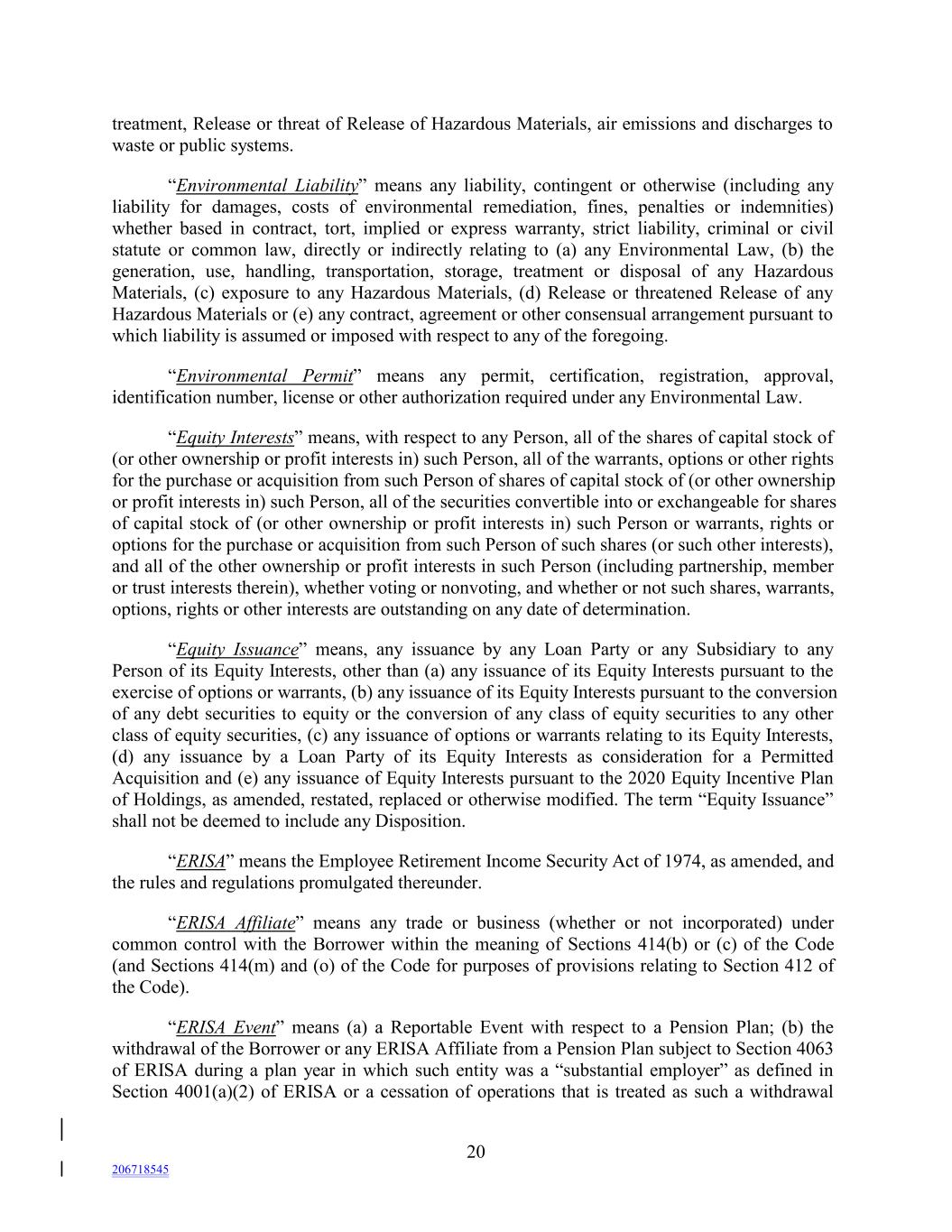treatment, Release or threat of Release of Hazardous Materials, air emissions and discharges to waste or public systems. “Environmental Liability” means any liability, contingent or otherwise (including any liability for damages, costs of environmental remediation, fines, penalties or indemnities) whether based in contract, tort, implied or express warranty, strict liability, criminal or civil statute or common law, directly or indirectly relating to (a) any Environmental Law, (b) the generation, use, handling, transportation, storage, treatment or disposal of any Hazardous Materials, (c) exposure to any Hazardous Materials, (d) Release or threatened Release of any Hazardous Materials or (e) any contract, agreement or other consensual arrangement pursuant to which liability is assumed or imposed with respect to any of the foregoing. “Environmental Permit” means any permit, certification, registration, approval, identification number, license or other authorization required under any Environmental Law. “Equity Interests” means, with respect to any Person, all of the shares of capital stock of (or other ownership or profit interests in) such Person, all of the warrants, options or other rights for the purchase or acquisition from such Person of shares of capital stock of (or other ownership or profit interests in) such Person, all of the securities convertible into or exchangeable for shares of capital stock of (or other ownership or profit interests in) such Person or warrants, rights or options for the purchase or acquisition from such Person of such shares (or such other interests), and all of the other ownership or profit interests in such Person (including partnership, member or trust interests therein), whether voting or nonvoting, and whether or not such shares, warrants, options, rights or other interests are outstanding on any date of determination. “Equity Issuance” means, any issuance by any Loan Party or any Subsidiary to any Person of its Equity Interests, other than (a) any issuance of its Equity Interests pursuant to the exercise of options or warrants, (b) any issuance of its Equity Interests pursuant to the conversion of any debt securities to equity or the conversion of any class of equity securities to any other class of equity securities, (c) any issuance of options or warrants relating to its Equity Interests, (d) any issuance by a Loan Party of its Equity Interests as consideration for a Permitted Acquisition and (e) any issuance of Equity Interests pursuant to the 2020 Equity Incentive Plan of Holdings, as amended, restated, replaced or otherwise modified. The term “Equity Issuance” shall not be deemed to include any Disposition. “ERISA” means the Employee Retirement Income Security Act of 1974, as amended, and the rules and regulations promulgated thereunder. “ERISA Affiliate” means any trade or business (whether or not incorporated) under common control with the Borrower within the meaning of Sections 414(b) or (c) of the Code (and Sections 414(m) and (o) of the Code for purposes of provisions relating to Section 412 of the Code). “ERISA Event” means (a) a Reportable Event with respect to a Pension Plan; (b) the withdrawal of the Borrower or any ERISA Affiliate from a Pension Plan subject to Section 4063 of ERISA during a plan year in which such entity was a “substantial employer” as defined in Section 4001(a)(2) of ERISA or a cessation of operations that is treated as such a withdrawal 20 206718545