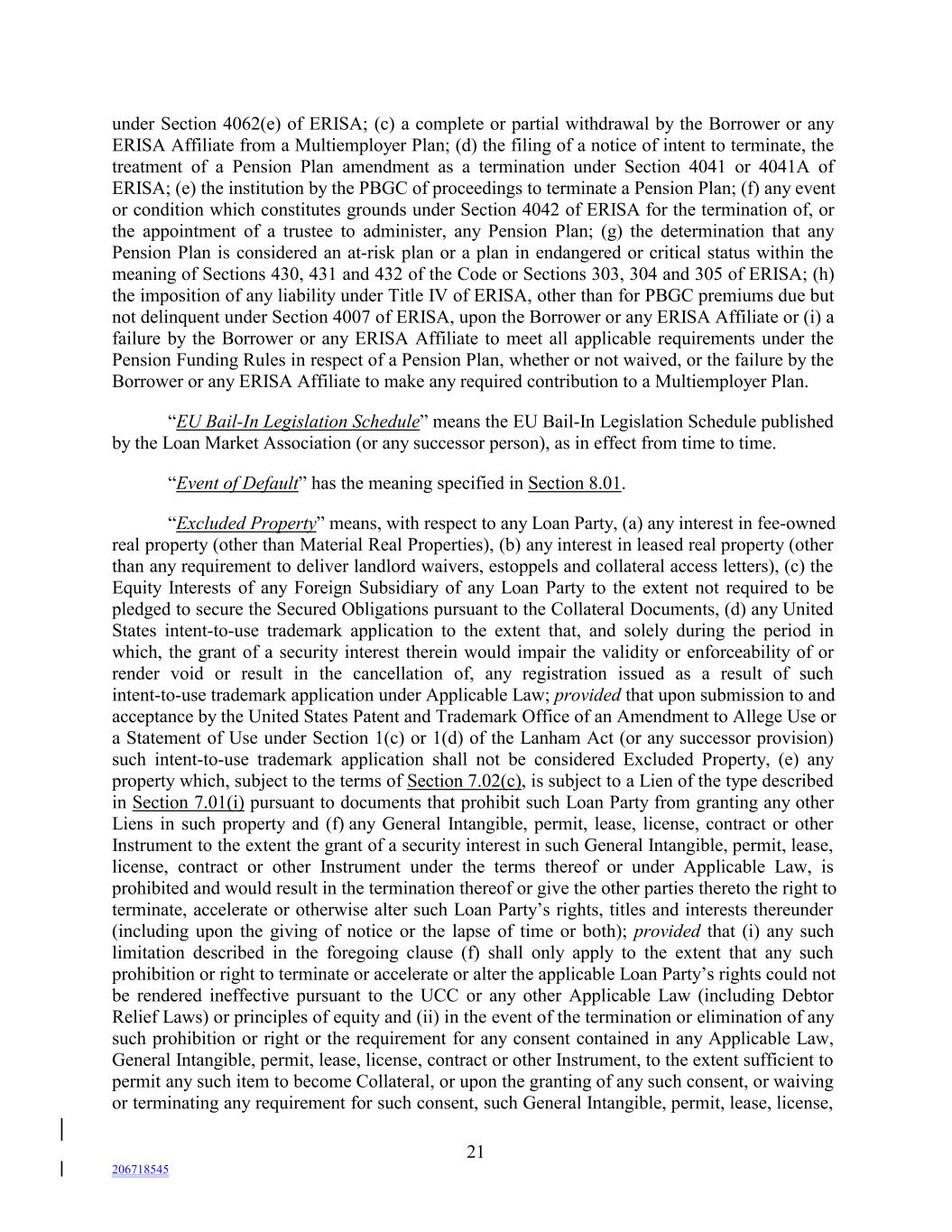 under Section 4062(e) of ERISA; (c) a complete or partial withdrawal by the Borrower or any ERISA Affiliate from a Multiemployer Plan; (d) the filing of a notice of intent to terminate, the treatment of a Pension Plan amendment as a termination under Section 4041 or 4041A of ERISA; (e) the institution by the PBGC of proceedings to terminate a Pension Plan; (f) any event or condition which constitutes grounds under Section 4042 of ERISA for the termination of, or the appointment of a trustee to administer, any Pension Plan; (g) the determination that any Pension Plan is considered an at-risk plan or a plan in endangered or critical status within the meaning of Sections 430, 431 and 432 of the Code or Sections 303, 304 and 305 of ERISA; (h) the imposition of any liability under Title IV of ERISA, other than for PBGC premiums due but not delinquent under Section 4007 of ERISA, upon the Borrower or any ERISA Affiliate or (i) a failure by the Borrower or any ERISA Affiliate to meet all applicable requirements under the Pension Funding Rules in respect of a Pension Plan, whether or not waived, or the failure by the Borrower or any ERISA Affiliate to make any required contribution to a Multiemployer Plan. “EU Bail-In Legislation Schedule” means the EU Bail-In Legislation Schedule published by the Loan Market Association (or any successor person), as in effect from time to time. “Event of Default” has the meaning specified in Section 8.01. “Excluded Property” means, with respect to any Loan Party, (a) any interest in fee-owned real property (other than Material Real Properties), (b) any interest in leased real property (other than any requirement to deliver landlord waivers, estoppels and collateral access letters), (c) the Equity Interests of any Foreign Subsidiary of any Loan Party to the extent not required to be pledged to secure the Secured Obligations pursuant to the Collateral Documents, (d) any United States intent-to-use trademark application to the extent that, and solely during the period in which, the grant of a security interest therein would impair the validity or enforceability of or render void or result in the cancellation of, any registration issued as a result of such intent-to-use trademark application under Applicable Law; provided that upon submission to and acceptance by the United States Patent and Trademark Office of an Amendment to Allege Use or a Statement of Use under Section 1(c) or 1(d) of the Lanham Act (or any successor provision) such intent-to-use trademark application shall not be considered Excluded Property, (e) any property which, subject to the terms of Section 7.02(c), is subject to a Lien of the type described in Section 7.01(i) pursuant to documents that prohibit such Loan Party from granting any other Liens in such property and (f) any General Intangible, permit, lease, license, contract or other Instrument to the extent the grant of a security interest in such General Intangible, permit, lease, license, contract or other Instrument under the terms thereof or under Applicable Law, is prohibited and would result in the termination thereof or give the other parties thereto the right to terminate, accelerate or otherwise alter such Loan Party’s rights, titles and interests thereunder (including upon the giving of notice or the lapse of time or both); provided that (i) any such limitation described in the foregoing clause (f) shall only apply to the extent that any such prohibition or right to terminate or accelerate or alter the applicable Loan Party’s rights could not be rendered ineffective pursuant to the UCC or any other Applicable Law (including Debtor Relief Laws) or principles of equity and (ii) in the event of the termination or elimination of any such prohibition or right or the requirement for any consent contained in any Applicable Law, General Intangible, permit, lease, license, contract or other Instrument, to the extent sufficient to permit any such item to become Collateral, or upon the granting of any such consent, or waiving or terminating any requirement for such consent, such General Intangible, permit, lease, license, 21 206718545