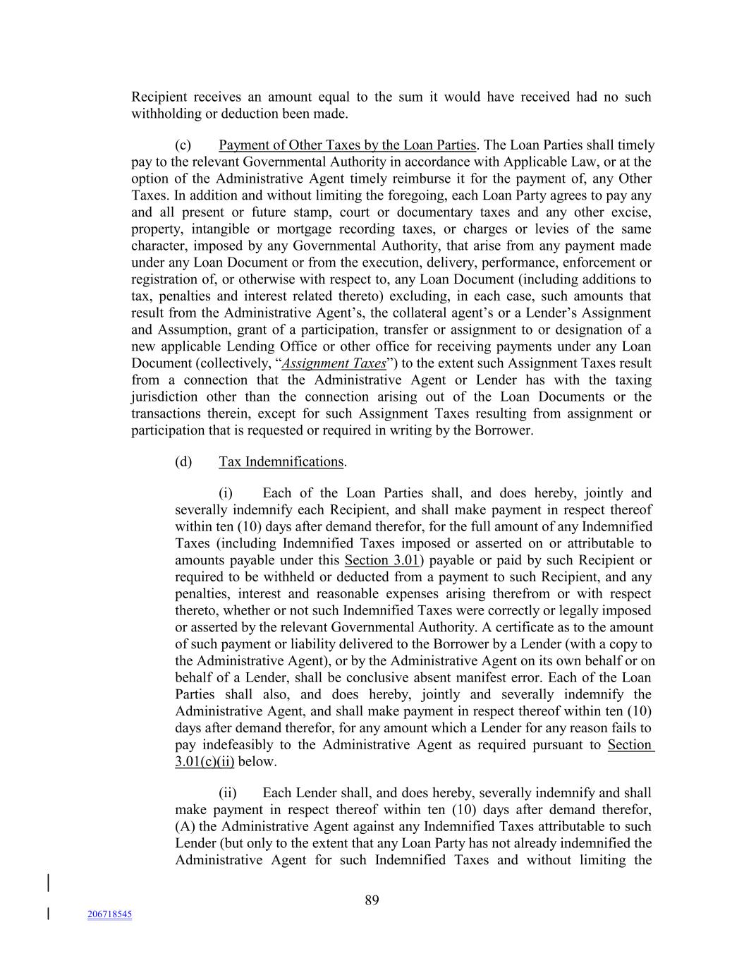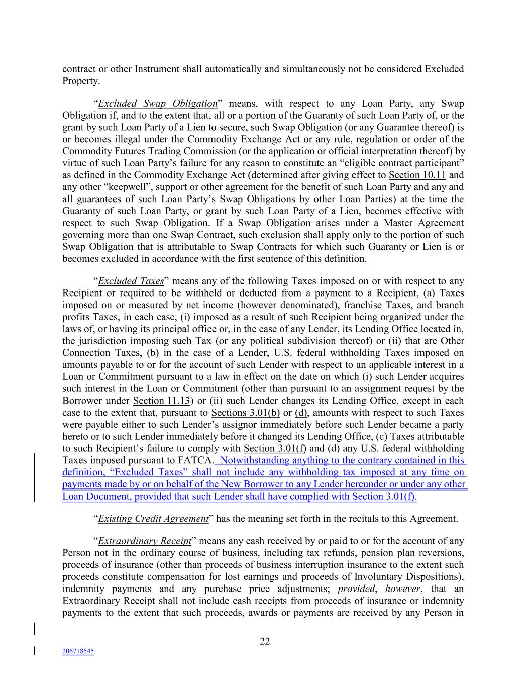contract or other Instrument shall automatically and simultaneously not be considered Excluded Property. “Excluded Swap Obligation” means, with respect to any Loan Party, any Swap Obligation if, and to the extent that, all or a portion of the Guaranty of such Loan Party of, or the grant by such Loan Party of a Lien to secure, such Swap Obligation (or any Guarantee thereof) is or becomes illegal under the Commodity Exchange Act or any rule, regulation or order of the Commodity Futures Trading Commission (or the application or official interpretation thereof) by virtue of such Loan Party’s failure for any reason to constitute an “eligible contract participant” as defined in the Commodity Exchange Act (determined after giving effect to Section 10.11 and any other “keepwell”, support or other agreement for the benefit of such Loan Party and any and all guarantees of such Loan Party’s Swap Obligations by other Loan Parties) at the time the Guaranty of such Loan Party, or grant by such Loan Party of a Lien, becomes effective with respect to such Swap Obligation. If a Swap Obligation arises under a Master Agreement governing more than one Swap Contract, such exclusion shall apply only to the portion of such Swap Obligation that is attributable to Swap Contracts for which such Guaranty or Lien is or becomes excluded in accordance with the first sentence of this definition. “Excluded Taxes” means any of the following Taxes imposed on or with respect to any Recipient or required to be withheld or deducted from a payment to a Recipient, (a) Taxes imposed on or measured by net income (however denominated), franchise Taxes, and branch profits Taxes, in each case, (i) imposed as a result of such Recipient being organized under the laws of, or having its principal office or, in the case of any Lender, its Lending Office located in, the jurisdiction imposing such Tax (or any political subdivision thereof) or (ii) that are Other Connection Taxes, (b) in the case of a Lender, U.S. federal withholding Taxes imposed on amounts payable to or for the account of such Lender with respect to an applicable interest in a Loan or Commitment pursuant to a law in effect on the date on which (i) such Lender acquires such interest in the Loan or Commitment (other than pursuant to an assignment request by the Borrower under Section 11.13) or (ii) such Lender changes its Lending Office, except in each case to the extent that, pursuant to Sections 3.01(b) or (d), amounts with respect to such Taxes were payable either to such Lender’s assignor immediately before such Lender became a party hereto or to such Lender immediately before it changed its Lending Office, (c) Taxes attributable to such Recipient’s failure to comply with Section 3.01(f) and (d) any U.S. federal withholding Taxes imposed pursuant to FATCA. Notwithstanding anything to the contrary contained in this definition, “Excluded Taxes” shall not include any withholding tax imposed at any time on payments made by or on behalf of the New Borrower to any Lender hereunder or under any other Loan Document, provided that such Lender shall have complied with Section 3.01(f). “Existing Credit Agreement” has the meaning set forth in the recitals to this Agreement. “Extraordinary Receipt” means any cash received by or paid to or for the account of any Person not in the ordinary course of business, including tax refunds, pension plan reversions, proceeds of insurance (other than proceeds of business interruption insurance to the extent such proceeds constitute compensation for lost earnings and proceeds of Involuntary Dispositions), indemnity payments and any purchase price adjustments; provided, however, that an Extraordinary Receipt shall not include cash receipts from proceeds of insurance or indemnity payments to the extent that such proceeds, awards or payments are received by any Person in 22 206718545