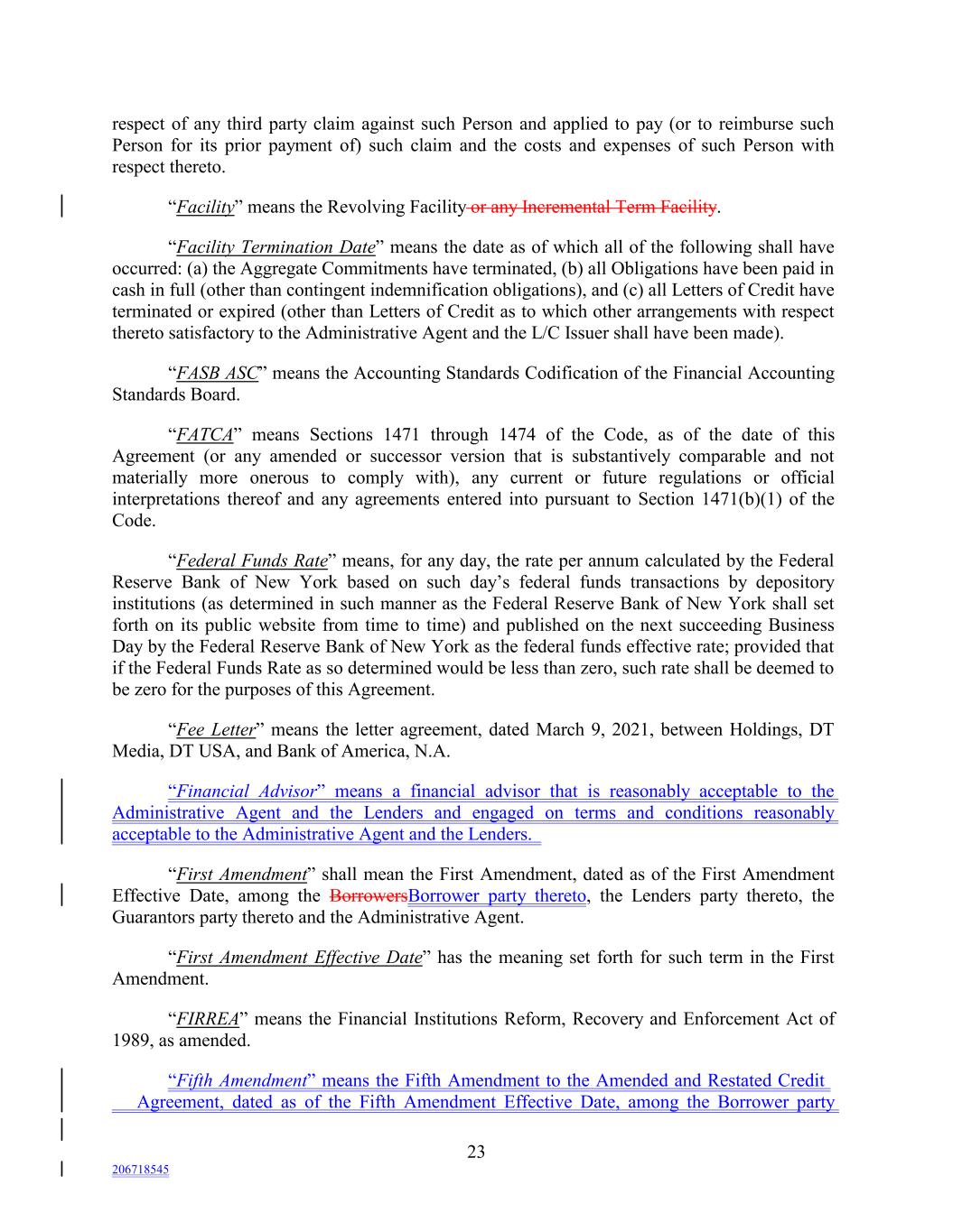 respect of any third party claim against such Person and applied to pay (or to reimburse such Person for its prior payment of) such claim and the costs and expenses of such Person with respect thereto. “Facility” means the Revolving Facility or any Incremental Term Facility. “Facility Termination Date” means the date as of which all of the following shall have occurred: (a) the Aggregate Commitments have terminated, (b) all Obligations have been paid in cash in full (other than contingent indemnification obligations), and (c) all Letters of Credit have terminated or expired (other than Letters of Credit as to which other arrangements with respect thereto satisfactory to the Administrative Agent and the L/C Issuer shall have been made). “FASB ASC” means the Accounting Standards Codification of the Financial Accounting Standards Board. “FATCA” means Sections 1471 through 1474 of the Code, as of the date of this Agreement (or any amended or successor version that is substantively comparable and not materially more onerous to comply with), any current or future regulations or official interpretations thereof and any agreements entered into pursuant to Section 1471(b)(1) of the Code. “Federal Funds Rate” means, for any day, the rate per annum calculated by the Federal Reserve Bank of New York based on such day’s federal funds transactions by depository institutions (as determined in such manner as the Federal Reserve Bank of New York shall set forth on its public website from time to time) and published on the next succeeding Business Day by the Federal Reserve Bank of New York as the federal funds effective rate; provided that if the Federal Funds Rate as so determined would be less than zero, such rate shall be deemed to be zero for the purposes of this Agreement. “Fee Letter” means the letter agreement, dated March 9, 2021, between Holdings, DT Media, DT USA, and Bank of America, N.A. “Financial Advisor” means a financial advisor that is reasonably acceptable to the Administrative Agent and the Lenders and engaged on terms and conditions reasonably acceptable to the Administrative Agent and the Lenders. “First Amendment” shall mean the First Amendment, dated as of the First Amendment Effective Date, among the BorrowersBorrower party thereto, the Lenders party thereto, the Guarantors party thereto and the Administrative Agent. “First Amendment Effective Date” has the meaning set forth for such term in the First Amendment. “FIRREA” means the Financial Institutions Reform, Recovery and Enforcement Act of 1989, as amended. “Fifth Amendment” means the Fifth Amendment to the Amended and Restated Credit Agreement, dated as of the Fifth Amendment Effective Date, among the Borrower party 23 206718545