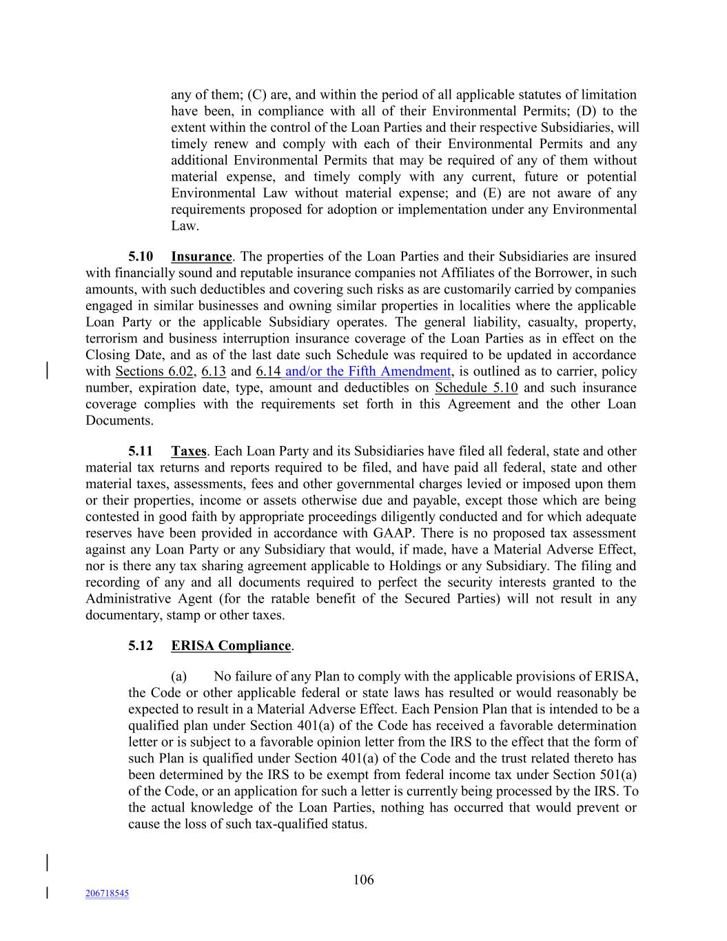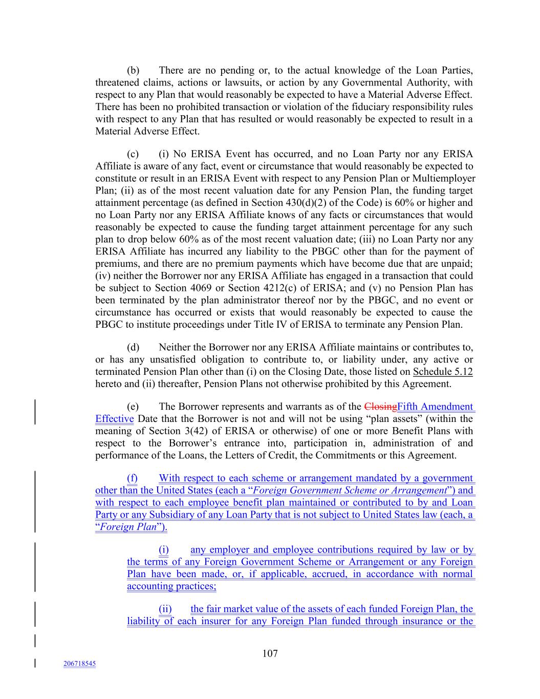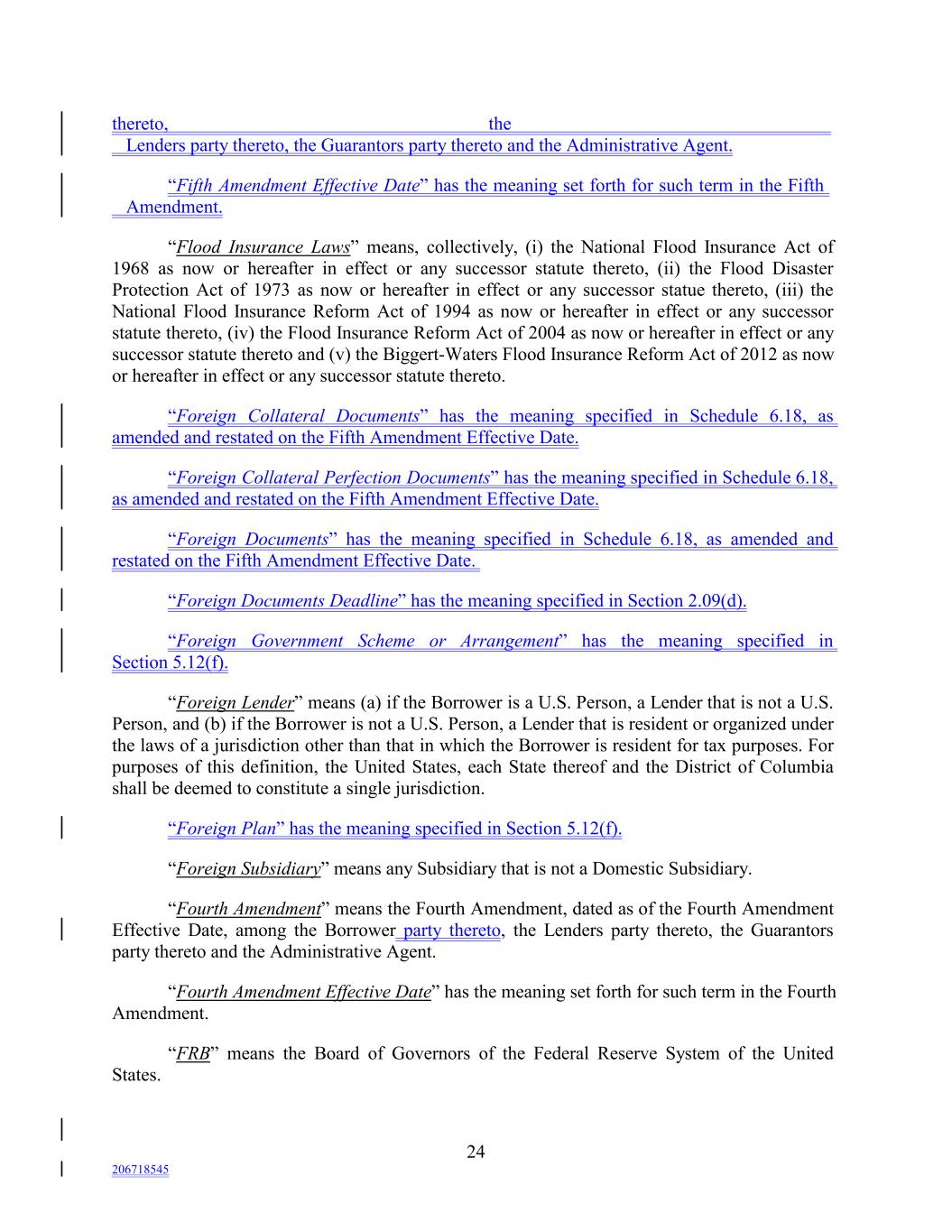 thereto, the Lenders party thereto, the Guarantors party thereto and the Administrative Agent. “Fifth Amendment Effective Date” has the meaning set forth for such term in the Fifth Amendment. “Flood Insurance Laws” means, collectively, (i) the National Flood Insurance Act of 1968 as now or hereafter in effect or any successor statute thereto, (ii) the Flood Disaster Protection Act of 1973 as now or hereafter in effect or any successor statue thereto, (iii) the National Flood Insurance Reform Act of 1994 as now or hereafter in effect or any successor statute thereto, (iv) the Flood Insurance Reform Act of 2004 as now or hereafter in effect or any successor statute thereto and (v) the Biggert-Waters Flood Insurance Reform Act of 2012 as now or hereafter in effect or any successor statute thereto. “Foreign Collateral Documents” has the meaning specified in Schedule 6.18, as amended and restated on the Fifth Amendment Effective Date. “Foreign Collateral Perfection Documents” has the meaning specified in Schedule 6.18, as amended and restated on the Fifth Amendment Effective Date. “Foreign Documents” has the meaning specified in Schedule 6.18, as amended and restated on the Fifth Amendment Effective Date. “Foreign Documents Deadline” has the meaning specified in Section 2.09(d). “Foreign Government Scheme or Arrangement” has the meaning specified in Section 5.12(f). “Foreign Lender” means (a) if the Borrower is a U.S. Person, a Lender that is not a U.S. Person, and (b) if the Borrower is not a U.S. Person, a Lender that is resident or organized under the laws of a jurisdiction other than that in which the Borrower is resident for tax purposes. For purposes of this definition, the United States, each State thereof and the District of Columbia shall be deemed to constitute a single jurisdiction. “Foreign Plan” has the meaning specified in Section 5.12(f). “Foreign Subsidiary” means any Subsidiary that is not a Domestic Subsidiary. “Fourth Amendment” means the Fourth Amendment, dated as of the Fourth Amendment Effective Date, among the Borrower party thereto, the Lenders party thereto, the Guarantors party thereto and the Administrative Agent. “Fourth Amendment Effective Date” has the meaning set forth for such term in the Fourth Amendment. “FRB” means the Board of Governors of the Federal Reserve System of the United States. 24 206718545