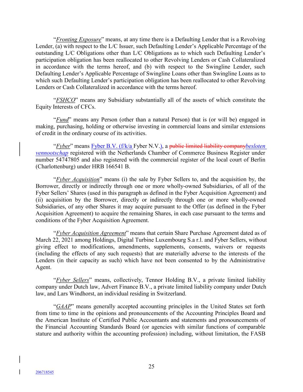 “Fronting Exposure” means, at any time there is a Defaulting Lender that is a Revolving Lender, (a) with respect to the L/C Issuer, such Defaulting Lender’s Applicable Percentage of the outstanding L/C Obligations other than L/C Obligations as to which such Defaulting Lender’s participation obligation has been reallocated to other Revolving Lenders or Cash Collateralized in accordance with the terms hereof, and (b) with respect to the Swingline Lender, such Defaulting Lender’s Applicable Percentage of Swingline Loans other than Swingline Loans as to which such Defaulting Lender’s participation obligation has been reallocated to other Revolving Lenders or Cash Collateralized in accordance with the terms hereof. “FSHCO” means any Subsidiary substantially all of the assets of which constitute the Equity Interests of CFCs. “Fund” means any Person (other than a natural Person) that is (or will be) engaged in making, purchasing, holding or otherwise investing in commercial loans and similar extensions of credit in the ordinary course of its activities. “Fyber” means Fyber B.V. (f/k/a Fyber N.V.), a public limited liability companybesloten vennootschap registered with the Netherlands Chamber of Commerce Business Register under number 54747805 and also registered with the commercial register of the local court of Berlin (Charlottenburg) under HRB 166541 B. “Fyber Acquisition” means (i) the sale by Fyber Sellers to, and the acquisition by, the Borrower, directly or indirectly through one or more wholly-owned Subsidiaries, of all of the Fyber Sellers’ Shares (used in this paragraph as defined in the Fyber Acquisition Agreement) and (ii) acquisition by the Borrower, directly or indirectly through one or more wholly-owned Subsidiaries, of any other Shares it may acquire pursuant to the Offer (as defined in the Fyber Acquisition Agreement) to acquire the remaining Shares, in each case pursuant to the terms and conditions of the Fyber Acquisition Agreement. “Fyber Acquisition Agreement” means that certain Share Purchase Agreement dated as of March 22, 2021 among Holdings, Digital Turbine Luxembourg S.a r.l. and Fyber Sellers, without giving effect to modifications, amendments, supplements, consents, waivers or requests (including the effects of any such requests) that are materially adverse to the interests of the Lenders (in their capacity as such) which have not been consented to by the Administrative Agent. “Fyber Sellers” means, collectively, Tennor Holding B.V., a private limited liability company under Dutch law, Advert Finance B.V., a private limited liability company under Dutch law, and Lars Windhorst, an individual residing in Switzerland. “GAAP” means generally accepted accounting principles in the United States set forth from time to time in the opinions and pronouncements of the Accounting Principles Board and the American Institute of Certified Public Accountants and statements and pronouncements of the Financial Accounting Standards Board (or agencies with similar functions of comparable stature and authority within the accounting profession) including, without limitation, the FASB 25 206718545