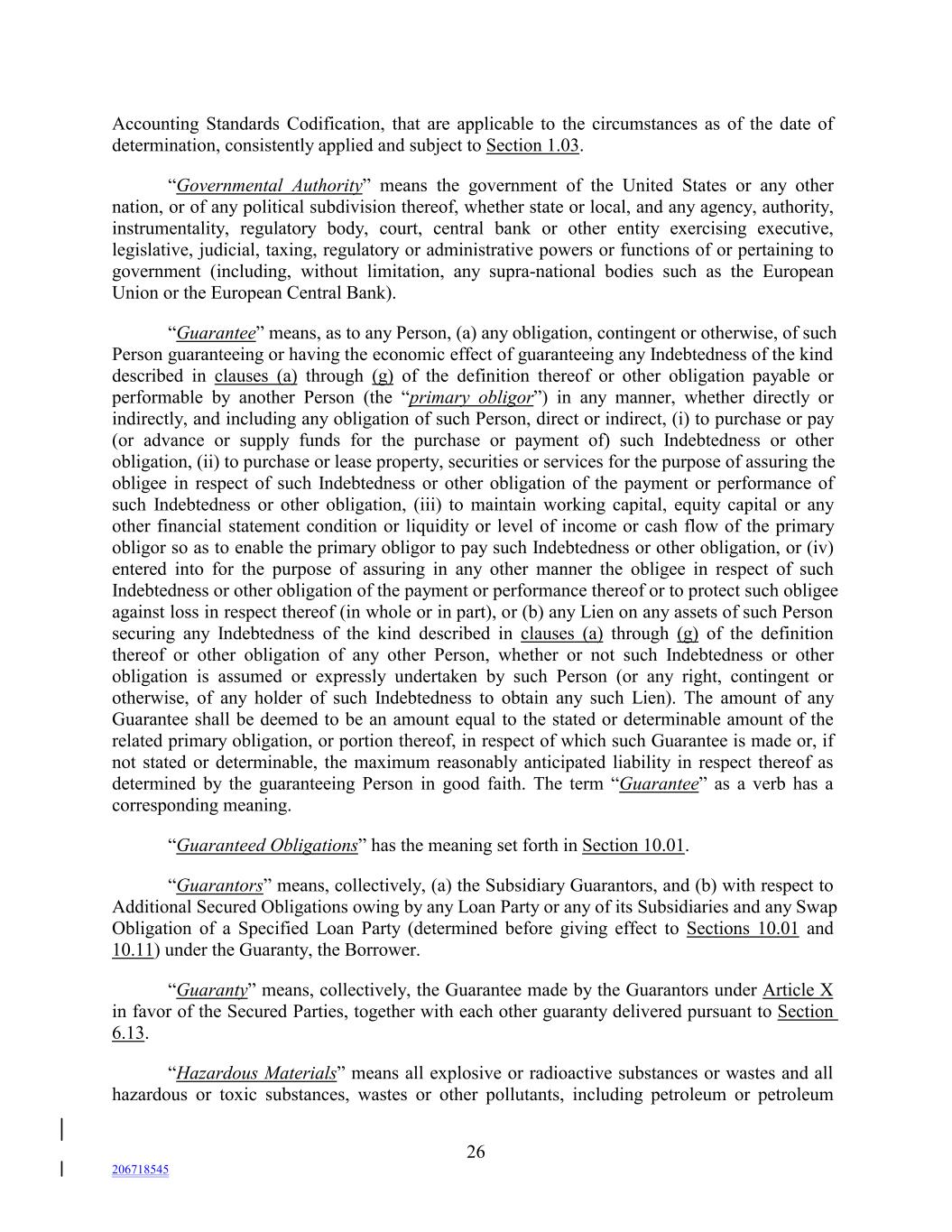 Accounting Standards Codification, that are applicable to the circumstances as of the date of determination, consistently applied and subject to Section 1.03. “Governmental Authority” means the government of the United States or any other nation, or of any political subdivision thereof, whether state or local, and any agency, authority, instrumentality, regulatory body, court, central bank or other entity exercising executive, legislative, judicial, taxing, regulatory or administrative powers or functions of or pertaining to government (including, without limitation, any supra-national bodies such as the European Union or the European Central Bank). “Guarantee” means, as to any Person, (a) any obligation, contingent or otherwise, of such Person guaranteeing or having the economic effect of guaranteeing any Indebtedness of the kind described in clauses (a) through (g) of the definition thereof or other obligation payable or performable by another Person (the “primary obligor”) in any manner, whether directly or indirectly, and including any obligation of such Person, direct or indirect, (i) to purchase or pay (or advance or supply funds for the purchase or payment of) such Indebtedness or other obligation, (ii) to purchase or lease property, securities or services for the purpose of assuring the obligee in respect of such Indebtedness or other obligation of the payment or performance of such Indebtedness or other obligation, (iii) to maintain working capital, equity capital or any other financial statement condition or liquidity or level of income or cash flow of the primary obligor so as to enable the primary obligor to pay such Indebtedness or other obligation, or (iv) entered into for the purpose of assuring in any other manner the obligee in respect of such Indebtedness or other obligation of the payment or performance thereof or to protect such obligee against loss in respect thereof (in whole or in part), or (b) any Lien on any assets of such Person securing any Indebtedness of the kind described in clauses (a) through (g) of the definition thereof or other obligation of any other Person, whether or not such Indebtedness or other obligation is assumed or expressly undertaken by such Person (or any right, contingent or otherwise, of any holder of such Indebtedness to obtain any such Lien). The amount of any Guarantee shall be deemed to be an amount equal to the stated or determinable amount of the related primary obligation, or portion thereof, in respect of which such Guarantee is made or, if not stated or determinable, the maximum reasonably anticipated liability in respect thereof as determined by the guaranteeing Person in good faith. The term “Guarantee” as a verb has a corresponding meaning. “Guaranteed Obligations” has the meaning set forth in Section 10.01. “Guarantors” means, collectively, (a) the Subsidiary Guarantors, and (b) with respect to Additional Secured Obligations owing by any Loan Party or any of its Subsidiaries and any Swap Obligation of a Specified Loan Party (determined before giving effect to Sections 10.01 and 10.11) under the Guaranty, the Borrower. “Guaranty” means, collectively, the Guarantee made by the Guarantors under Article X in favor of the Secured Parties, together with each other guaranty delivered pursuant to Section 6.13. “Hazardous Materials” means all explosive or radioactive substances or wastes and all hazardous or toxic substances, wastes or other pollutants, including petroleum or petroleum 26 206718545