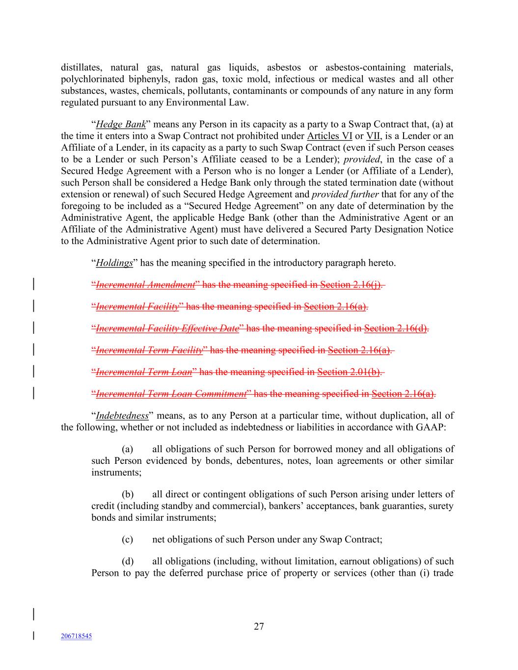 distillates, natural gas, natural gas liquids, asbestos or asbestos-containing materials, polychlorinated biphenyls, radon gas, toxic mold, infectious or medical wastes and all other substances, wastes, chemicals, pollutants, contaminants or compounds of any nature in any form regulated pursuant to any Environmental Law. “Hedge Bank” means any Person in its capacity as a party to a Swap Contract that, (a) at the time it enters into a Swap Contract not prohibited under Articles VI or VII, is a Lender or an Affiliate of a Lender, in its capacity as a party to such Swap Contract (even if such Person ceases to be a Lender or such Person’s Affiliate ceased to be a Lender); provided, in the case of a Secured Hedge Agreement with a Person who is no longer a Lender (or Affiliate of a Lender), such Person shall be considered a Hedge Bank only through the stated termination date (without extension or renewal) of such Secured Hedge Agreement and provided further that for any of the foregoing to be included as a “Secured Hedge Agreement” on any date of determination by the Administrative Agent, the applicable Hedge Bank (other than the Administrative Agent or an Affiliate of the Administrative Agent) must have delivered a Secured Party Designation Notice to the Administrative Agent prior to such date of determination. “Holdings” has the meaning specified in the introductory paragraph hereto. “Incremental Amendment” has the meaning specified in Section 2.16(j). “Incremental Facility” has the meaning specified in Section 2.16(a). “Incremental Facility Effective Date” has the meaning specified in Section 2.16(d). “Incremental Term Facility” has the meaning specified in Section 2.16(a). “Incremental Term Loan” has the meaning specified in Section 2.01(b). “Incremental Term Loan Commitment” has the meaning specified in Section 2.16(a). “Indebtedness” means, as to any Person at a particular time, without duplication, all of the following, whether or not included as indebtedness or liabilities in accordance with GAAP: (a) all obligations of such Person for borrowed money and all obligations of such Person evidenced by bonds, debentures, notes, loan agreements or other similar instruments; (b) all direct or contingent obligations of such Person arising under letters of credit (including standby and commercial), bankers’ acceptances, bank guaranties, surety bonds and similar instruments; (c) net obligations of such Person under any Swap Contract; (d) all obligations (including, without limitation, earnout obligations) of such Person to pay the deferred purchase price of property or services (other than (i) trade 27 206718545