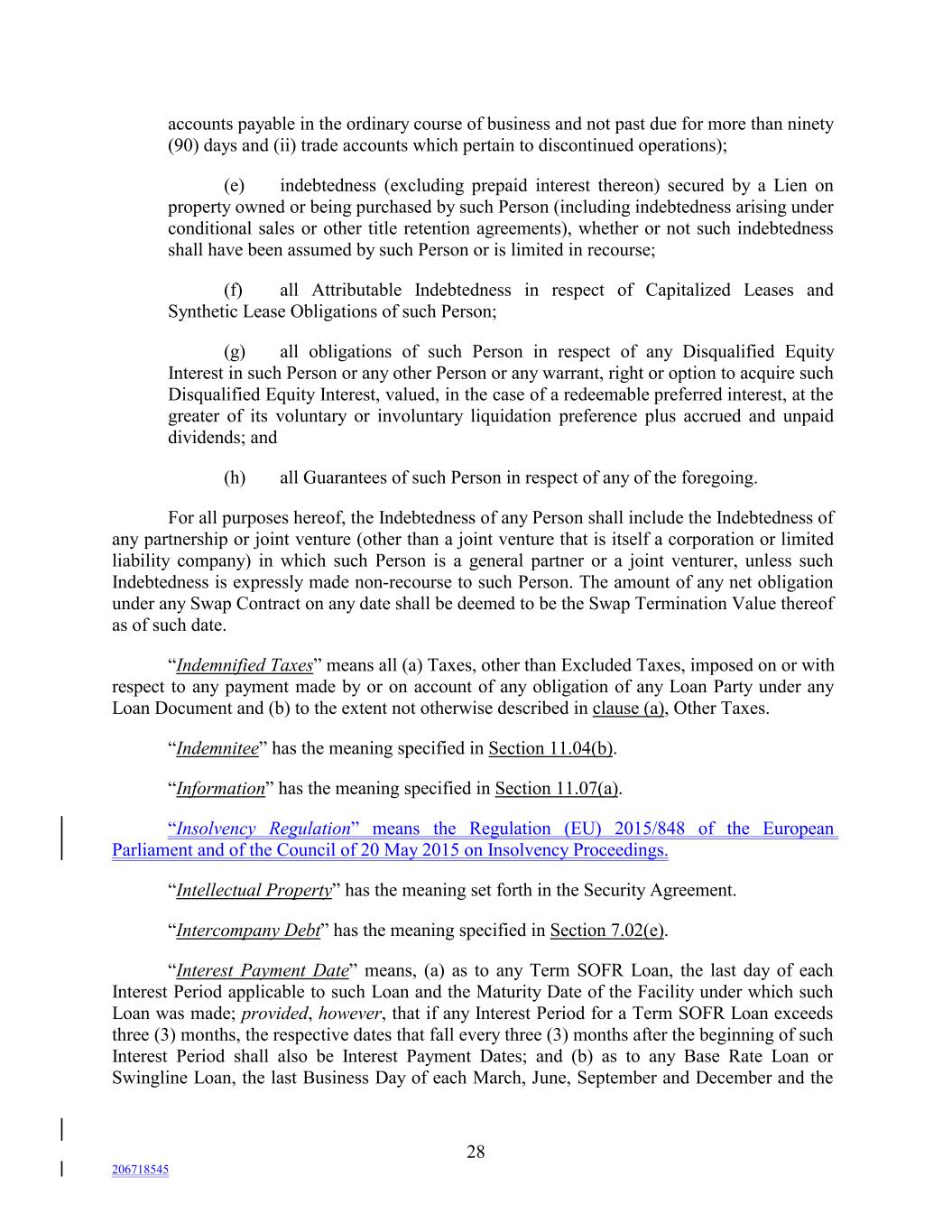 accounts payable in the ordinary course of business and not past due for more than ninety (90) days and (ii) trade accounts which pertain to discontinued operations); (e) indebtedness (excluding prepaid interest thereon) secured by a Lien on property owned or being purchased by such Person (including indebtedness arising under conditional sales or other title retention agreements), whether or not such indebtedness shall have been assumed by such Person or is limited in recourse; (f) all Attributable Indebtedness in respect of Capitalized Leases and Synthetic Lease Obligations of such Person; (g) all obligations of such Person in respect of any Disqualified Equity Interest in such Person or any other Person or any warrant, right or option to acquire such Disqualified Equity Interest, valued, in the case of a redeemable preferred interest, at the greater of its voluntary or involuntary liquidation preference plus accrued and unpaid dividends; and (h) all Guarantees of such Person in respect of any of the foregoing. For all purposes hereof, the Indebtedness of any Person shall include the Indebtedness of any partnership or joint venture (other than a joint venture that is itself a corporation or limited liability company) in which such Person is a general partner or a joint venturer, unless such Indebtedness is expressly made non-recourse to such Person. The amount of any net obligation under any Swap Contract on any date shall be deemed to be the Swap Termination Value thereof as of such date. “Indemnified Taxes” means all (a) Taxes, other than Excluded Taxes, imposed on or with respect to any payment made by or on account of any obligation of any Loan Party under any Loan Document and (b) to the extent not otherwise described in clause (a), Other Taxes. “Indemnitee” has the meaning specified in Section 11.04(b). “Information” has the meaning specified in Section 11.07(a). “Insolvency Regulation” means the Regulation (EU) 2015/848 of the European Parliament and of the Council of 20 May 2015 on Insolvency Proceedings. “Intellectual Property” has the meaning set forth in the Security Agreement. “Intercompany Debt” has the meaning specified in Section 7.02(e). “Interest Payment Date” means, (a) as to any Term SOFR Loan, the last day of each Interest Period applicable to such Loan and the Maturity Date of the Facility under which such Loan was made; provided, however, that if any Interest Period for a Term SOFR Loan exceeds three (3) months, the respective dates that fall every three (3) months after the beginning of such Interest Period shall also be Interest Payment Dates; and (b) as to any Base Rate Loan or Swingline Loan, the last Business Day of each March, June, September and December and the 28 206718545
