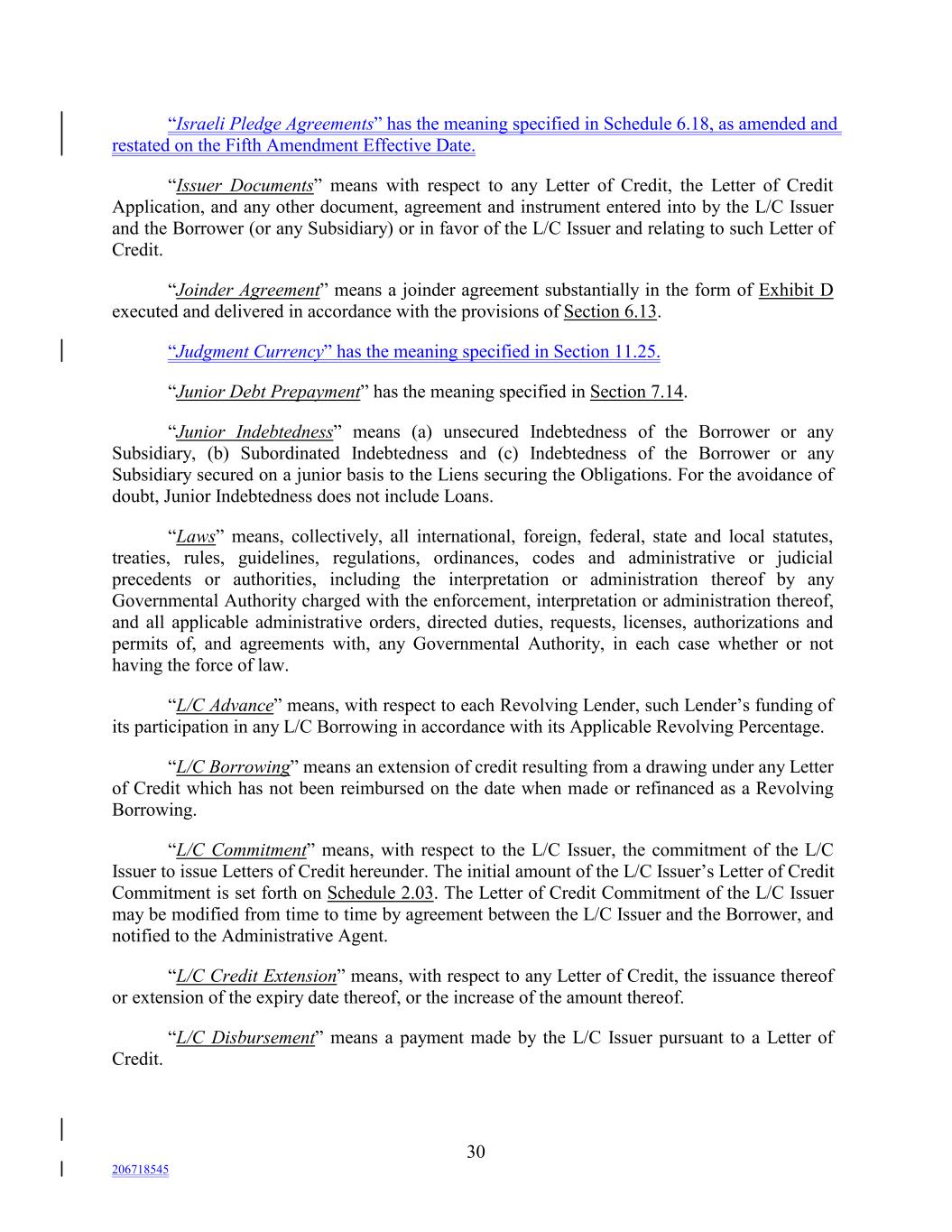 “Israeli Pledge Agreements” has the meaning specified in Schedule 6.18, as amended and restated on the Fifth Amendment Effective Date. “Issuer Documents” means with respect to any Letter of Credit, the Letter of Credit Application, and any other document, agreement and instrument entered into by the L/C Issuer and the Borrower (or any Subsidiary) or in favor of the L/C Issuer and relating to such Letter of Credit. “Joinder Agreement” means a joinder agreement substantially in the form of Exhibit D executed and delivered in accordance with the provisions of Section 6.13. “Judgment Currency” has the meaning specified in Section 11.25. “Junior Debt Prepayment” has the meaning specified in Section 7.14. “Junior Indebtedness” means (a) unsecured Indebtedness of the Borrower or any Subsidiary, (b) Subordinated Indebtedness and (c) Indebtedness of the Borrower or any Subsidiary secured on a junior basis to the Liens securing the Obligations. For the avoidance of doubt, Junior Indebtedness does not include Loans. “Laws” means, collectively, all international, foreign, federal, state and local statutes, treaties, rules, guidelines, regulations, ordinances, codes and administrative or judicial precedents or authorities, including the interpretation or administration thereof by any Governmental Authority charged with the enforcement, interpretation or administration thereof, and all applicable administrative orders, directed duties, requests, licenses, authorizations and permits of, and agreements with, any Governmental Authority, in each case whether or not having the force of law. “L/C Advance” means, with respect to each Revolving Lender, such Lender’s funding of its participation in any L/C Borrowing in accordance with its Applicable Revolving Percentage. “L/C Borrowing” means an extension of credit resulting from a drawing under any Letter of Credit which has not been reimbursed on the date when made or refinanced as a Revolving Borrowing. “L/C Commitment” means, with respect to the L/C Issuer, the commitment of the L/C Issuer to issue Letters of Credit hereunder. The initial amount of the L/C Issuer’s Letter of Credit Commitment is set forth on Schedule 2.03. The Letter of Credit Commitment of the L/C Issuer may be modified from time to time by agreement between the L/C Issuer and the Borrower, and notified to the Administrative Agent. “L/C Credit Extension” means, with respect to any Letter of Credit, the issuance thereof or extension of the expiry date thereof, or the increase of the amount thereof. “L/C Disbursement” means a payment made by the L/C Issuer pursuant to a Letter of Credit. 30 206718545