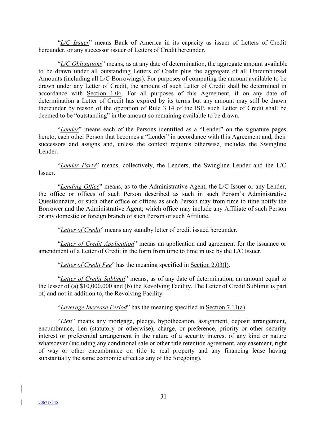 “L/C Issuer” means Bank of America in its capacity as issuer of Letters of Credit hereunder, or any successor issuer of Letters of Credit hereunder. “L/C Obligations” means, as at any date of determination, the aggregate amount available to be drawn under all outstanding Letters of Credit plus the aggregate of all Unreimbursed Amounts (including all L/C Borrowings). For purposes of computing the amount available to be drawn under any Letter of Credit, the amount of such Letter of Credit shall be determined in accordance with Section 1.06. For all purposes of this Agreement, if on any date of determination a Letter of Credit has expired by its terms but any amount may still be drawn thereunder by reason of the operation of Rule 3.14 of the ISP, such Letter of Credit shall be deemed to be “outstanding” in the amount so remaining available to be drawn. “Lender” means each of the Persons identified as a “Lender” on the signature pages hereto, each other Person that becomes a “Lender” in accordance with this Agreement and, their successors and assigns and, unless the context requires otherwise, includes the Swingline Lender. “Lender Party” means, collectively, the Lenders, the Swingline Lender and the L/C Issuer. “Lending Office” means, as to the Administrative Agent, the L/C Issuer or any Lender, the office or offices of such Person described as such in such Person’s Administrative Questionnaire, or such other office or offices as such Person may from time to time notify the Borrower and the Administrative Agent; which office may include any Affiliate of such Person or any domestic or foreign branch of such Person or such Affiliate. “Letter of Credit” means any standby letter of credit issued hereunder. “Letter of Credit Application” means an application and agreement for the issuance or amendment of a Letter of Credit in the form from time to time in use by the L/C Issuer. “Letter of Credit Fee” has the meaning specified in Section 2.03(l). “Letter of Credit Sublimit” means, as of any date of determination, an amount equal to the lesser of (a) $10,000,000 and (b) the Revolving Facility. The Letter of Credit Sublimit is part of, and not in addition to, the Revolving Facility. “Leverage Increase Period” has the meaning specified in Section 7.11(a). “Lien” means any mortgage, pledge, hypothecation, assignment, deposit arrangement, encumbrance, lien (statutory or otherwise), charge, or preference, priority or other security interest or preferential arrangement in the nature of a security interest of any kind or nature whatsoever (including any conditional sale or other title retention agreement, any easement, right of way or other encumbrance on title to real property and any financing lease having substantially the same economic effect as any of the foregoing). 31 206718545
