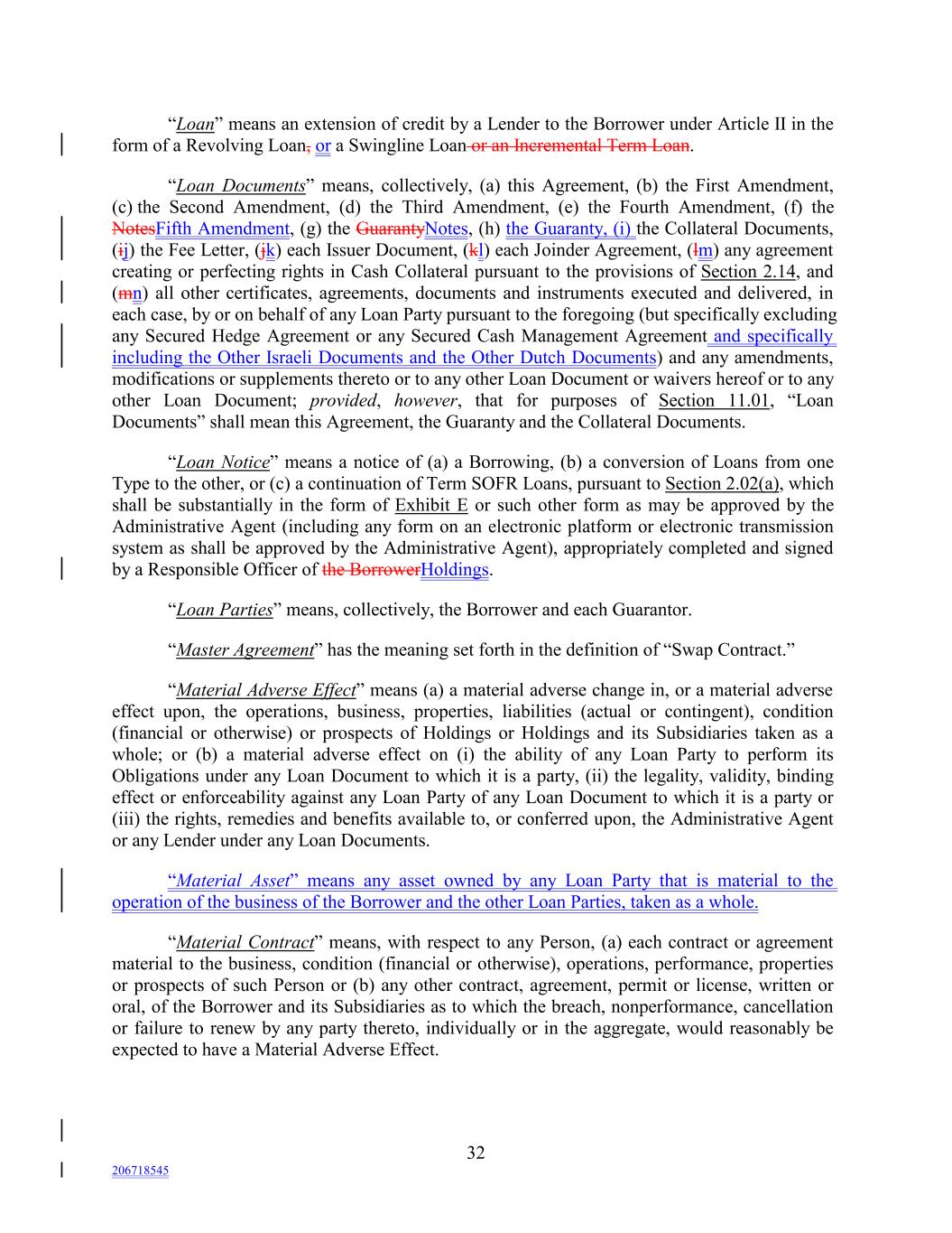 “Loan” means an extension of credit by a Lender to the Borrower under Article II in the form of a Revolving Loan, or a Swingline Loan or an Incremental Term Loan. “Loan Documents” means, collectively, (a) this Agreement, (b) the First Amendment, (c) the Second Amendment, (d) the Third Amendment, (e) the Fourth Amendment, (f) the NotesFifth Amendment, (g) the GuarantyNotes, (h) the Guaranty, (i) the Collateral Documents, (ij) the Fee Letter, (jk) each Issuer Document, (kl) each Joinder Agreement, (lm) any agreement creating or perfecting rights in Cash Collateral pursuant to the provisions of Section 2.14, and (mn) all other certificates, agreements, documents and instruments executed and delivered, in each case, by or on behalf of any Loan Party pursuant to the foregoing (but specifically excluding any Secured Hedge Agreement or any Secured Cash Management Agreement and specifically including the Other Israeli Documents and the Other Dutch Documents) and any amendments, modifications or supplements thereto or to any other Loan Document or waivers hereof or to any other Loan Document; provided, however, that for purposes of Section 11.01, “Loan Documents” shall mean this Agreement, the Guaranty and the Collateral Documents. “Loan Notice” means a notice of (a) a Borrowing, (b) a conversion of Loans from one Type to the other, or (c) a continuation of Term SOFR Loans, pursuant to Section 2.02(a), which shall be substantially in the form of Exhibit E or such other form as may be approved by the Administrative Agent (including any form on an electronic platform or electronic transmission system as shall be approved by the Administrative Agent), appropriately completed and signed by a Responsible Officer of the BorrowerHoldings. “Loan Parties” means, collectively, the Borrower and each Guarantor. “Master Agreement” has the meaning set forth in the definition of “Swap Contract.” “Material Adverse Effect” means (a) a material adverse change in, or a material adverse effect upon, the operations, business, properties, liabilities (actual or contingent), condition (financial or otherwise) or prospects of Holdings or Holdings and its Subsidiaries taken as a whole; or (b) a material adverse effect on (i) the ability of any Loan Party to perform its Obligations under any Loan Document to which it is a party, (ii) the legality, validity, binding effect or enforceability against any Loan Party of any Loan Document to which it is a party or (iii) the rights, remedies and benefits available to, or conferred upon, the Administrative Agent or any Lender under any Loan Documents. “Material Asset” means any asset owned by any Loan Party that is material to the operation of the business of the Borrower and the other Loan Parties, taken as a whole. “Material Contract” means, with respect to any Person, (a) each contract or agreement material to the business, condition (financial or otherwise), operations, performance, properties or prospects of such Person or (b) any other contract, agreement, permit or license, written or oral, of the Borrower and its Subsidiaries as to which the breach, nonperformance, cancellation or failure to renew by any party thereto, individually or in the aggregate, would reasonably be expected to have a Material Adverse Effect. 32 206718545