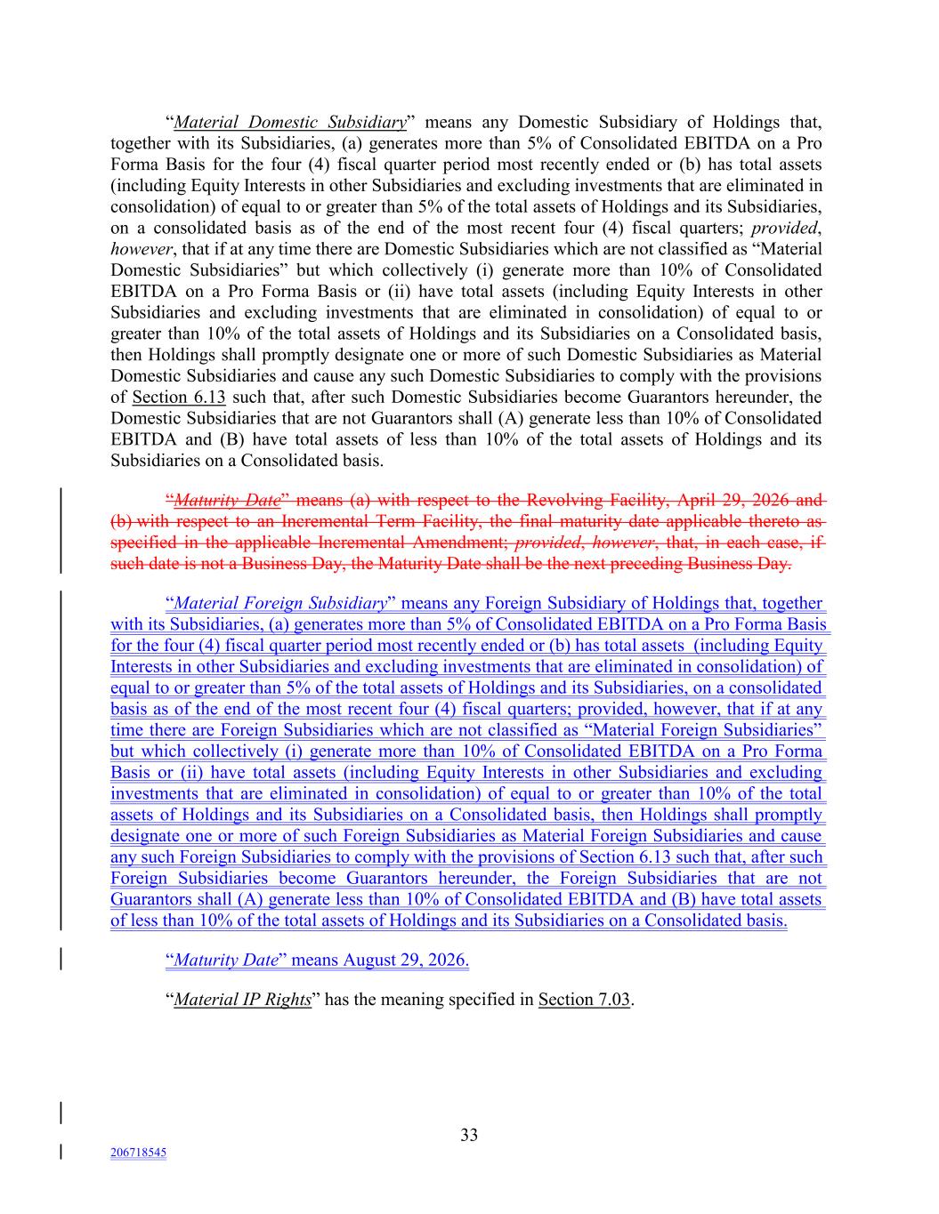 “Material Domestic Subsidiary” means any Domestic Subsidiary of Holdings that, together with its Subsidiaries, (a) generates more than 5% of Consolidated EBITDA on a Pro Forma Basis for the four (4) fiscal quarter period most recently ended or (b) has total assets (including Equity Interests in other Subsidiaries and excluding investments that are eliminated in consolidation) of equal to or greater than 5% of the total assets of Holdings and its Subsidiaries, on a consolidated basis as of the end of the most recent four (4) fiscal quarters; provided, however, that if at any time there are Domestic Subsidiaries which are not classified as “Material Domestic Subsidiaries” but which collectively (i) generate more than 10% of Consolidated EBITDA on a Pro Forma Basis or (ii) have total assets (including Equity Interests in other Subsidiaries and excluding investments that are eliminated in consolidation) of equal to or greater than 10% of the total assets of Holdings and its Subsidiaries on a Consolidated basis, then Holdings shall promptly designate one or more of such Domestic Subsidiaries as Material Domestic Subsidiaries and cause any such Domestic Subsidiaries to comply with the provisions of Section 6.13 such that, after such Domestic Subsidiaries become Guarantors hereunder, the Domestic Subsidiaries that are not Guarantors shall (A) generate less than 10% of Consolidated EBITDA and (B) have total assets of less than 10% of the total assets of Holdings and its Subsidiaries on a Consolidated basis. “Maturity Date” means (a) with respect to the Revolving Facility, April 29, 2026 and (b) with respect to an Incremental Term Facility, the final maturity date applicable thereto as specified in the applicable Incremental Amendment; provided, however, that, in each case, if such date is not a Business Day, the Maturity Date shall be the next preceding Business Day. “Material Foreign Subsidiary” means any Foreign Subsidiary of Holdings that, together with its Subsidiaries, (a) generates more than 5% of Consolidated EBITDA on a Pro Forma Basis for the four (4) fiscal quarter period most recently ended or (b) has total assets (including Equity Interests in other Subsidiaries and excluding investments that are eliminated in consolidation) of equal to or greater than 5% of the total assets of Holdings and its Subsidiaries, on a consolidated basis as of the end of the most recent four (4) fiscal quarters; provided, however, that if at any time there are Foreign Subsidiaries which are not classified as “Material Foreign Subsidiaries” but which collectively (i) generate more than 10% of Consolidated EBITDA on a Pro Forma Basis or (ii) have total assets (including Equity Interests in other Subsidiaries and excluding investments that are eliminated in consolidation) of equal to or greater than 10% of the total assets of Holdings and its Subsidiaries on a Consolidated basis, then Holdings shall promptly designate one or more of such Foreign Subsidiaries as Material Foreign Subsidiaries and cause any such Foreign Subsidiaries to comply with the provisions of Section 6.13 such that, after such Foreign Subsidiaries become Guarantors hereunder, the Foreign Subsidiaries that are not Guarantors shall (A) generate less than 10% of Consolidated EBITDA and (B) have total assets of less than 10% of the total assets of Holdings and its Subsidiaries on a Consolidated basis. “Maturity Date” means August 29, 2026. “Material IP Rights” has the meaning specified in Section 7.03. 33 206718545