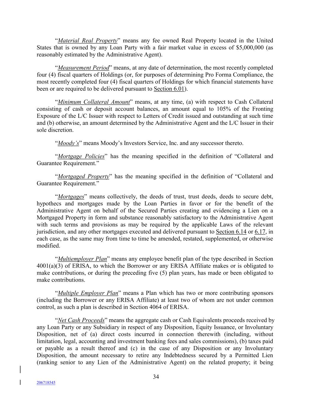 “Material Real Property” means any fee owned Real Property located in the United States that is owned by any Loan Party with a fair market value in excess of $5,000,000 (as reasonably estimated by the Administrative Agent). “Measurement Period” means, at any date of determination, the most recently completed four (4) fiscal quarters of Holdings (or, for purposes of determining Pro Forma Compliance, the most recently completed four (4) fiscal quarters of Holdings for which financial statements have been or are required to be delivered pursuant to Section 6.01). “Minimum Collateral Amount” means, at any time, (a) with respect to Cash Collateral consisting of cash or deposit account balances, an amount equal to 105% of the Fronting Exposure of the L/C Issuer with respect to Letters of Credit issued and outstanding at such time and (b) otherwise, an amount determined by the Administrative Agent and the L/C Issuer in their sole discretion. “Moody’s” means Moody’s Investors Service, Inc. and any successor thereto. “Mortgage Policies” has the meaning specified in the definition of “Collateral and Guarantee Requirement.” “Mortgaged Property” has the meaning specified in the definition of “Collateral and Guarantee Requirement.” “Mortgages” means collectively, the deeds of trust, trust deeds, deeds to secure debt, hypothecs and mortgages made by the Loan Parties in favor or for the benefit of the Administrative Agent on behalf of the Secured Parties creating and evidencing a Lien on a Mortgaged Property in form and substance reasonably satisfactory to the Administrative Agent with such terms and provisions as may be required by the applicable Laws of the relevant jurisdiction, and any other mortgages executed and delivered pursuant to Section 6.14 or 6.17, in each case, as the same may from time to time be amended, restated, supplemented, or otherwise modified. “Multiemployer Plan” means any employee benefit plan of the type described in Section 4001(a)(3) of ERISA, to which the Borrower or any ERISA Affiliate makes or is obligated to make contributions, or during the preceding five (5) plan years, has made or been obligated to make contributions. “Multiple Employer Plan” means a Plan which has two or more contributing sponsors (including the Borrower or any ERISA Affiliate) at least two of whom are not under common control, as such a plan is described in Section 4064 of ERISA. “Net Cash Proceeds” means the aggregate cash or Cash Equivalents proceeds received by any Loan Party or any Subsidiary in respect of any Disposition, Equity Issuance, or Involuntary Disposition, net of (a) direct costs incurred in connection therewith (including, without limitation, legal, accounting and investment banking fees and sales commissions), (b) taxes paid or payable as a result thereof and (c) in the case of any Disposition or any Involuntary Disposition, the amount necessary to retire any Indebtedness secured by a Permitted Lien (ranking senior to any Lien of the Administrative Agent) on the related property; it being 34 206718545