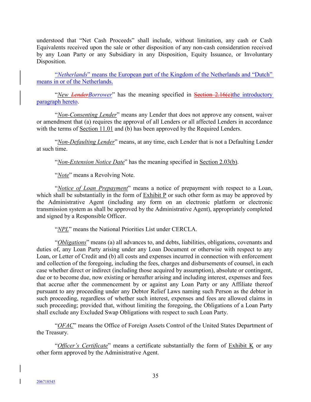 understood that “Net Cash Proceeds” shall include, without limitation, any cash or Cash Equivalents received upon the sale or other disposition of any non-cash consideration received by any Loan Party or any Subsidiary in any Disposition, Equity Issuance, or Involuntary Disposition. “Netherlands” means the European part of the Kingdom of the Netherlands and “Dutch” means in or of the Netherlands. “New LenderBorrower” has the meaning specified in Section 2.16(c)the introductory paragraph hereto. “Non-Consenting Lender” means any Lender that does not approve any consent, waiver or amendment that (a) requires the approval of all Lenders or all affected Lenders in accordance with the terms of Section 11.01 and (b) has been approved by the Required Lenders. “Non-Defaulting Lender” means, at any time, each Lender that is not a Defaulting Lender at such time. “Non-Extension Notice Date” has the meaning specified in Section 2.03(b). “Note” means a Revolving Note. “Notice of Loan Prepayment” means a notice of prepayment with respect to a Loan, which shall be substantially in the form of Exhibit P or such other form as may be approved by the Administrative Agent (including any form on an electronic platform or electronic transmission system as shall be approved by the Administrative Agent), appropriately completed and signed by a Responsible Officer. “NPL” means the National Priorities List under CERCLA. “Obligations” means (a) all advances to, and debts, liabilities, obligations, covenants and duties of, any Loan Party arising under any Loan Document or otherwise with respect to any Loan, or Letter of Credit and (b) all costs and expenses incurred in connection with enforcement and collection of the foregoing, including the fees, charges and disbursements of counsel, in each case whether direct or indirect (including those acquired by assumption), absolute or contingent, due or to become due, now existing or hereafter arising and including interest, expenses and fees that accrue after the commencement by or against any Loan Party or any Affiliate thereof pursuant to any proceeding under any Debtor Relief Laws naming such Person as the debtor in such proceeding, regardless of whether such interest, expenses and fees are allowed claims in such proceeding; provided that, without limiting the foregoing, the Obligations of a Loan Party shall exclude any Excluded Swap Obligations with respect to such Loan Party. “OFAC” means the Office of Foreign Assets Control of the United States Department of the Treasury. “Officer’s Certificate” means a certificate substantially the form of Exhibit K or any other form approved by the Administrative Agent. 35 206718545