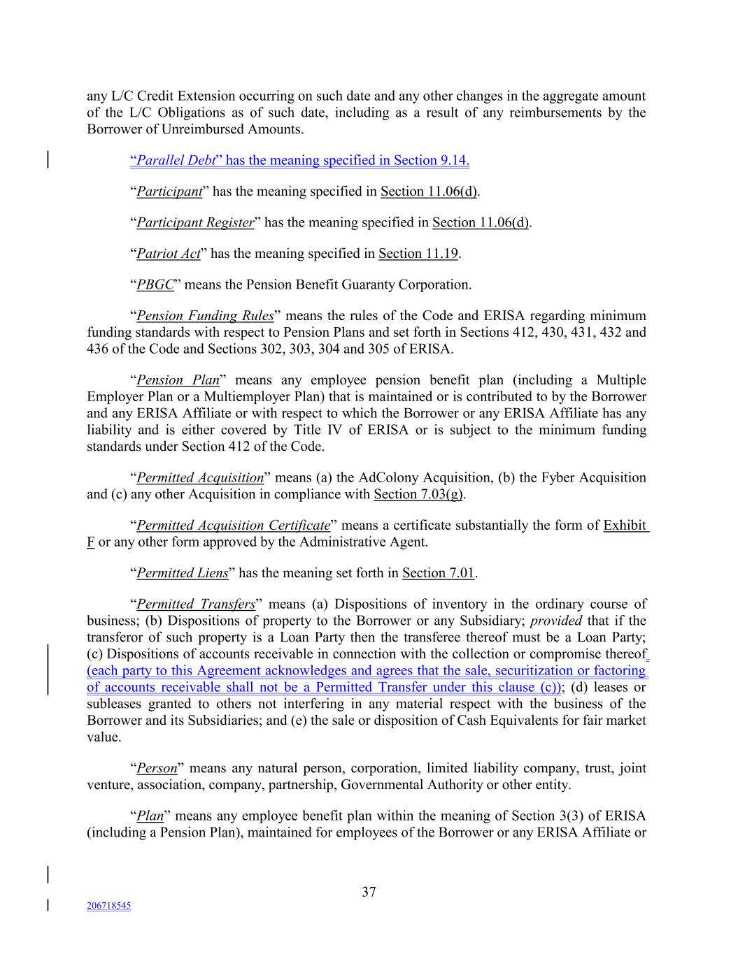 any L/C Credit Extension occurring on such date and any other changes in the aggregate amount of the L/C Obligations as of such date, including as a result of any reimbursements by the Borrower of Unreimbursed Amounts. “Parallel Debt” has the meaning specified in Section 9.14. “Participant” has the meaning specified in Section 11.06(d). “Participant Register” has the meaning specified in Section 11.06(d). “Patriot Act” has the meaning specified in Section 11.19. “PBGC” means the Pension Benefit Guaranty Corporation. “Pension Funding Rules” means the rules of the Code and ERISA regarding minimum funding standards with respect to Pension Plans and set forth in Sections 412, 430, 431, 432 and 436 of the Code and Sections 302, 303, 304 and 305 of ERISA. “Pension Plan” means any employee pension benefit plan (including a Multiple Employer Plan or a Multiemployer Plan) that is maintained or is contributed to by the Borrower and any ERISA Affiliate or with respect to which the Borrower or any ERISA Affiliate has any liability and is either covered by Title IV of ERISA or is subject to the minimum funding standards under Section 412 of the Code. “Permitted Acquisition” means (a) the AdColony Acquisition, (b) the Fyber Acquisition and (c) any other Acquisition in compliance with Section 7.03(g). “Permitted Acquisition Certificate” means a certificate substantially the form of Exhibit F or any other form approved by the Administrative Agent. “Permitted Liens” has the meaning set forth in Section 7.01. “Permitted Transfers” means (a) Dispositions of inventory in the ordinary course of business; (b) Dispositions of property to the Borrower or any Subsidiary; provided that if the transferor of such property is a Loan Party then the transferee thereof must be a Loan Party; (c) Dispositions of accounts receivable in connection with the collection or compromise thereof (each party to this Agreement acknowledges and agrees that the sale, securitization or factoring of accounts receivable shall not be a Permitted Transfer under this clause (c)); (d) leases or subleases granted to others not interfering in any material respect with the business of the Borrower and its Subsidiaries; and (e) the sale or disposition of Cash Equivalents for fair market value. “Person” means any natural person, corporation, limited liability company, trust, joint venture, association, company, partnership, Governmental Authority or other entity. “Plan” means any employee benefit plan within the meaning of Section 3(3) of ERISA (including a Pension Plan), maintained for employees of the Borrower or any ERISA Affiliate or 37 206718545