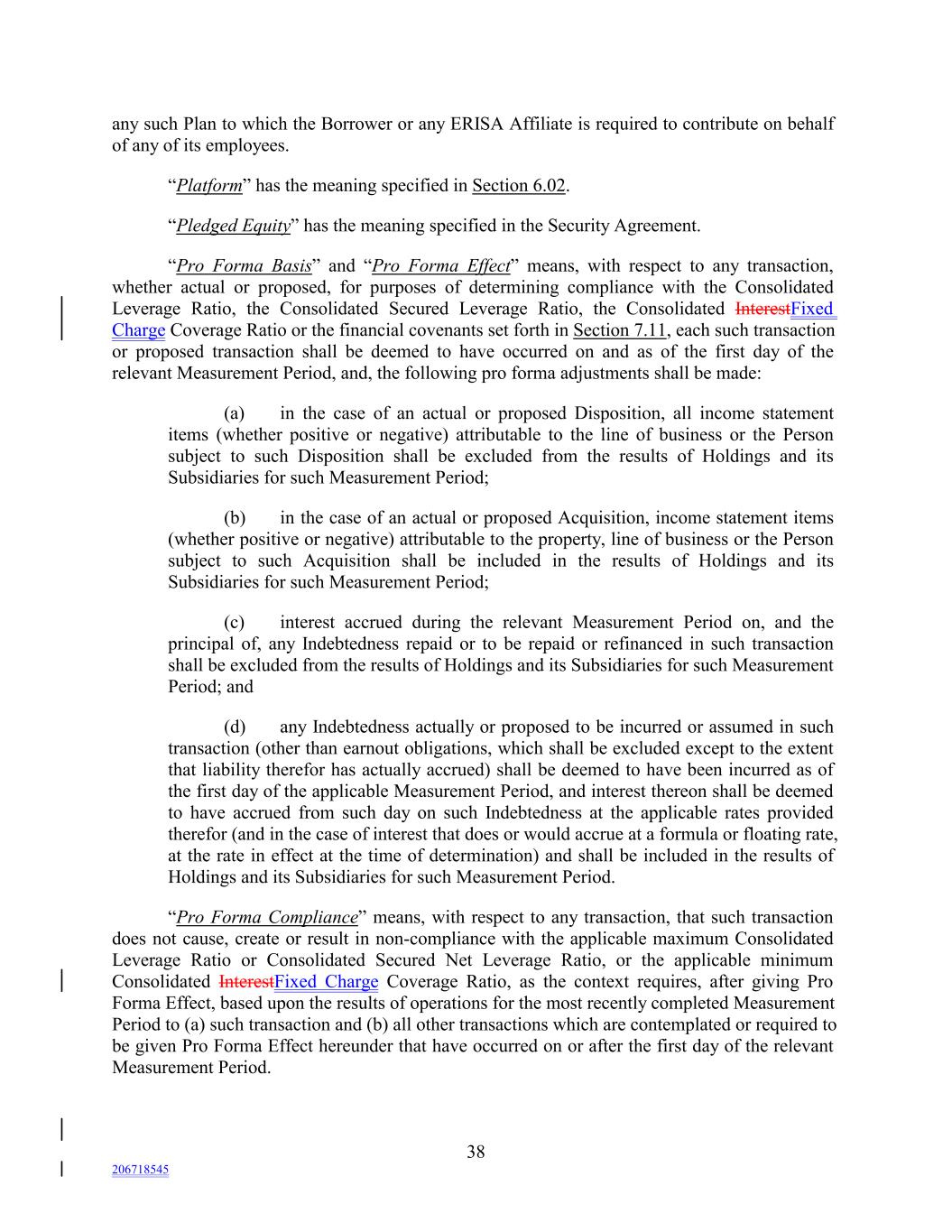 any such Plan to which the Borrower or any ERISA Affiliate is required to contribute on behalf of any of its employees. “Platform” has the meaning specified in Section 6.02. “Pledged Equity” has the meaning specified in the Security Agreement. “Pro Forma Basis” and “Pro Forma Effect” means, with respect to any transaction, whether actual or proposed, for purposes of determining compliance with the Consolidated Leverage Ratio, the Consolidated Secured Leverage Ratio, the Consolidated InterestFixed Charge Coverage Ratio or the financial covenants set forth in Section 7.11, each such transaction or proposed transaction shall be deemed to have occurred on and as of the first day of the relevant Measurement Period, and, the following pro forma adjustments shall be made: (a) in the case of an actual or proposed Disposition, all income statement items (whether positive or negative) attributable to the line of business or the Person subject to such Disposition shall be excluded from the results of Holdings and its Subsidiaries for such Measurement Period; (b) in the case of an actual or proposed Acquisition, income statement items (whether positive or negative) attributable to the property, line of business or the Person subject to such Acquisition shall be included in the results of Holdings and its Subsidiaries for such Measurement Period; (c) interest accrued during the relevant Measurement Period on, and the principal of, any Indebtedness repaid or to be repaid or refinanced in such transaction shall be excluded from the results of Holdings and its Subsidiaries for such Measurement Period; and (d) any Indebtedness actually or proposed to be incurred or assumed in such transaction (other than earnout obligations, which shall be excluded except to the extent that liability therefor has actually accrued) shall be deemed to have been incurred as of the first day of the applicable Measurement Period, and interest thereon shall be deemed to have accrued from such day on such Indebtedness at the applicable rates provided therefor (and in the case of interest that does or would accrue at a formula or floating rate, at the rate in effect at the time of determination) and shall be included in the results of Holdings and its Subsidiaries for such Measurement Period. “Pro Forma Compliance” means, with respect to any transaction, that such transaction does not cause, create or result in non-compliance with the applicable maximum Consolidated Leverage Ratio or Consolidated Secured Net Leverage Ratio, or the applicable minimum Consolidated InterestFixed Charge Coverage Ratio, as the context requires, after giving Pro Forma Effect, based upon the results of operations for the most recently completed Measurement Period to (a) such transaction and (b) all other transactions which are contemplated or required to be given Pro Forma Effect hereunder that have occurred on or after the first day of the relevant Measurement Period. 38 206718545