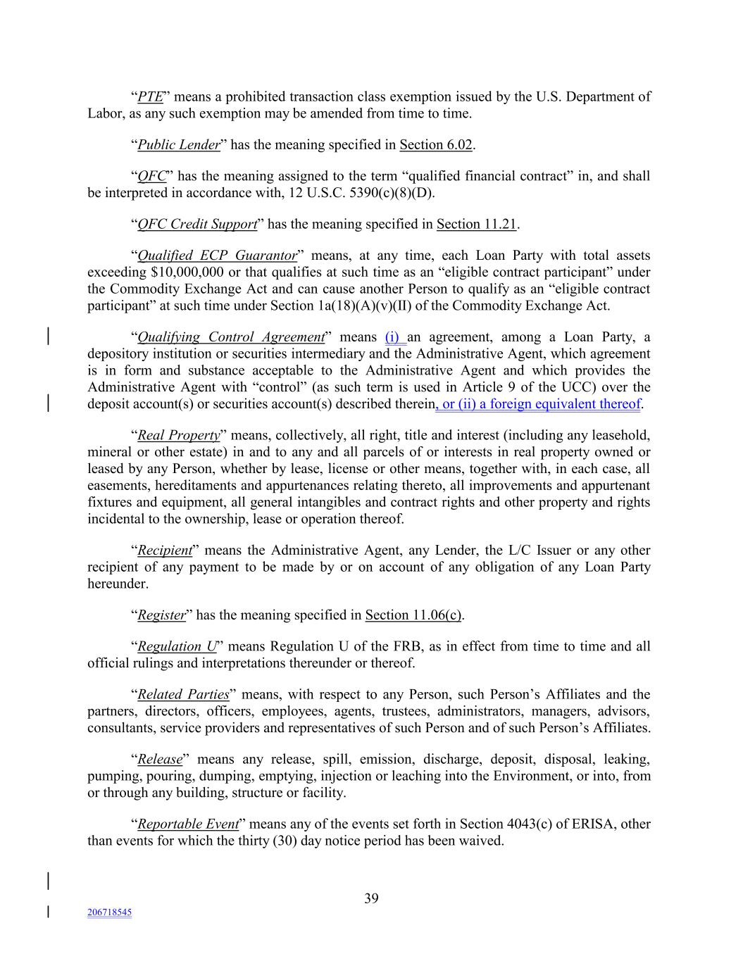 “PTE” means a prohibited transaction class exemption issued by the U.S. Department of Labor, as any such exemption may be amended from time to time. “Public Lender” has the meaning specified in Section 6.02. “QFC” has the meaning assigned to the term “qualified financial contract” in, and shall be interpreted in accordance with, 12 U.S.C. 5390(c)(8)(D). “QFC Credit Support” has the meaning specified in Section 11.21. “Qualified ECP Guarantor” means, at any time, each Loan Party with total assets exceeding $10,000,000 or that qualifies at such time as an “eligible contract participant” under the Commodity Exchange Act and can cause another Person to qualify as an “eligible contract participant” at such time under Section 1a(18)(A)(v)(II) of the Commodity Exchange Act. “Qualifying Control Agreement” means (i) an agreement, among a Loan Party, a depository institution or securities intermediary and the Administrative Agent, which agreement is in form and substance acceptable to the Administrative Agent and which provides the Administrative Agent with “control” (as such term is used in Article 9 of the UCC) over the deposit account(s) or securities account(s) described therein, or (ii) a foreign equivalent thereof. “Real Property” means, collectively, all right, title and interest (including any leasehold, mineral or other estate) in and to any and all parcels of or interests in real property owned or leased by any Person, whether by lease, license or other means, together with, in each case, all easements, hereditaments and appurtenances relating thereto, all improvements and appurtenant fixtures and equipment, all general intangibles and contract rights and other property and rights incidental to the ownership, lease or operation thereof. “Recipient” means the Administrative Agent, any Lender, the L/C Issuer or any other recipient of any payment to be made by or on account of any obligation of any Loan Party hereunder. “Register” has the meaning specified in Section 11.06(c). “Regulation U” means Regulation U of the FRB, as in effect from time to time and all official rulings and interpretations thereunder or thereof. “Related Parties” means, with respect to any Person, such Person’s Affiliates and the partners, directors, officers, employees, agents, trustees, administrators, managers, advisors, consultants, service providers and representatives of such Person and of such Person’s Affiliates. “Release” means any release, spill, emission, discharge, deposit, disposal, leaking, pumping, pouring, dumping, emptying, injection or leaching into the Environment, or into, from or through any building, structure or facility. “Reportable Event” means any of the events set forth in Section 4043(c) of ERISA, other than events for which the thirty (30) day notice period has been waived. 39 206718545
