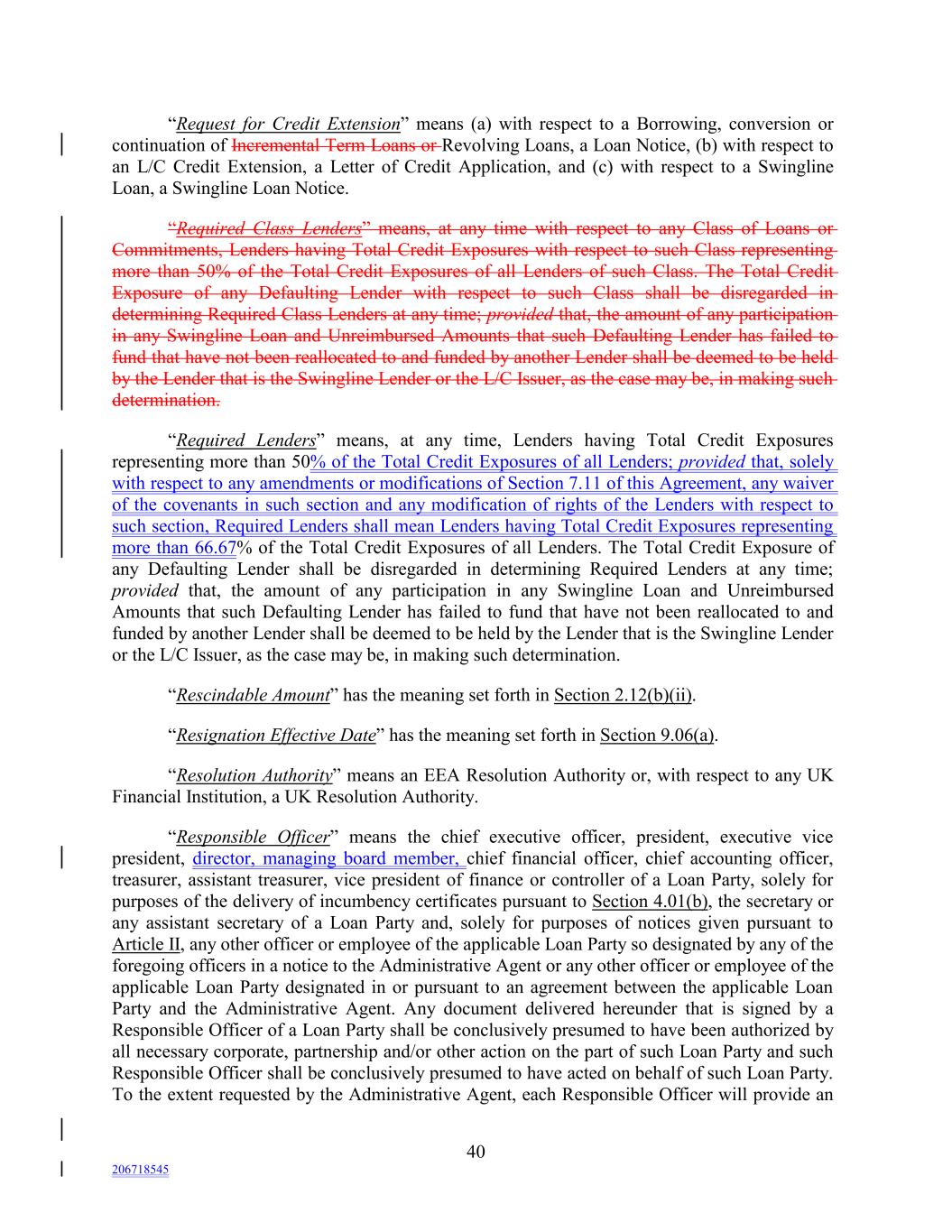 “Request for Credit Extension” means (a) with respect to a Borrowing, conversion or continuation of Incremental Term Loans or Revolving Loans, a Loan Notice, (b) with respect to an L/C Credit Extension, a Letter of Credit Application, and (c) with respect to a Swingline Loan, a Swingline Loan Notice. “Required Class Lenders” means, at any time with respect to any Class of Loans or Commitments, Lenders having Total Credit Exposures with respect to such Class representing more than 50% of the Total Credit Exposures of all Lenders of such Class. The Total Credit Exposure of any Defaulting Lender with respect to such Class shall be disregarded in determining Required Class Lenders at any time; provided that, the amount of any participation in any Swingline Loan and Unreimbursed Amounts that such Defaulting Lender has failed to fund that have not been reallocated to and funded by another Lender shall be deemed to be held by the Lender that is the Swingline Lender or the L/C Issuer, as the case may be, in making such determination. “Required Lenders” means, at any time, Lenders having Total Credit Exposures representing more than 50% of the Total Credit Exposures of all Lenders; provided that, solely with respect to any amendments or modifications of Section 7.11 of this Agreement, any waiver of the covenants in such section and any modification of rights of the Lenders with respect to such section, Required Lenders shall mean Lenders having Total Credit Exposures representing more than 66.67% of the Total Credit Exposures of all Lenders. The Total Credit Exposure of any Defaulting Lender shall be disregarded in determining Required Lenders at any time; provided that, the amount of any participation in any Swingline Loan and Unreimbursed Amounts that such Defaulting Lender has failed to fund that have not been reallocated to and funded by another Lender shall be deemed to be held by the Lender that is the Swingline Lender or the L/C Issuer, as the case may be, in making such determination. “Rescindable Amount” has the meaning set forth in Section 2.12(b)(ii). “Resignation Effective Date” has the meaning set forth in Section 9.06(a). “Resolution Authority” means an EEA Resolution Authority or, with respect to any UK Financial Institution, a UK Resolution Authority. “Responsible Officer” means the chief executive officer, president, executive vice president, director, managing board member, chief financial officer, chief accounting officer, treasurer, assistant treasurer, vice president of finance or controller of a Loan Party, solely for purposes of the delivery of incumbency certificates pursuant to Section 4.01(b), the secretary or any assistant secretary of a Loan Party and, solely for purposes of notices given pursuant to Article II, any other officer or employee of the applicable Loan Party so designated by any of the foregoing officers in a notice to the Administrative Agent or any other officer or employee of the applicable Loan Party designated in or pursuant to an agreement between the applicable Loan Party and the Administrative Agent. Any document delivered hereunder that is signed by a Responsible Officer of a Loan Party shall be conclusively presumed to have been authorized by all necessary corporate, partnership and/or other action on the part of such Loan Party and such Responsible Officer shall be conclusively presumed to have acted on behalf of such Loan Party. To the extent requested by the Administrative Agent, each Responsible Officer will provide an 40 206718545
