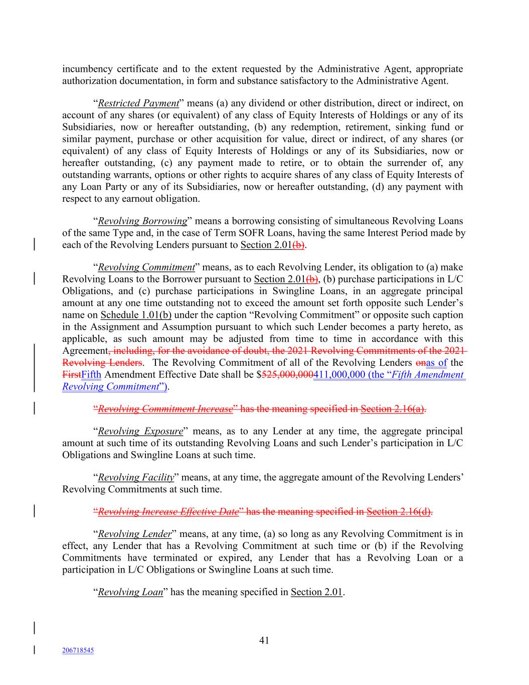 incumbency certificate and to the extent requested by the Administrative Agent, appropriate authorization documentation, in form and substance satisfactory to the Administrative Agent. “Restricted Payment” means (a) any dividend or other distribution, direct or indirect, on account of any shares (or equivalent) of any class of Equity Interests of Holdings or any of its Subsidiaries, now or hereafter outstanding, (b) any redemption, retirement, sinking fund or similar payment, purchase or other acquisition for value, direct or indirect, of any shares (or equivalent) of any class of Equity Interests of Holdings or any of its Subsidiaries, now or hereafter outstanding, (c) any payment made to retire, or to obtain the surrender of, any outstanding warrants, options or other rights to acquire shares of any class of Equity Interests of any Loan Party or any of its Subsidiaries, now or hereafter outstanding, (d) any payment with respect to any earnout obligation. “Revolving Borrowing” means a borrowing consisting of simultaneous Revolving Loans of the same Type and, in the case of Term SOFR Loans, having the same Interest Period made by each of the Revolving Lenders pursuant to Section 2.01(b). “Revolving Commitment” means, as to each Revolving Lender, its obligation to (a) make Revolving Loans to the Borrower pursuant to Section 2.01(b), (b) purchase participations in L/C Obligations, and (c) purchase participations in Swingline Loans, in an aggregate principal amount at any one time outstanding not to exceed the amount set forth opposite such Lender’s name on Schedule 1.01(b) under the caption “Revolving Commitment” or opposite such caption in the Assignment and Assumption pursuant to which such Lender becomes a party hereto, as applicable, as such amount may be adjusted from time to time in accordance with this Agreement, including, for the avoidance of doubt, the 2021 Revolving Commitments of the 2021 Revolving Lenders. The Revolving Commitment of all of the Revolving Lenders onas of the FirstFifth Amendment Effective Date shall be $525,000,000411,000,000 (the “Fifth Amendment Revolving Commitment”). “Revolving Commitment Increase” has the meaning specified in Section 2.16(a). “Revolving Exposure” means, as to any Lender at any time, the aggregate principal amount at such time of its outstanding Revolving Loans and such Lender’s participation in L/C Obligations and Swingline Loans at such time. “Revolving Facility” means, at any time, the aggregate amount of the Revolving Lenders’ Revolving Commitments at such time. “Revolving Increase Effective Date” has the meaning specified in Section 2.16(d). “Revolving Lender” means, at any time, (a) so long as any Revolving Commitment is in effect, any Lender that has a Revolving Commitment at such time or (b) if the Revolving Commitments have terminated or expired, any Lender that has a Revolving Loan or a participation in L/C Obligations or Swingline Loans at such time. “Revolving Loan” has the meaning specified in Section 2.01. 41 206718545