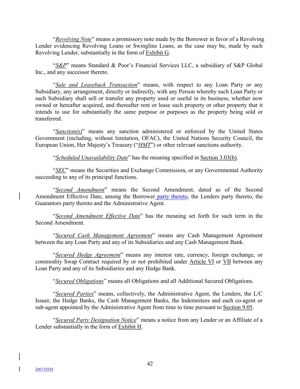 “Revolving Note” means a promissory note made by the Borrower in favor of a Revolving Lender evidencing Revolving Loans or Swingline Loans, as the case may be, made by such Revolving Lender, substantially in the form of Exhibit G. “S&P” means Standard & Poor’s Financial Services LLC, a subsidiary of S&P Global Inc., and any successor thereto. “Sale and Leaseback Transaction” means, with respect to any Loan Party or any Subsidiary, any arrangement, directly or indirectly, with any Person whereby such Loan Party or such Subsidiary shall sell or transfer any property used or useful in its business, whether now owned or hereafter acquired, and thereafter rent or lease such property or other property that it intends to use for substantially the same purpose or purposes as the property being sold or transferred. “Sanction(s)” means any sanction administered or enforced by the United States Government (including, without limitation, OFAC), the United Nations Security Council, the European Union, Her Majesty’s Treasury (“HMT”) or other relevant sanctions authority. “Scheduled Unavailability Date” has the meaning specified in Section 3.03(b). “SEC” means the Securities and Exchange Commission, or any Governmental Authority succeeding to any of its principal functions. “Second Amendment” means the Second Amendment, dated as of the Second Amendment Effective Date, among the Borrower party thereto, the Lenders party thereto, the Guarantors party thereto and the Administrative Agent. “Second Amendment Effective Date” has the meaning set forth for such term in the Second Amendment. “Secured Cash Management Agreement” means any Cash Management Agreement between the any Loan Party and any of its Subsidiaries and any Cash Management Bank. “Secured Hedge Agreement” means any interest rate, currency, foreign exchange, or commodity Swap Contract required by or not prohibited under Article VI or VII between any Loan Party and any of its Subsidiaries and any Hedge Bank. “Secured Obligations” means all Obligations and all Additional Secured Obligations. “Secured Parties” means, collectively, the Administrative Agent, the Lenders, the L/C Issuer, the Hedge Banks, the Cash Management Banks, the Indemnitees and each co-agent or sub-agent appointed by the Administrative Agent from time to time pursuant to Section 9.05. “Secured Party Designation Notice” means a notice from any Lender or an Affiliate of a Lender substantially in the form of Exhibit H. 42 206718545