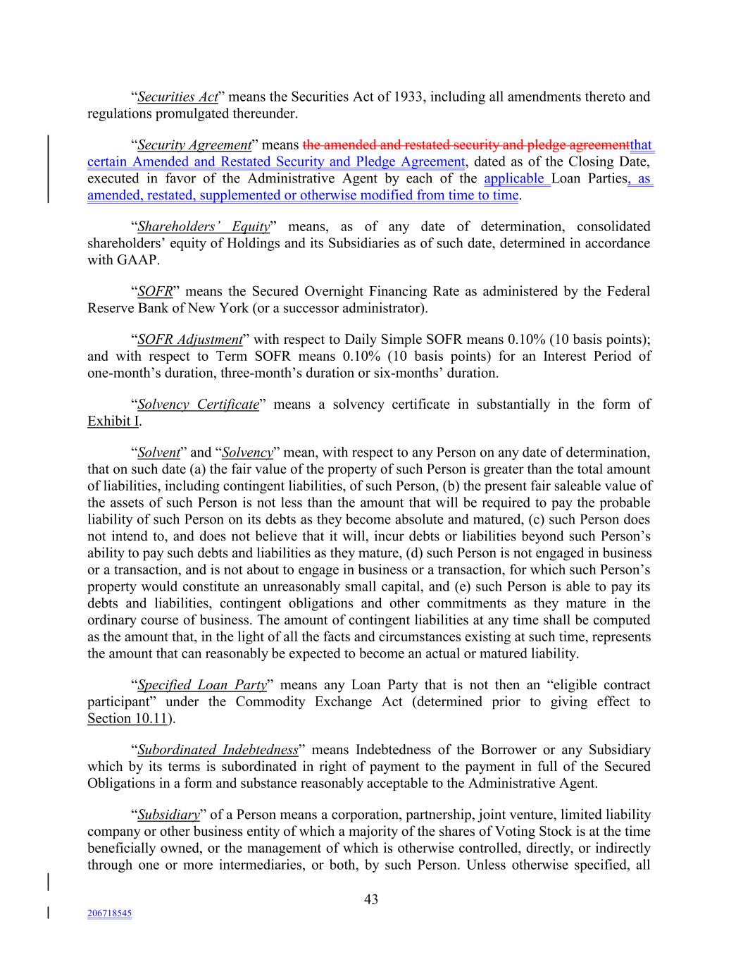 “Securities Act” means the Securities Act of 1933, including all amendments thereto and regulations promulgated thereunder. “Security Agreement” means the amended and restated security and pledge agreementthat certain Amended and Restated Security and Pledge Agreement, dated as of the Closing Date, executed in favor of the Administrative Agent by each of the applicable Loan Parties, as amended, restated, supplemented or otherwise modified from time to time. “Shareholders’ Equity” means, as of any date of determination, consolidated shareholders’ equity of Holdings and its Subsidiaries as of such date, determined in accordance with GAAP. “SOFR” means the Secured Overnight Financing Rate as administered by the Federal Reserve Bank of New York (or a successor administrator). “SOFR Adjustment” with respect to Daily Simple SOFR means 0.10% (10 basis points); and with respect to Term SOFR means 0.10% (10 basis points) for an Interest Period of one-month’s duration, three-month’s duration or six-months’ duration. “Solvency Certificate” means a solvency certificate in substantially in the form of Exhibit I. “Solvent” and “Solvency” mean, with respect to any Person on any date of determination, that on such date (a) the fair value of the property of such Person is greater than the total amount of liabilities, including contingent liabilities, of such Person, (b) the present fair saleable value of the assets of such Person is not less than the amount that will be required to pay the probable liability of such Person on its debts as they become absolute and matured, (c) such Person does not intend to, and does not believe that it will, incur debts or liabilities beyond such Person’s ability to pay such debts and liabilities as they mature, (d) such Person is not engaged in business or a transaction, and is not about to engage in business or a transaction, for which such Person’s property would constitute an unreasonably small capital, and (e) such Person is able to pay its debts and liabilities, contingent obligations and other commitments as they mature in the ordinary course of business. The amount of contingent liabilities at any time shall be computed as the amount that, in the light of all the facts and circumstances existing at such time, represents the amount that can reasonably be expected to become an actual or matured liability. “Specified Loan Party” means any Loan Party that is not then an “eligible contract participant” under the Commodity Exchange Act (determined prior to giving effect to Section 10.11). “Subordinated Indebtedness” means Indebtedness of the Borrower or any Subsidiary which by its terms is subordinated in right of payment to the payment in full of the Secured Obligations in a form and substance reasonably acceptable to the Administrative Agent. “Subsidiary” of a Person means a corporation, partnership, joint venture, limited liability company or other business entity of which a majority of the shares of Voting Stock is at the time beneficially owned, or the management of which is otherwise controlled, directly, or indirectly through one or more intermediaries, or both, by such Person. Unless otherwise specified, all 43 206718545