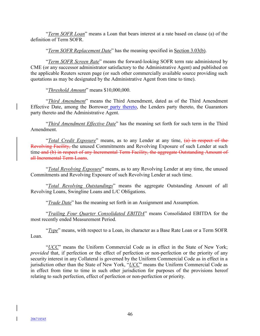 “Term SOFR Loan” means a Loan that bears interest at a rate based on clause (a) of the definition of Term SOFR. “Term SOFR Replacement Date” has the meaning specified in Section 3.03(b). “Term SOFR Screen Rate” means the forward-looking SOFR term rate administered by CME (or any successor administrator satisfactory to the Administrative Agent) and published on the applicable Reuters screen page (or such other commercially available source providing such quotations as may be designated by the Administrative Agent from time to time). “Threshold Amount” means $10,000,000. “Third Amendment” means the Third Amendment, dated as of the Third Amendment Effective Date, among the Borrower party thereto, the Lenders party thereto, the Guarantors party thereto and the Administrative Agent. “Third Amendment Effective Date” has the meaning set forth for such term in the Third Amendment. “Total Credit Exposure” means, as to any Lender at any time, (a) in respect of the Revolving Facility, the unused Commitments and Revolving Exposure of such Lender at such time and (b) in respect of any Incremental Term Facility, the aggregate Outstanding Amount of all Incremental Term Loans. “Total Revolving Exposure” means, as to any Revolving Lender at any time, the unused Commitments and Revolving Exposure of such Revolving Lender at such time. “Total Revolving Outstandings” means the aggregate Outstanding Amount of all Revolving Loans, Swingline Loans and L/C Obligations. “Trade Date” has the meaning set forth in an Assignment and Assumption. “Trailing Four Quarter Consolidated EBITDA” means Consolidated EBITDA for the most recently ended Measurement Period. “Type” means, with respect to a Loan, its character as a Base Rate Loan or a Term SOFR Loan. “UCC” means the Uniform Commercial Code as in effect in the State of New York; provided that, if perfection or the effect of perfection or non-perfection or the priority of any security interest in any Collateral is governed by the Uniform Commercial Code as in effect in a jurisdiction other than the State of New York, “UCC” means the Uniform Commercial Code as in effect from time to time in such other jurisdiction for purposes of the provisions hereof relating to such perfection, effect of perfection or non-perfection or priority. 46 206718545