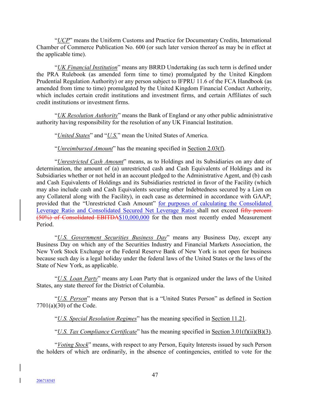 “UCP” means the Uniform Customs and Practice for Documentary Credits, International Chamber of Commerce Publication No. 600 (or such later version thereof as may be in effect at the applicable time). “UK Financial Institution” means any BRRD Undertaking (as such term is defined under the PRA Rulebook (as amended form time to time) promulgated by the United Kingdom Prudential Regulation Authority) or any person subject to IFPRU 11.6 of the FCA Handbook (as amended from time to time) promulgated by the United Kingdom Financial Conduct Authority, which includes certain credit institutions and investment firms, and certain Affiliates of such credit institutions or investment firms. “UK Resolution Authority” means the Bank of England or any other public administrative authority having responsibility for the resolution of any UK Financial Institution. “United States” and “U.S.” mean the United States of America. “Unreimbursed Amount” has the meaning specified in Section 2.03(f). “Unrestricted Cash Amount” means, as to Holdings and its Subsidiaries on any date of determination, the amount of (a) unrestricted cash and Cash Equivalents of Holdings and its Subsidiaries whether or not held in an account pledged to the Administrative Agent, and (b) cash and Cash Equivalents of Holdings and its Subsidiaries restricted in favor of the Facility (which may also include cash and Cash Equivalents securing other Indebtedness secured by a Lien on any Collateral along with the Facility), in each case as determined in accordance with GAAP; provided that the “Unrestricted Cash Amount” for purposes of calculating the Consolidated Leverage Ratio and Consolidated Secured Net Leverage Ratio shall not exceed fifty percent (50%) of Consolidated EBITDA$10,000,000 for the then most recently ended Measurement Period. “U.S. Government Securities Business Day” means any Business Day, except any Business Day on which any of the Securities Industry and Financial Markets Association, the New York Stock Exchange or the Federal Reserve Bank of New York is not open for business because such day is a legal holiday under the federal laws of the United States or the laws of the State of New York, as applicable. “U.S. Loan Party” means any Loan Party that is organized under the laws of the United States, any state thereof for the District of Columbia. “U.S. Person” means any Person that is a “United States Person” as defined in Section 7701(a)(30) of the Code. “U.S. Special Resolution Regimes” has the meaning specified in Section 11.21. “U.S. Tax Compliance Certificate” has the meaning specified in Section 3.01(f)(ii)(B)(3). “Voting Stock” means, with respect to any Person, Equity Interests issued by such Person the holders of which are ordinarily, in the absence of contingencies, entitled to vote for the 47 206718545