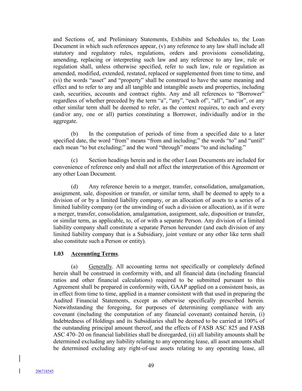 and Sections of, and Preliminary Statements, Exhibits and Schedules to, the Loan Document in which such references appear, (v) any reference to any law shall include all statutory and regulatory rules, regulations, orders and provisions consolidating, amending, replacing or interpreting such law and any reference to any law, rule or regulation shall, unless otherwise specified, refer to such law, rule or regulation as amended, modified, extended, restated, replaced or supplemented from time to time, and (vi) the words “asset” and “property” shall be construed to have the same meaning and effect and to refer to any and all tangible and intangible assets and properties, including cash, securities, accounts and contract rights. Any and all references to “Borrower” regardless of whether preceded by the term “a”, “any”, “each of”, “all”, “and/or”, or any other similar term shall be deemed to refer, as the context requires, to each and every (and/or any, one or all) parties constituting a Borrower, individually and/or in the aggregate. (b) In the computation of periods of time from a specified date to a later specified date, the word “from” means “from and including;” the words “to” and “until” each mean “to but excluding;” and the word “through” means “to and including.” (c) Section headings herein and in the other Loan Documents are included for convenience of reference only and shall not affect the interpretation of this Agreement or any other Loan Document. (d) Any reference herein to a merger, transfer, consolidation, amalgamation, assignment, sale, disposition or transfer, or similar term, shall be deemed to apply to a division of or by a limited liability company, or an allocation of assets to a series of a limited liability company (or the unwinding of such a division or allocation), as if it were a merger, transfer, consolidation, amalgamation, assignment, sale, disposition or transfer, or similar term, as applicable, to, of or with a separate Person. Any division of a limited liability company shall constitute a separate Person hereunder (and each division of any limited liability company that is a Subsidiary, joint venture or any other like term shall also constitute such a Person or entity). 1.03 Accounting Terms. (a) Generally. All accounting terms not specifically or completely defined herein shall be construed in conformity with, and all financial data (including financial ratios and other financial calculations) required to be submitted pursuant to this Agreement shall be prepared in conformity with, GAAP applied on a consistent basis, as in effect from time to time, applied in a manner consistent with that used in preparing the Audited Financial Statements, except as otherwise specifically prescribed herein. Notwithstanding the foregoing, for purposes of determining compliance with any covenant (including the computation of any financial covenant) contained herein, (i) Indebtedness of Holdings and its Subsidiaries shall be deemed to be carried at 100% of the outstanding principal amount thereof, and the effects of FASB ASC 825 and FASB ASC 470–20 on financial liabilities shall be disregarded, (ii) all liability amounts shall be determined excluding any liability relating to any operating lease, all asset amounts shall be determined excluding any right-of-use assets relating to any operating lease, all 49 206718545