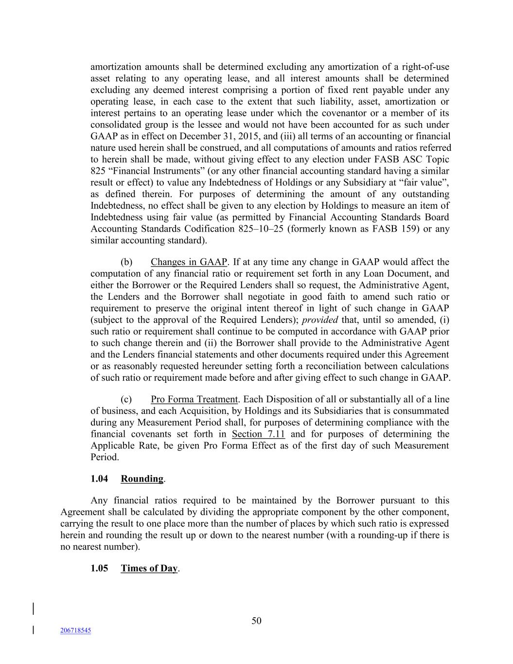amortization amounts shall be determined excluding any amortization of a right-of-use asset relating to any operating lease, and all interest amounts shall be determined excluding any deemed interest comprising a portion of fixed rent payable under any operating lease, in each case to the extent that such liability, asset, amortization or interest pertains to an operating lease under which the covenantor or a member of its consolidated group is the lessee and would not have been accounted for as such under GAAP as in effect on December 31, 2015, and (iii) all terms of an accounting or financial nature used herein shall be construed, and all computations of amounts and ratios referred to herein shall be made, without giving effect to any election under FASB ASC Topic 825 “Financial Instruments” (or any other financial accounting standard having a similar result or effect) to value any Indebtedness of Holdings or any Subsidiary at “fair value”, as defined therein. For purposes of determining the amount of any outstanding Indebtedness, no effect shall be given to any election by Holdings to measure an item of Indebtedness using fair value (as permitted by Financial Accounting Standards Board Accounting Standards Codification 825–10–25 (formerly known as FASB 159) or any similar accounting standard). (b) Changes in GAAP. If at any time any change in GAAP would affect the computation of any financial ratio or requirement set forth in any Loan Document, and either the Borrower or the Required Lenders shall so request, the Administrative Agent, the Lenders and the Borrower shall negotiate in good faith to amend such ratio or requirement to preserve the original intent thereof in light of such change in GAAP (subject to the approval of the Required Lenders); provided that, until so amended, (i) such ratio or requirement shall continue to be computed in accordance with GAAP prior to such change therein and (ii) the Borrower shall provide to the Administrative Agent and the Lenders financial statements and other documents required under this Agreement or as reasonably requested hereunder setting forth a reconciliation between calculations of such ratio or requirement made before and after giving effect to such change in GAAP. (c) Pro Forma Treatment. Each Disposition of all or substantially all of a line of business, and each Acquisition, by Holdings and its Subsidiaries that is consummated during any Measurement Period shall, for purposes of determining compliance with the financial covenants set forth in Section 7.11 and for purposes of determining the Applicable Rate, be given Pro Forma Effect as of the first day of such Measurement Period. 1.04 Rounding. Any financial ratios required to be maintained by the Borrower pursuant to this Agreement shall be calculated by dividing the appropriate component by the other component, carrying the result to one place more than the number of places by which such ratio is expressed herein and rounding the result up or down to the nearest number (with a rounding-up if there is no nearest number). 1.05 Times of Day. 50 206718545