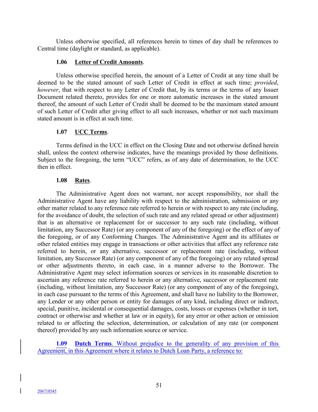 Unless otherwise specified, all references herein to times of day shall be references to Central time (daylight or standard, as applicable). 1.06 Letter of Credit Amounts. Unless otherwise specified herein, the amount of a Letter of Credit at any time shall be deemed to be the stated amount of such Letter of Credit in effect at such time; provided, however, that with respect to any Letter of Credit that, by its terms or the terms of any Issuer Document related thereto, provides for one or more automatic increases in the stated amount thereof, the amount of such Letter of Credit shall be deemed to be the maximum stated amount of such Letter of Credit after giving effect to all such increases, whether or not such maximum stated amount is in effect at such time. 1.07 UCC Terms. Terms defined in the UCC in effect on the Closing Date and not otherwise defined herein shall, unless the context otherwise indicates, have the meanings provided by those definitions. Subject to the foregoing, the term “UCC” refers, as of any date of determination, to the UCC then in effect. 1.08 Rates. The Administrative Agent does not warrant, nor accept responsibility, nor shall the Administrative Agent have any liability with respect to the administration, submission or any other matter related to any reference rate referred to herein or with respect to any rate (including, for the avoidance of doubt, the selection of such rate and any related spread or other adjustment) that is an alternative or replacement for or successor to any such rate (including, without limitation, any Successor Rate) (or any component of any of the foregoing) or the effect of any of the foregoing, or of any Conforming Changes. The Administrative Agent and its affiliates or other related entities may engage in transactions or other activities that affect any reference rate referred to herein, or any alternative, successor or replacement rate (including, without limitation, any Successor Rate) (or any component of any of the foregoing) or any related spread or other adjustments thereto, in each case, in a manner adverse to the Borrower. The Administrative Agent may select information sources or services in its reasonable discretion to ascertain any reference rate referred to herein or any alternative, successor or replacement rate (including, without limitation, any Successor Rate) (or any component of any of the foregoing), in each case pursuant to the terms of this Agreement, and shall have no liability to the Borrower, any Lender or any other person or entity for damages of any kind, including direct or indirect, special, punitive, incidental or consequential damages, costs, losses or expenses (whether in tort, contract or otherwise and whether at law or in equity), for any error or other action or omission related to or affecting the selection, determination, or calculation of any rate (or component thereof) provided by any such information source or service. 1.09 Dutch Terms. Without prejudice to the generality of any provision of this Agreement, in this Agreement where it relates to Dutch Loan Party, a reference to: 51 206718545