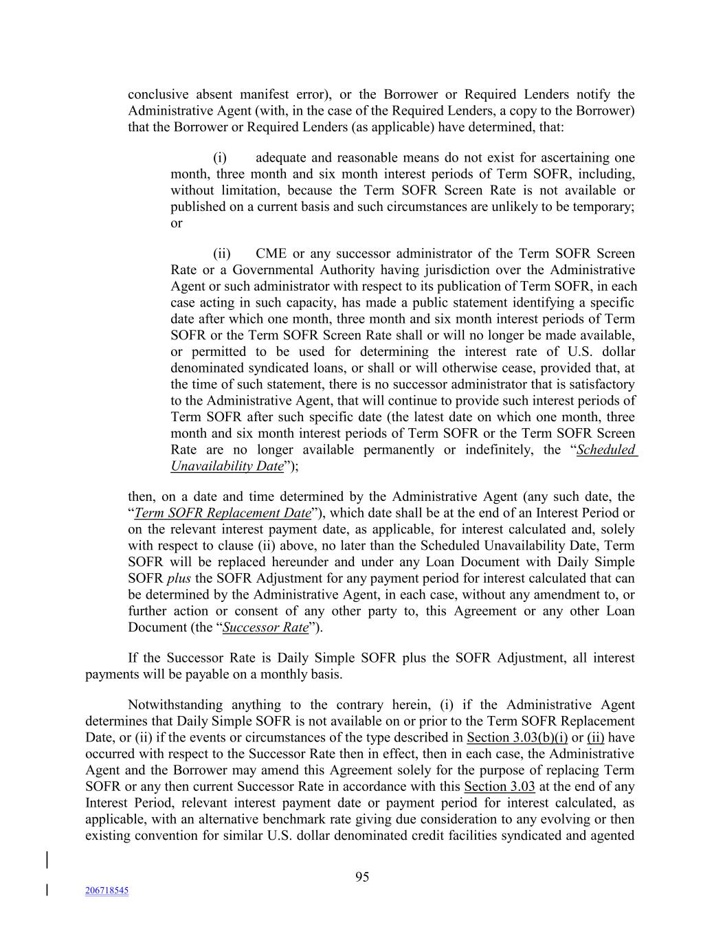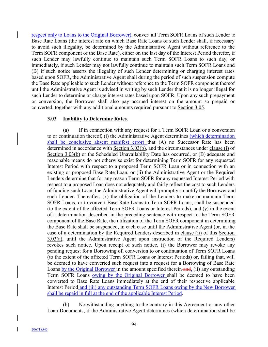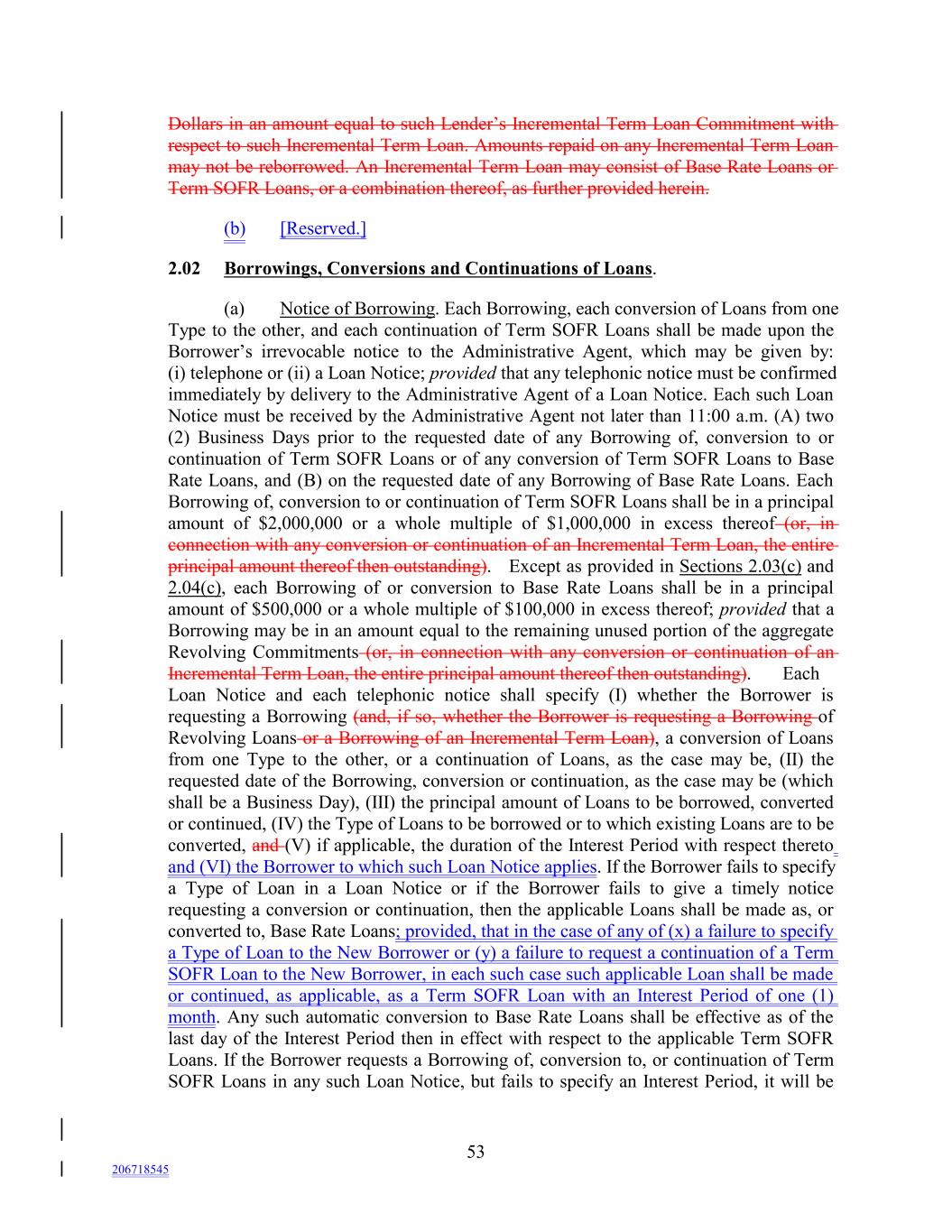 Dollars in an amount equal to such Lender’s Incremental Term Loan Commitment with respect to such Incremental Term Loan. Amounts repaid on any Incremental Term Loan may not be reborrowed. An Incremental Term Loan may consist of Base Rate Loans or Term SOFR Loans, or a combination thereof, as further provided herein. (b) [Reserved.] 2.02 Borrowings, Conversions and Continuations of Loans. (a) Notice of Borrowing. Each Borrowing, each conversion of Loans from one Type to the other, and each continuation of Term SOFR Loans shall be made upon the Borrower’s irrevocable notice to the Administrative Agent, which may be given by: (i) telephone or (ii) a Loan Notice; provided that any telephonic notice must be confirmed immediately by delivery to the Administrative Agent of a Loan Notice. Each such Loan Notice must be received by the Administrative Agent not later than 11:00 a.m. (A) two (2) Business Days prior to the requested date of any Borrowing of, conversion to or continuation of Term SOFR Loans or of any conversion of Term SOFR Loans to Base Rate Loans, and (B) on the requested date of any Borrowing of Base Rate Loans. Each Borrowing of, conversion to or continuation of Term SOFR Loans shall be in a principal amount of $2,000,000 or a whole multiple of $1,000,000 in excess thereof (or, in connection with any conversion or continuation of an Incremental Term Loan, the entire principal amount thereof then outstanding). Except as provided in Sections 2.03(c) and 2.04(c), each Borrowing of or conversion to Base Rate Loans shall be in a principal amount of $500,000 or a whole multiple of $100,000 in excess thereof; provided that a Borrowing may be in an amount equal to the remaining unused portion of the aggregate Revolving Commitments (or, in connection with any conversion or continuation of an Incremental Term Loan, the entire principal amount thereof then outstanding). Each Loan Notice and each telephonic notice shall specify (I) whether the Borrower is requesting a Borrowing (and, if so, whether the Borrower is requesting a Borrowing of Revolving Loans or a Borrowing of an Incremental Term Loan), a conversion of Loans from one Type to the other, or a continuation of Loans, as the case may be, (II) the requested date of the Borrowing, conversion or continuation, as the case may be (which shall be a Business Day), (III) the principal amount of Loans to be borrowed, converted or continued, (IV) the Type of Loans to be borrowed or to which existing Loans are to be converted, and (V) if applicable, the duration of the Interest Period with respect thereto and (VI) the Borrower to which such Loan Notice applies. If the Borrower fails to specify a Type of Loan in a Loan Notice or if the Borrower fails to give a timely notice requesting a conversion or continuation, then the applicable Loans shall be made as, or converted to, Base Rate Loans; provided, that in the case of any of (x) a failure to specify a Type of Loan to the New Borrower or (y) a failure to request a continuation of a Term SOFR Loan to the New Borrower, in each such case such applicable Loan shall be made or continued, as applicable, as a Term SOFR Loan with an Interest Period of one (1) month. Any such automatic conversion to Base Rate Loans shall be effective as of the last day of the Interest Period then in effect with respect to the applicable Term SOFR Loans. If the Borrower requests a Borrowing of, conversion to, or continuation of Term SOFR Loans in any such Loan Notice, but fails to specify an Interest Period, it will be 53 206718545