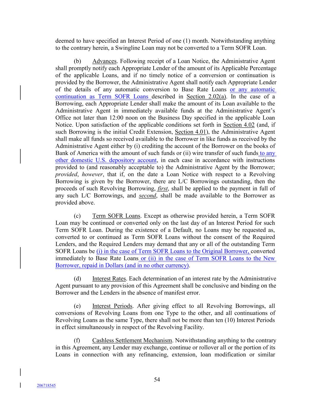 deemed to have specified an Interest Period of one (1) month. Notwithstanding anything to the contrary herein, a Swingline Loan may not be converted to a Term SOFR Loan. (b) Advances. Following receipt of a Loan Notice, the Administrative Agent shall promptly notify each Appropriate Lender of the amount of its Applicable Percentage of the applicable Loans, and if no timely notice of a conversion or continuation is provided by the Borrower, the Administrative Agent shall notify each Appropriate Lender of the details of any automatic conversion to Base Rate Loans or any automatic continuation as Term SOFR Loans described in Section 2.02(a). In the case of a Borrowing, each Appropriate Lender shall make the amount of its Loan available to the Administrative Agent in immediately available funds at the Administrative Agent’s Office not later than 12:00 noon on the Business Day specified in the applicable Loan Notice. Upon satisfaction of the applicable conditions set forth in Section 4.02 (and, if such Borrowing is the initial Credit Extension, Section 4.01), the Administrative Agent shall make all funds so received available to the Borrower in like funds as received by the Administrative Agent either by (i) crediting the account of the Borrower on the books of Bank of America with the amount of such funds or (ii) wire transfer of such funds to any other domestic U.S. depository account, in each case in accordance with instructions provided to (and reasonably acceptable to) the Administrative Agent by the Borrower; provided, however, that if, on the date a Loan Notice with respect to a Revolving Borrowing is given by the Borrower, there are L/C Borrowings outstanding, then the proceeds of such Revolving Borrowing, first, shall be applied to the payment in full of any such L/C Borrowings, and second, shall be made available to the Borrower as provided above. (c) Term SOFR Loans. Except as otherwise provided herein, a Term SOFR Loan may be continued or converted only on the last day of an Interest Period for such Term SOFR Loan. During the existence of a Default, no Loans may be requested as, converted to or continued as Term SOFR Loans without the consent of the Required Lenders, and the Required Lenders may demand that any or all of the outstanding Term SOFR Loans be (i) in the case of Term SOFR Loans to the Original Borrower, converted immediately to Base Rate Loans or (ii) in the case of Term SOFR Loans to the New Borrower, repaid in Dollars (and in no other currency). (d) Interest Rates. Each determination of an interest rate by the Administrative Agent pursuant to any provision of this Agreement shall be conclusive and binding on the Borrower and the Lenders in the absence of manifest error. (e) Interest Periods. After giving effect to all Revolving Borrowings, all conversions of Revolving Loans from one Type to the other, and all continuations of Revolving Loans as the same Type, there shall not be more than ten (10) Interest Periods in effect simultaneously in respect of the Revolving Facility. (f) Cashless Settlement Mechanism. Notwithstanding anything to the contrary in this Agreement, any Lender may exchange, continue or rollover all or the portion of its Loans in connection with any refinancing, extension, loan modification or similar 54 206718545