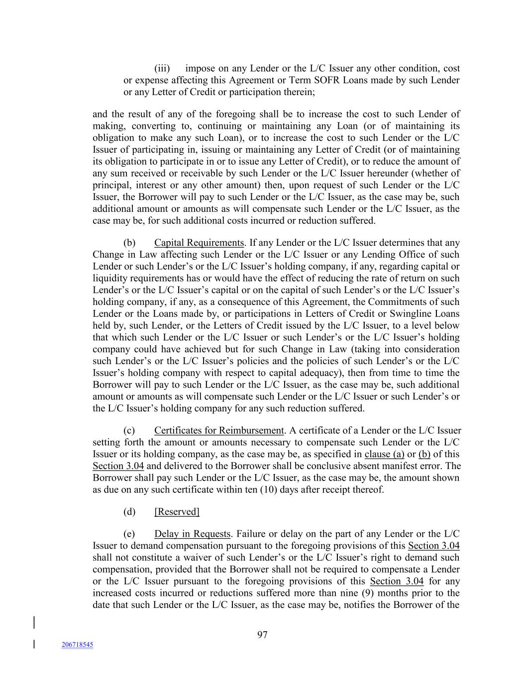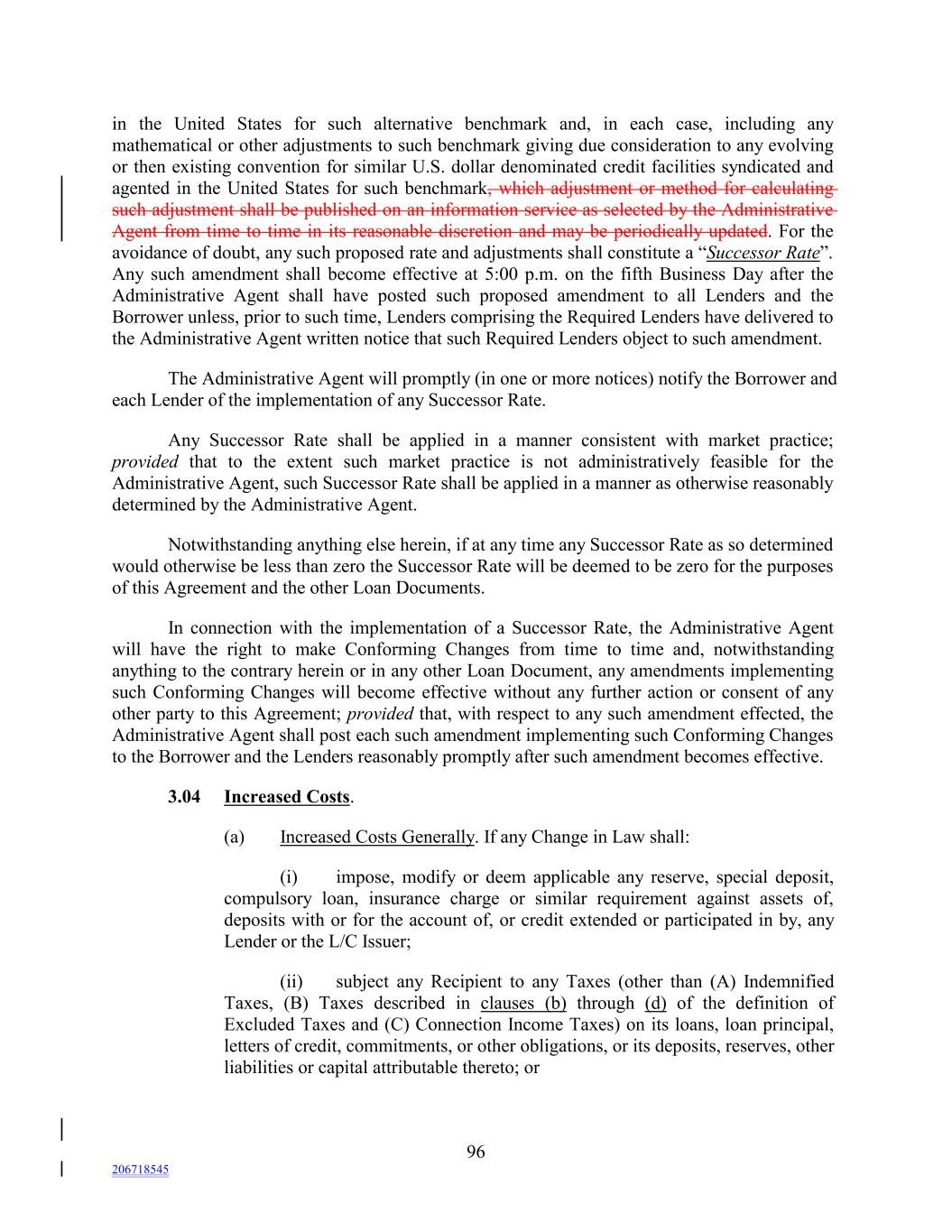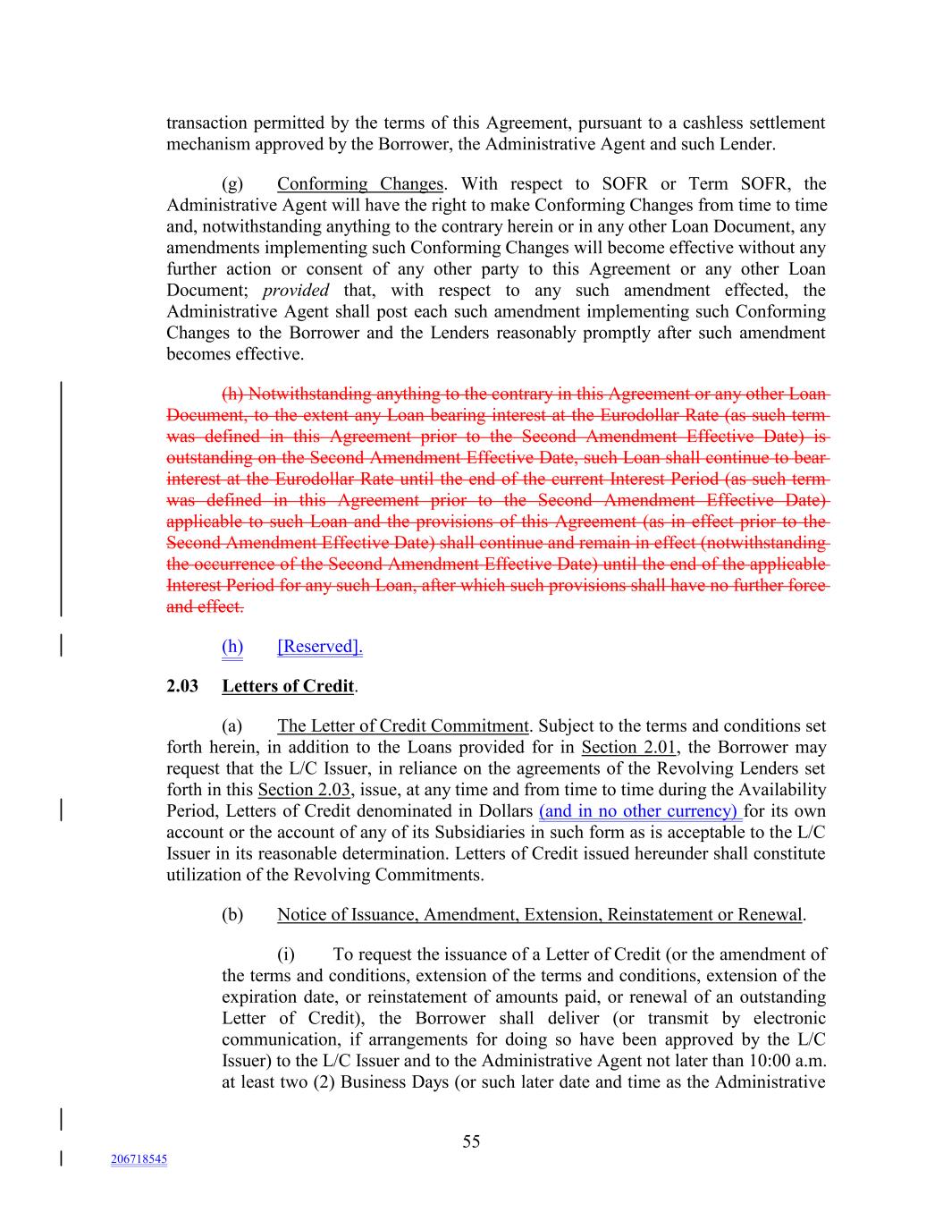 transaction permitted by the terms of this Agreement, pursuant to a cashless settlement mechanism approved by the Borrower, the Administrative Agent and such Lender. (g) Conforming Changes. With respect to SOFR or Term SOFR, the Administrative Agent will have the right to make Conforming Changes from time to time and, notwithstanding anything to the contrary herein or in any other Loan Document, any amendments implementing such Conforming Changes will become effective without any further action or consent of any other party to this Agreement or any other Loan Document; provided that, with respect to any such amendment effected, the Administrative Agent shall post each such amendment implementing such Conforming Changes to the Borrower and the Lenders reasonably promptly after such amendment becomes effective. (h) Notwithstanding anything to the contrary in this Agreement or any other Loan Document, to the extent any Loan bearing interest at the Eurodollar Rate (as such term was defined in this Agreement prior to the Second Amendment Effective Date) is outstanding on the Second Amendment Effective Date, such Loan shall continue to bear interest at the Eurodollar Rate until the end of the current Interest Period (as such term was defined in this Agreement prior to the Second Amendment Effective Date) applicable to such Loan and the provisions of this Agreement (as in effect prior to the Second Amendment Effective Date) shall continue and remain in effect (notwithstanding the occurrence of the Second Amendment Effective Date) until the end of the applicable Interest Period for any such Loan, after which such provisions shall have no further force and effect. (h) [Reserved]. 2.03 Letters of Credit. (a) The Letter of Credit Commitment. Subject to the terms and conditions set forth herein, in addition to the Loans provided for in Section 2.01, the Borrower may request that the L/C Issuer, in reliance on the agreements of the Revolving Lenders set forth in this Section 2.03, issue, at any time and from time to time during the Availability Period, Letters of Credit denominated in Dollars (and in no other currency) for its own account or the account of any of its Subsidiaries in such form as is acceptable to the L/C Issuer in its reasonable determination. Letters of Credit issued hereunder shall constitute utilization of the Revolving Commitments. (b) Notice of Issuance, Amendment, Extension, Reinstatement or Renewal. (i) To request the issuance of a Letter of Credit (or the amendment of the terms and conditions, extension of the terms and conditions, extension of the expiration date, or reinstatement of amounts paid, or renewal of an outstanding Letter of Credit), the Borrower shall deliver (or transmit by electronic communication, if arrangements for doing so have been approved by the L/C Issuer) to the L/C Issuer and to the Administrative Agent not later than 10:00 a.m. at least two (2) Business Days (or such later date and time as the Administrative 55 206718545