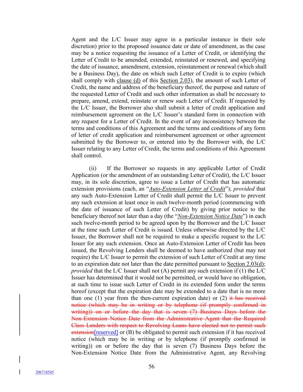 Agent and the L/C Issuer may agree in a particular instance in their sole discretion) prior to the proposed issuance date or date of amendment, as the case may be a notice requesting the issuance of a Letter of Credit, or identifying the Letter of Credit to be amended, extended, reinstated or renewed, and specifying the date of issuance, amendment, extension, reinstatement or renewal (which shall be a Business Day), the date on which such Letter of Credit is to expire (which shall comply with clause (d) of this Section 2.03), the amount of such Letter of Credit, the name and address of the beneficiary thereof, the purpose and nature of the requested Letter of Credit and such other information as shall be necessary to prepare, amend, extend, reinstate or renew such Letter of Credit. If requested by the L/C Issuer, the Borrower also shall submit a letter of credit application and reimbursement agreement on the L/C Issuer’s standard form in connection with any request for a Letter of Credit. In the event of any inconsistency between the terms and conditions of this Agreement and the terms and conditions of any form of letter of credit application and reimbursement agreement or other agreement submitted by the Borrower to, or entered into by the Borrower with, the L/C Issuer relating to any Letter of Credit, the terms and conditions of this Agreement shall control. (ii) If the Borrower so requests in any applicable Letter of Credit Application (or the amendment of an outstanding Letter of Credit), the L/C Issuer may, in its sole discretion, agree to issue a Letter of Credit that has automatic extension provisions (each, an “Auto-Extension Letter of Credit”); provided that any such Auto-Extension Letter of Credit shall permit the L/C Issuer to prevent any such extension at least once in each twelve-month period (commencing with the date of issuance of such Letter of Credit) by giving prior notice to the beneficiary thereof not later than a day (the “Non-Extension Notice Date”) in each such twelve-month period to be agreed upon by the Borrower and the L/C Issuer at the time such Letter of Credit is issued. Unless otherwise directed by the L/C Issuer, the Borrower shall not be required to make a specific request to the L/C Issuer for any such extension. Once an Auto-Extension Letter of Credit has been issued, the Revolving Lenders shall be deemed to have authorized (but may not require) the L/C Issuer to permit the extension of such Letter of Credit at any time to an expiration date not later than the date permitted pursuant to Section 2.03(d); provided that the L/C Issuer shall not (A) permit any such extension if (1) the L/C Issuer has determined that it would not be permitted, or would have no obligation, at such time to issue such Letter of Credit in its extended form under the terms hereof (except that the expiration date may be extended to a date that is no more than one (1) year from the then-current expiration date) or (2) it has received notice (which may be in writing or by telephone (if promptly confirmed in writing)) on or before the day that is seven (7) Business Days before the Non-Extension Notice Date from the Administrative Agent that the Required Class Lenders with respect to Revolving Loans have elected not to permit such extension[reserved] or (B) be obligated to permit such extension if it has received notice (which may be in writing or by telephone (if promptly confirmed in writing)) on or before the day that is seven (7) Business Days before the Non-Extension Notice Date from the Administrative Agent, any Revolving 56 206718545