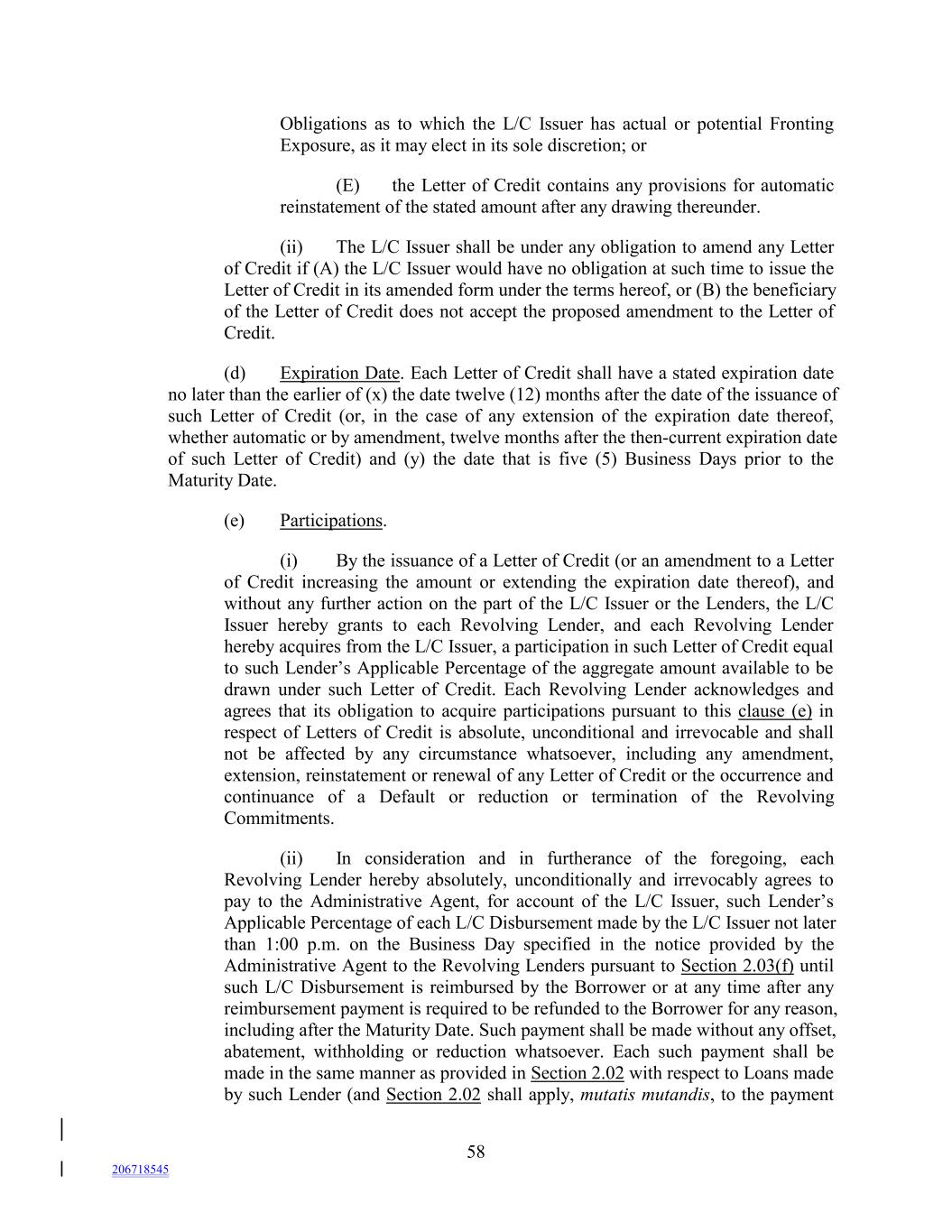 Obligations as to which the L/C Issuer has actual or potential Fronting Exposure, as it may elect in its sole discretion; or (E) the Letter of Credit contains any provisions for automatic reinstatement of the stated amount after any drawing thereunder. (ii) The L/C Issuer shall be under any obligation to amend any Letter of Credit if (A) the L/C Issuer would have no obligation at such time to issue the Letter of Credit in its amended form under the terms hereof, or (B) the beneficiary of the Letter of Credit does not accept the proposed amendment to the Letter of Credit. (d) Expiration Date. Each Letter of Credit shall have a stated expiration date no later than the earlier of (x) the date twelve (12) months after the date of the issuance of such Letter of Credit (or, in the case of any extension of the expiration date thereof, whether automatic or by amendment, twelve months after the then-current expiration date of such Letter of Credit) and (y) the date that is five (5) Business Days prior to the Maturity Date. (e) Participations. (i) By the issuance of a Letter of Credit (or an amendment to a Letter of Credit increasing the amount or extending the expiration date thereof), and without any further action on the part of the L/C Issuer or the Lenders, the L/C Issuer hereby grants to each Revolving Lender, and each Revolving Lender hereby acquires from the L/C Issuer, a participation in such Letter of Credit equal to such Lender’s Applicable Percentage of the aggregate amount available to be drawn under such Letter of Credit. Each Revolving Lender acknowledges and agrees that its obligation to acquire participations pursuant to this clause (e) in respect of Letters of Credit is absolute, unconditional and irrevocable and shall not be affected by any circumstance whatsoever, including any amendment, extension, reinstatement or renewal of any Letter of Credit or the occurrence and continuance of a Default or reduction or termination of the Revolving Commitments. (ii) In consideration and in furtherance of the foregoing, each Revolving Lender hereby absolutely, unconditionally and irrevocably agrees to pay to the Administrative Agent, for account of the L/C Issuer, such Lender’s Applicable Percentage of each L/C Disbursement made by the L/C Issuer not later than 1:00 p.m. on the Business Day specified in the notice provided by the Administrative Agent to the Revolving Lenders pursuant to Section 2.03(f) until such L/C Disbursement is reimbursed by the Borrower or at any time after any reimbursement payment is required to be refunded to the Borrower for any reason, including after the Maturity Date. Such payment shall be made without any offset, abatement, withholding or reduction whatsoever. Each such payment shall be made in the same manner as provided in Section 2.02 with respect to Loans made by such Lender (and Section 2.02 shall apply, mutatis mutandis, to the payment 58 206718545
