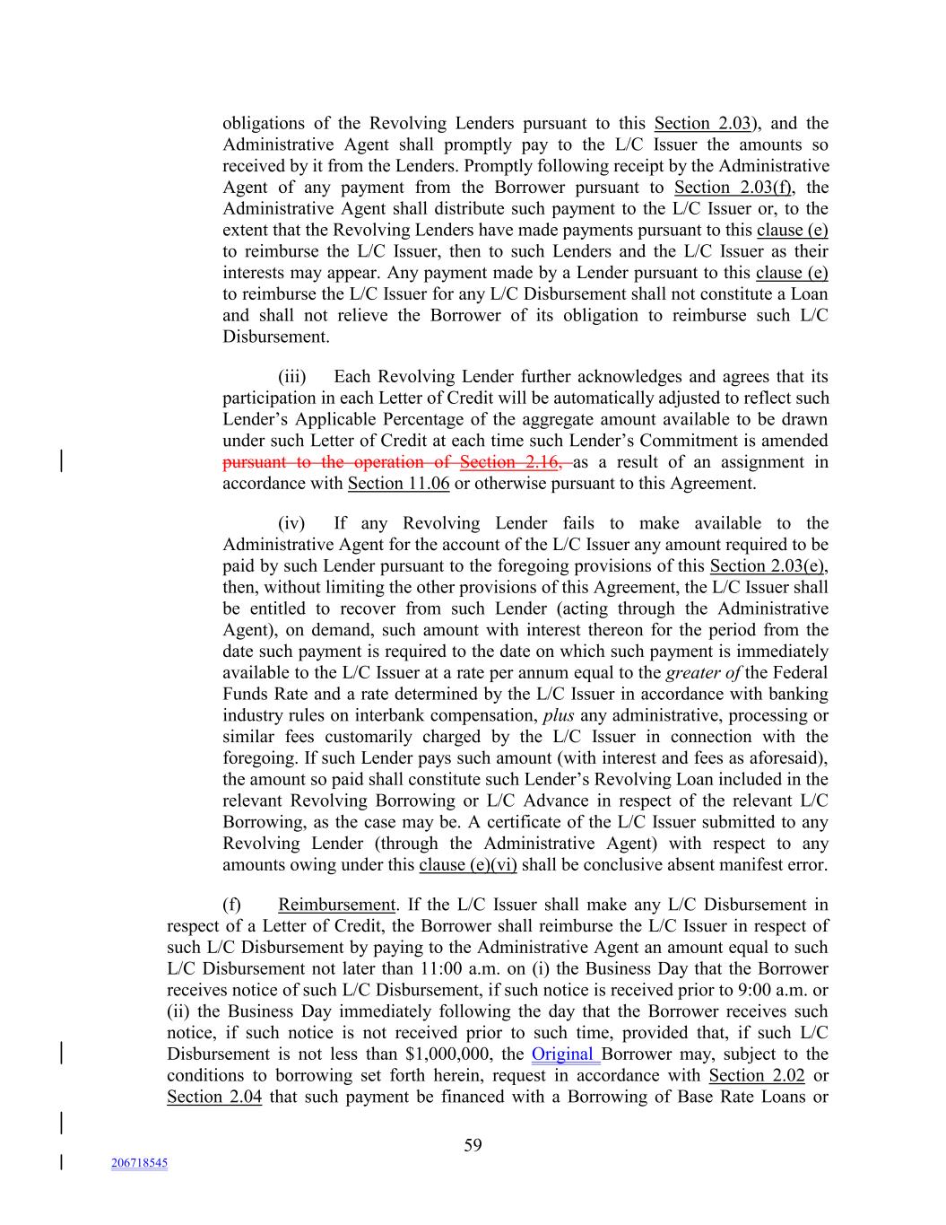 obligations of the Revolving Lenders pursuant to this Section 2.03), and the Administrative Agent shall promptly pay to the L/C Issuer the amounts so received by it from the Lenders. Promptly following receipt by the Administrative Agent of any payment from the Borrower pursuant to Section 2.03(f), the Administrative Agent shall distribute such payment to the L/C Issuer or, to the extent that the Revolving Lenders have made payments pursuant to this clause (e) to reimburse the L/C Issuer, then to such Lenders and the L/C Issuer as their interests may appear. Any payment made by a Lender pursuant to this clause (e) to reimburse the L/C Issuer for any L/C Disbursement shall not constitute a Loan and shall not relieve the Borrower of its obligation to reimburse such L/C Disbursement. (iii) Each Revolving Lender further acknowledges and agrees that its participation in each Letter of Credit will be automatically adjusted to reflect such Lender’s Applicable Percentage of the aggregate amount available to be drawn under such Letter of Credit at each time such Lender’s Commitment is amended pursuant to the operation of Section 2.16, as a result of an assignment in accordance with Section 11.06 or otherwise pursuant to this Agreement. (iv) If any Revolving Lender fails to make available to the Administrative Agent for the account of the L/C Issuer any amount required to be paid by such Lender pursuant to the foregoing provisions of this Section 2.03(e), then, without limiting the other provisions of this Agreement, the L/C Issuer shall be entitled to recover from such Lender (acting through the Administrative Agent), on demand, such amount with interest thereon for the period from the date such payment is required to the date on which such payment is immediately available to the L/C Issuer at a rate per annum equal to the greater of the Federal Funds Rate and a rate determined by the L/C Issuer in accordance with banking industry rules on interbank compensation, plus any administrative, processing or similar fees customarily charged by the L/C Issuer in connection with the foregoing. If such Lender pays such amount (with interest and fees as aforesaid), the amount so paid shall constitute such Lender’s Revolving Loan included in the relevant Revolving Borrowing or L/C Advance in respect of the relevant L/C Borrowing, as the case may be. A certificate of the L/C Issuer submitted to any Revolving Lender (through the Administrative Agent) with respect to any amounts owing under this clause (e)(vi) shall be conclusive absent manifest error. (f) Reimbursement. If the L/C Issuer shall make any L/C Disbursement in respect of a Letter of Credit, the Borrower shall reimburse the L/C Issuer in respect of such L/C Disbursement by paying to the Administrative Agent an amount equal to such L/C Disbursement not later than 11:00 a.m. on (i) the Business Day that the Borrower receives notice of such L/C Disbursement, if such notice is received prior to 9:00 a.m. or (ii) the Business Day immediately following the day that the Borrower receives such notice, if such notice is not received prior to such time, provided that, if such L/C Disbursement is not less than $1,000,000, the Original Borrower may, subject to the conditions to borrowing set forth herein, request in accordance with Section 2.02 or Section 2.04 that such payment be financed with a Borrowing of Base Rate Loans or 59 206718545