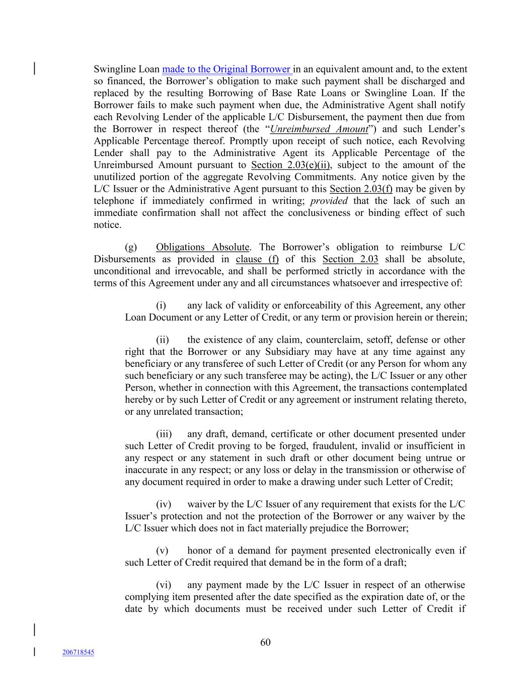 Swingline Loan made to the Original Borrower in an equivalent amount and, to the extent so financed, the Borrower’s obligation to make such payment shall be discharged and replaced by the resulting Borrowing of Base Rate Loans or Swingline Loan. If the Borrower fails to make such payment when due, the Administrative Agent shall notify each Revolving Lender of the applicable L/C Disbursement, the payment then due from the Borrower in respect thereof (the “Unreimbursed Amount”) and such Lender’s Applicable Percentage thereof. Promptly upon receipt of such notice, each Revolving Lender shall pay to the Administrative Agent its Applicable Percentage of the Unreimbursed Amount pursuant to Section 2.03(e)(ii), subject to the amount of the unutilized portion of the aggregate Revolving Commitments. Any notice given by the L/C Issuer or the Administrative Agent pursuant to this Section 2.03(f) may be given by telephone if immediately confirmed in writing; provided that the lack of such an immediate confirmation shall not affect the conclusiveness or binding effect of such notice. (g) Obligations Absolute. The Borrower’s obligation to reimburse L/C Disbursements as provided in clause (f) of this Section 2.03 shall be absolute, unconditional and irrevocable, and shall be performed strictly in accordance with the terms of this Agreement under any and all circumstances whatsoever and irrespective of: (i) any lack of validity or enforceability of this Agreement, any other Loan Document or any Letter of Credit, or any term or provision herein or therein; (ii) the existence of any claim, counterclaim, setoff, defense or other right that the Borrower or any Subsidiary may have at any time against any beneficiary or any transferee of such Letter of Credit (or any Person for whom any such beneficiary or any such transferee may be acting), the L/C Issuer or any other Person, whether in connection with this Agreement, the transactions contemplated hereby or by such Letter of Credit or any agreement or instrument relating thereto, or any unrelated transaction; (iii) any draft, demand, certificate or other document presented under such Letter of Credit proving to be forged, fraudulent, invalid or insufficient in any respect or any statement in such draft or other document being untrue or inaccurate in any respect; or any loss or delay in the transmission or otherwise of any document required in order to make a drawing under such Letter of Credit; (iv) waiver by the L/C Issuer of any requirement that exists for the L/C Issuer’s protection and not the protection of the Borrower or any waiver by the L/C Issuer which does not in fact materially prejudice the Borrower; (v) honor of a demand for payment presented electronically even if such Letter of Credit required that demand be in the form of a draft; (vi) any payment made by the L/C Issuer in respect of an otherwise complying item presented after the date specified as the expiration date of, or the date by which documents must be received under such Letter of Credit if 60 206718545