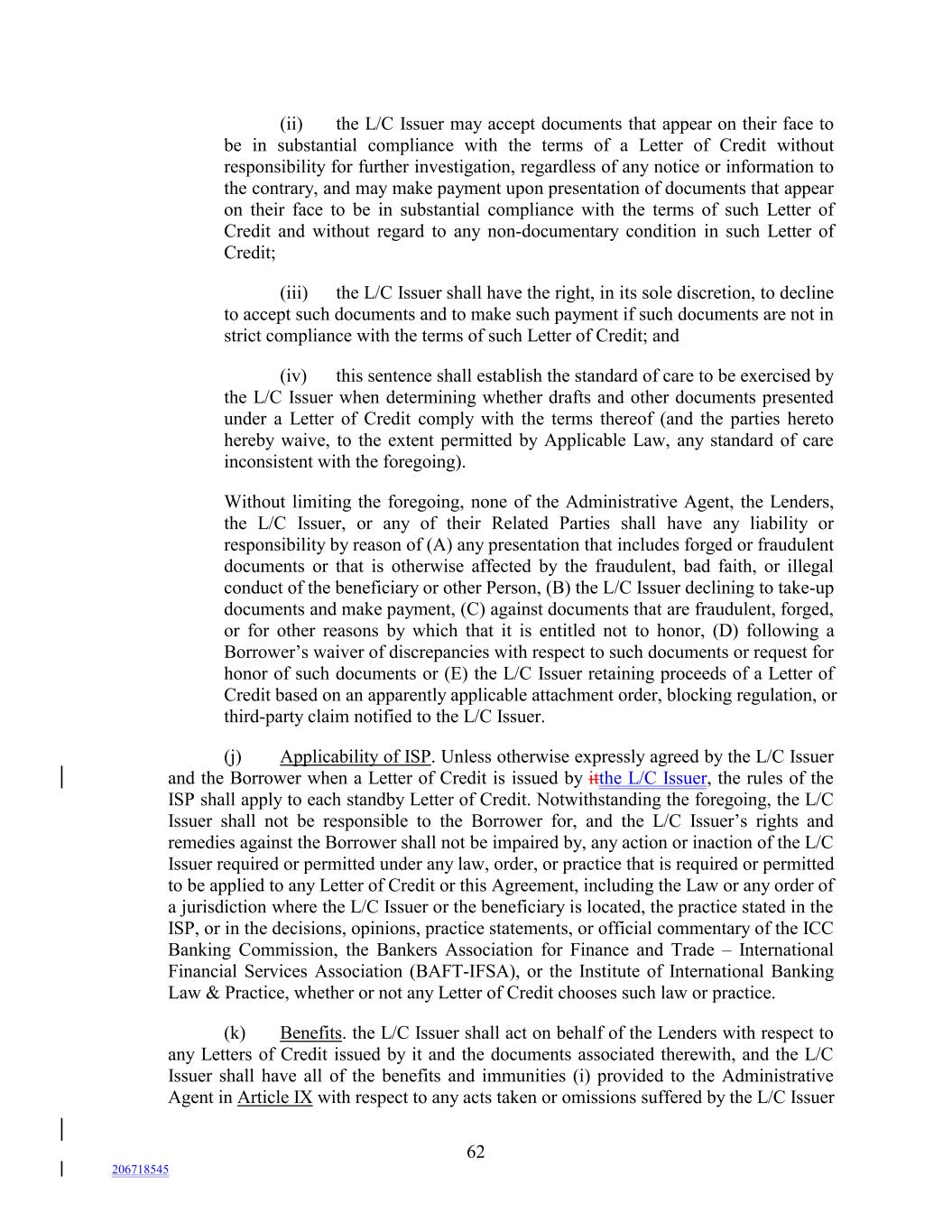 (ii) the L/C Issuer may accept documents that appear on their face to be in substantial compliance with the terms of a Letter of Credit without responsibility for further investigation, regardless of any notice or information to the contrary, and may make payment upon presentation of documents that appear on their face to be in substantial compliance with the terms of such Letter of Credit and without regard to any non-documentary condition in such Letter of Credit; (iii) the L/C Issuer shall have the right, in its sole discretion, to decline to accept such documents and to make such payment if such documents are not in strict compliance with the terms of such Letter of Credit; and (iv) this sentence shall establish the standard of care to be exercised by the L/C Issuer when determining whether drafts and other documents presented under a Letter of Credit comply with the terms thereof (and the parties hereto hereby waive, to the extent permitted by Applicable Law, any standard of care inconsistent with the foregoing). Without limiting the foregoing, none of the Administrative Agent, the Lenders, the L/C Issuer, or any of their Related Parties shall have any liability or responsibility by reason of (A) any presentation that includes forged or fraudulent documents or that is otherwise affected by the fraudulent, bad faith, or illegal conduct of the beneficiary or other Person, (B) the L/C Issuer declining to take-up documents and make payment, (C) against documents that are fraudulent, forged, or for other reasons by which that it is entitled not to honor, (D) following a Borrower’s waiver of discrepancies with respect to such documents or request for honor of such documents or (E) the L/C Issuer retaining proceeds of a Letter of Credit based on an apparently applicable attachment order, blocking regulation, or third-party claim notified to the L/C Issuer. (j) Applicability of ISP. Unless otherwise expressly agreed by the L/C Issuer and the Borrower when a Letter of Credit is issued by itthe L/C Issuer, the rules of the ISP shall apply to each standby Letter of Credit. Notwithstanding the foregoing, the L/C Issuer shall not be responsible to the Borrower for, and the L/C Issuer’s rights and remedies against the Borrower shall not be impaired by, any action or inaction of the L/C Issuer required or permitted under any law, order, or practice that is required or permitted to be applied to any Letter of Credit or this Agreement, including the Law or any order of a jurisdiction where the L/C Issuer or the beneficiary is located, the practice stated in the ISP, or in the decisions, opinions, practice statements, or official commentary of the ICC Banking Commission, the Bankers Association for Finance and Trade – International Financial Services Association (BAFT-IFSA), or the Institute of International Banking Law & Practice, whether or not any Letter of Credit chooses such law or practice. (k) Benefits. the L/C Issuer shall act on behalf of the Lenders with respect to any Letters of Credit issued by it and the documents associated therewith, and the L/C Issuer shall have all of the benefits and immunities (i) provided to the Administrative Agent in Article IX with respect to any acts taken or omissions suffered by the L/C Issuer 62 206718545