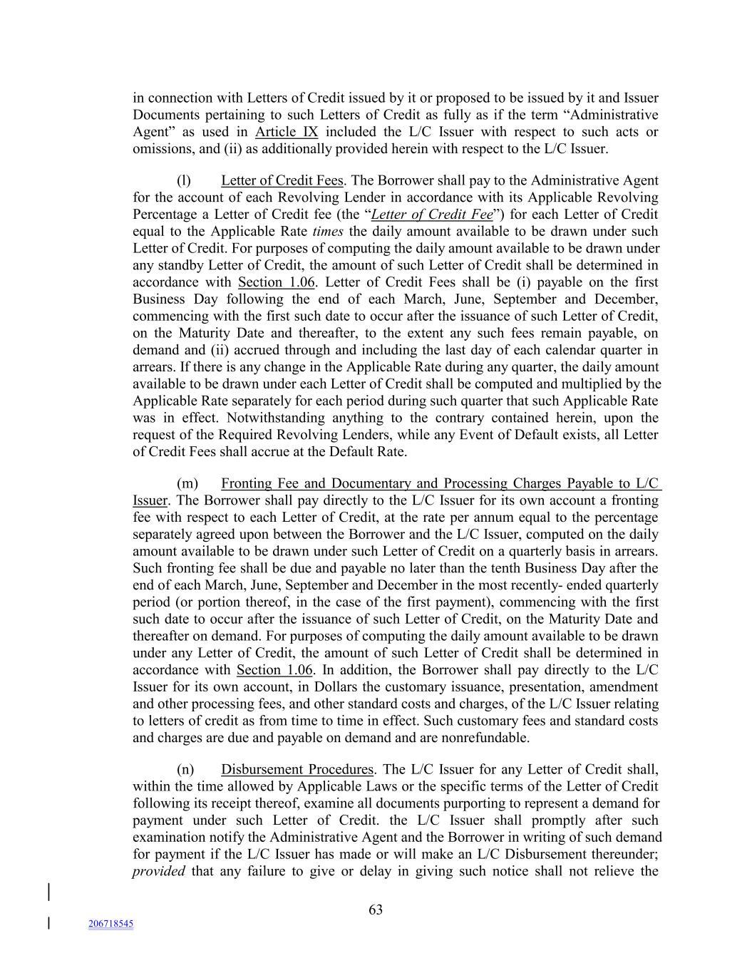 in connection with Letters of Credit issued by it or proposed to be issued by it and Issuer Documents pertaining to such Letters of Credit as fully as if the term “Administrative Agent” as used in Article IX included the L/C Issuer with respect to such acts or omissions, and (ii) as additionally provided herein with respect to the L/C Issuer. (l) Letter of Credit Fees. The Borrower shall pay to the Administrative Agent for the account of each Revolving Lender in accordance with its Applicable Revolving Percentage a Letter of Credit fee (the “Letter of Credit Fee”) for each Letter of Credit equal to the Applicable Rate times the daily amount available to be drawn under such Letter of Credit. For purposes of computing the daily amount available to be drawn under any standby Letter of Credit, the amount of such Letter of Credit shall be determined in accordance with Section 1.06. Letter of Credit Fees shall be (i) payable on the first Business Day following the end of each March, June, September and December, commencing with the first such date to occur after the issuance of such Letter of Credit, on the Maturity Date and thereafter, to the extent any such fees remain payable, on demand and (ii) accrued through and including the last day of each calendar quarter in arrears. If there is any change in the Applicable Rate during any quarter, the daily amount available to be drawn under each Letter of Credit shall be computed and multiplied by the Applicable Rate separately for each period during such quarter that such Applicable Rate was in effect. Notwithstanding anything to the contrary contained herein, upon the request of the Required Revolving Lenders, while any Event of Default exists, all Letter of Credit Fees shall accrue at the Default Rate. (m) Fronting Fee and Documentary and Processing Charges Payable to L/C Issuer. The Borrower shall pay directly to the L/C Issuer for its own account a fronting fee with respect to each Letter of Credit, at the rate per annum equal to the percentage separately agreed upon between the Borrower and the L/C Issuer, computed on the daily amount available to be drawn under such Letter of Credit on a quarterly basis in arrears. Such fronting fee shall be due and payable no later than the tenth Business Day after the end of each March, June, September and December in the most recently- ended quarterly period (or portion thereof, in the case of the first payment), commencing with the first such date to occur after the issuance of such Letter of Credit, on the Maturity Date and thereafter on demand. For purposes of computing the daily amount available to be drawn under any Letter of Credit, the amount of such Letter of Credit shall be determined in accordance with Section 1.06. In addition, the Borrower shall pay directly to the L/C Issuer for its own account, in Dollars the customary issuance, presentation, amendment and other processing fees, and other standard costs and charges, of the L/C Issuer relating to letters of credit as from time to time in effect. Such customary fees and standard costs and charges are due and payable on demand and are nonrefundable. (n) Disbursement Procedures. The L/C Issuer for any Letter of Credit shall, within the time allowed by Applicable Laws or the specific terms of the Letter of Credit following its receipt thereof, examine all documents purporting to represent a demand for payment under such Letter of Credit. the L/C Issuer shall promptly after such examination notify the Administrative Agent and the Borrower in writing of such demand for payment if the L/C Issuer has made or will make an L/C Disbursement thereunder; provided that any failure to give or delay in giving such notice shall not relieve the 63 206718545