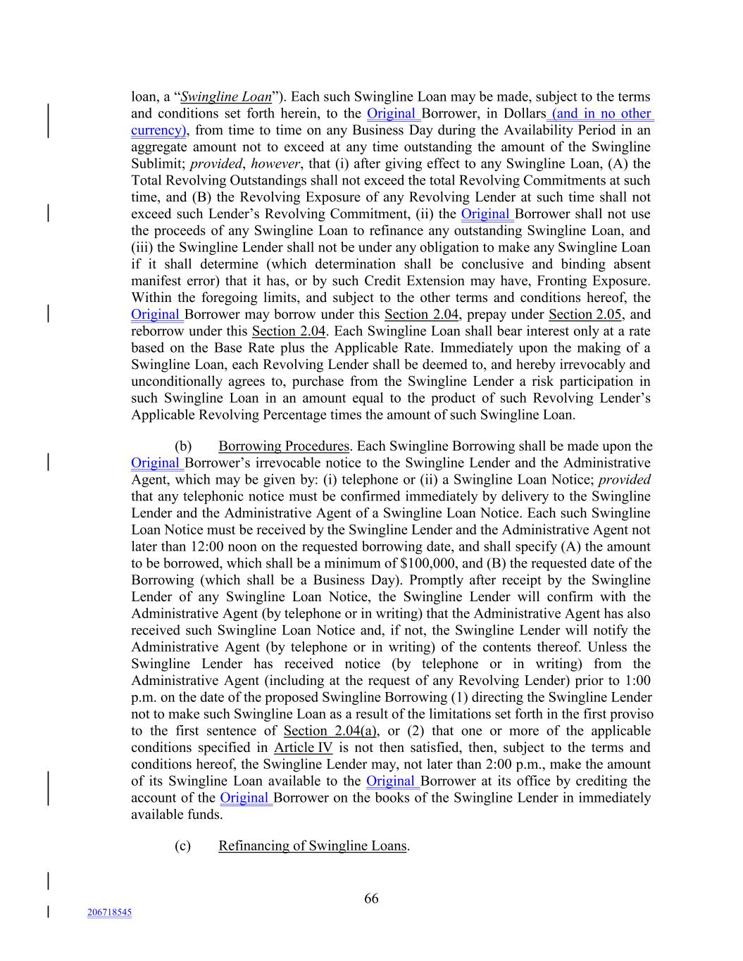 loan, a “Swingline Loan”). Each such Swingline Loan may be made, subject to the terms and conditions set forth herein, to the Original Borrower, in Dollars (and in no other currency), from time to time on any Business Day during the Availability Period in an aggregate amount not to exceed at any time outstanding the amount of the Swingline Sublimit; provided, however, that (i) after giving effect to any Swingline Loan, (A) the Total Revolving Outstandings shall not exceed the total Revolving Commitments at such time, and (B) the Revolving Exposure of any Revolving Lender at such time shall not exceed such Lender’s Revolving Commitment, (ii) the Original Borrower shall not use the proceeds of any Swingline Loan to refinance any outstanding Swingline Loan, and (iii) the Swingline Lender shall not be under any obligation to make any Swingline Loan if it shall determine (which determination shall be conclusive and binding absent manifest error) that it has, or by such Credit Extension may have, Fronting Exposure. Within the foregoing limits, and subject to the other terms and conditions hereof, the Original Borrower may borrow under this Section 2.04, prepay under Section 2.05, and reborrow under this Section 2.04. Each Swingline Loan shall bear interest only at a rate based on the Base Rate plus the Applicable Rate. Immediately upon the making of a Swingline Loan, each Revolving Lender shall be deemed to, and hereby irrevocably and unconditionally agrees to, purchase from the Swingline Lender a risk participation in such Swingline Loan in an amount equal to the product of such Revolving Lender’s Applicable Revolving Percentage times the amount of such Swingline Loan. (b) Borrowing Procedures. Each Swingline Borrowing shall be made upon the Original Borrower’s irrevocable notice to the Swingline Lender and the Administrative Agent, which may be given by: (i) telephone or (ii) a Swingline Loan Notice; provided that any telephonic notice must be confirmed immediately by delivery to the Swingline Lender and the Administrative Agent of a Swingline Loan Notice. Each such Swingline Loan Notice must be received by the Swingline Lender and the Administrative Agent not later than 12:00 noon on the requested borrowing date, and shall specify (A) the amount to be borrowed, which shall be a minimum of $100,000, and (B) the requested date of the Borrowing (which shall be a Business Day). Promptly after receipt by the Swingline Lender of any Swingline Loan Notice, the Swingline Lender will confirm with the Administrative Agent (by telephone or in writing) that the Administrative Agent has also received such Swingline Loan Notice and, if not, the Swingline Lender will notify the Administrative Agent (by telephone or in writing) of the contents thereof. Unless the Swingline Lender has received notice (by telephone or in writing) from the Administrative Agent (including at the request of any Revolving Lender) prior to 1:00 p.m. on the date of the proposed Swingline Borrowing (1) directing the Swingline Lender not to make such Swingline Loan as a result of the limitations set forth in the first proviso to the first sentence of Section 2.04(a), or (2) that one or more of the applicable conditions specified in Article IV is not then satisfied, then, subject to the terms and conditions hereof, the Swingline Lender may, not later than 2:00 p.m., make the amount of its Swingline Loan available to the Original Borrower at its office by crediting the account of the Original Borrower on the books of the Swingline Lender in immediately available funds. (c) Refinancing of Swingline Loans. 66 206718545
