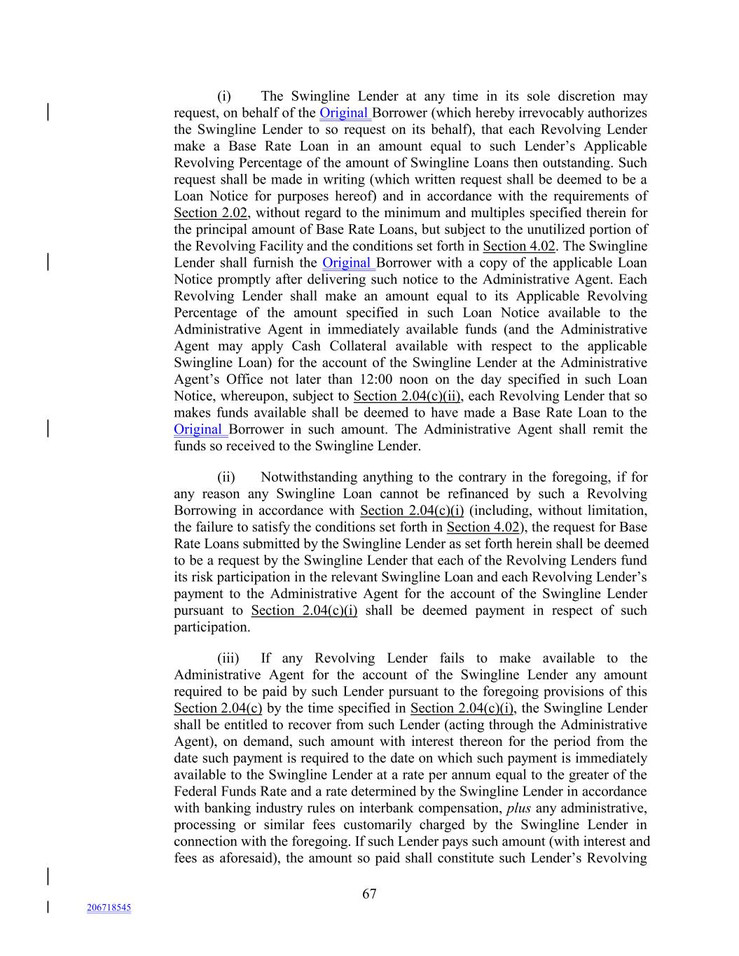 (i) The Swingline Lender at any time in its sole discretion may request, on behalf of the Original Borrower (which hereby irrevocably authorizes the Swingline Lender to so request on its behalf), that each Revolving Lender make a Base Rate Loan in an amount equal to such Lender’s Applicable Revolving Percentage of the amount of Swingline Loans then outstanding. Such request shall be made in writing (which written request shall be deemed to be a Loan Notice for purposes hereof) and in accordance with the requirements of Section 2.02, without regard to the minimum and multiples specified therein for the principal amount of Base Rate Loans, but subject to the unutilized portion of the Revolving Facility and the conditions set forth in Section 4.02. The Swingline Lender shall furnish the Original Borrower with a copy of the applicable Loan Notice promptly after delivering such notice to the Administrative Agent. Each Revolving Lender shall make an amount equal to its Applicable Revolving Percentage of the amount specified in such Loan Notice available to the Administrative Agent in immediately available funds (and the Administrative Agent may apply Cash Collateral available with respect to the applicable Swingline Loan) for the account of the Swingline Lender at the Administrative Agent’s Office not later than 12:00 noon on the day specified in such Loan Notice, whereupon, subject to Section 2.04(c)(ii), each Revolving Lender that so makes funds available shall be deemed to have made a Base Rate Loan to the Original Borrower in such amount. The Administrative Agent shall remit the funds so received to the Swingline Lender. (ii) Notwithstanding anything to the contrary in the foregoing, if for any reason any Swingline Loan cannot be refinanced by such a Revolving Borrowing in accordance with Section 2.04(c)(i) (including, without limitation, the failure to satisfy the conditions set forth in Section 4.02), the request for Base Rate Loans submitted by the Swingline Lender as set forth herein shall be deemed to be a request by the Swingline Lender that each of the Revolving Lenders fund its risk participation in the relevant Swingline Loan and each Revolving Lender’s payment to the Administrative Agent for the account of the Swingline Lender pursuant to Section 2.04(c)(i) shall be deemed payment in respect of such participation. (iii) If any Revolving Lender fails to make available to the Administrative Agent for the account of the Swingline Lender any amount required to be paid by such Lender pursuant to the foregoing provisions of this Section 2.04(c) by the time specified in Section 2.04(c)(i), the Swingline Lender shall be entitled to recover from such Lender (acting through the Administrative Agent), on demand, such amount with interest thereon for the period from the date such payment is required to the date on which such payment is immediately available to the Swingline Lender at a rate per annum equal to the greater of the Federal Funds Rate and a rate determined by the Swingline Lender in accordance with banking industry rules on interbank compensation, plus any administrative, processing or similar fees customarily charged by the Swingline Lender in connection with the foregoing. If such Lender pays such amount (with interest and fees as aforesaid), the amount so paid shall constitute such Lender’s Revolving 67 206718545